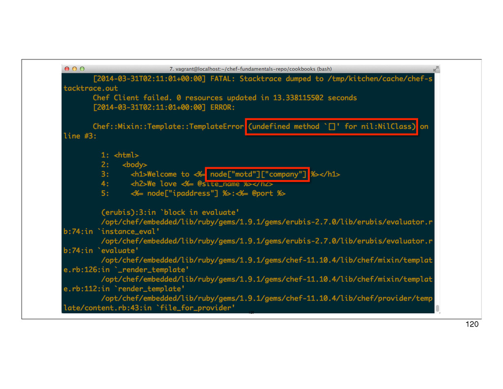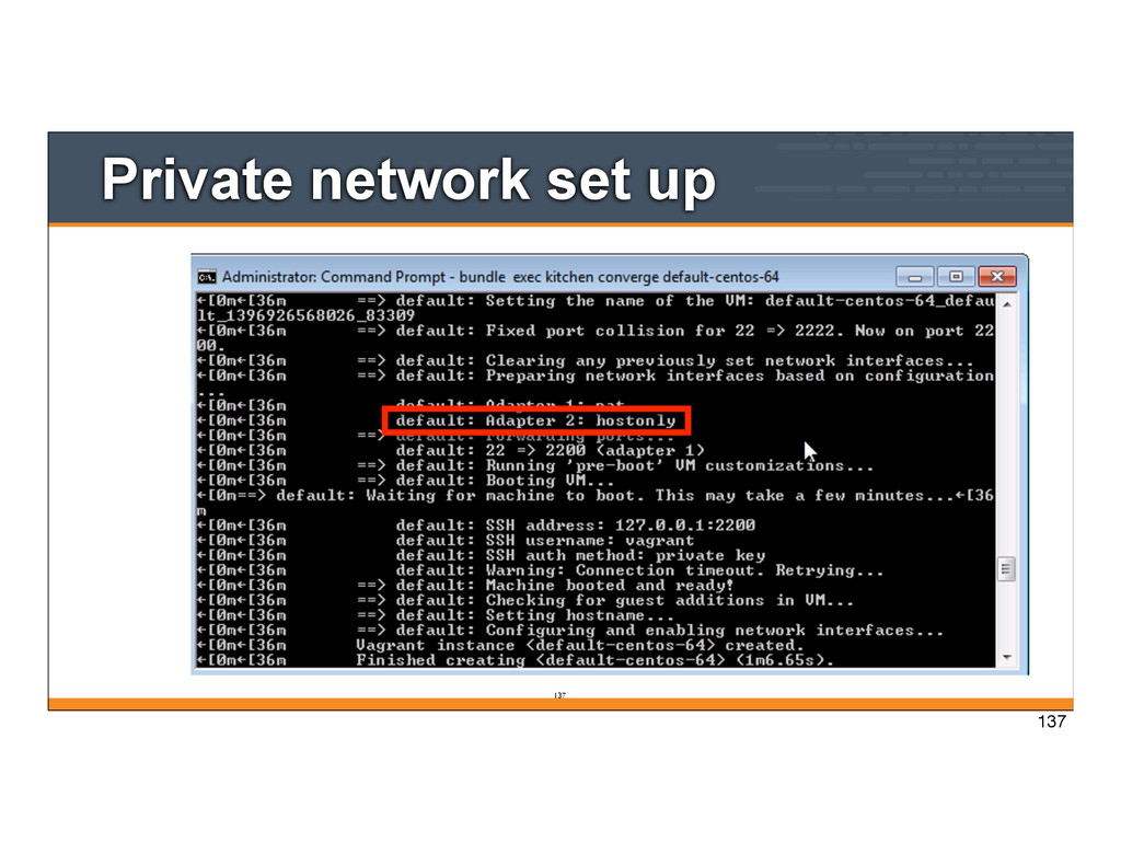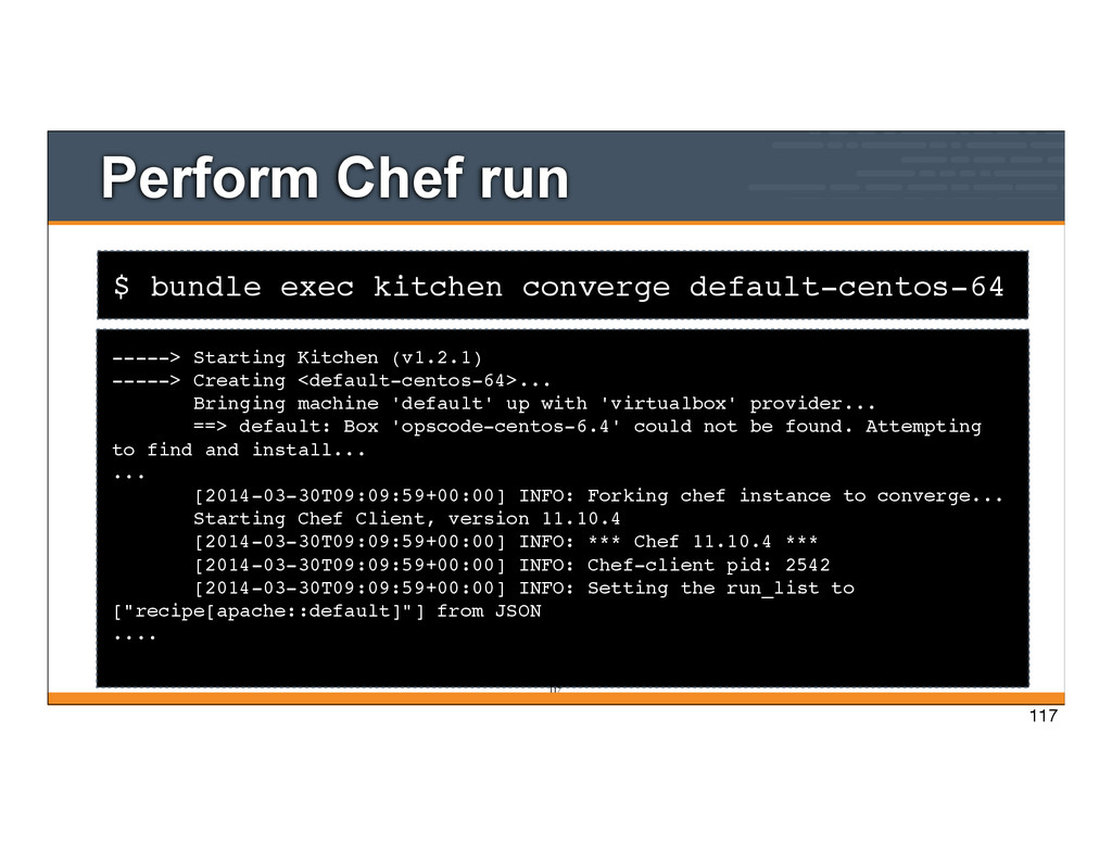 Starting Kitchen (v1.2.1) -----> Creating <default-centos-64>... Bringing machine 'default' up with 'virtualbox' provider... ==> default: Box 'opscode-centos-6.4' could not be found. Attempting to find and install... ... [2014-03-30T09:09:59+00:00] INFO: Forking chef instance to converge... Starting Chef Client, version 11.10.4 [2014-03-30T09:09:59+00:00] INFO: *** Chef 11.10.4 *** [2014-03-30T09:09:59+00:00] INFO: Chef-client pid: 2542 [2014-03-30T09:09:59+00:00] INFO: Setting the run_list to ["recipe[apache::default]"] from JSON .... 117 117