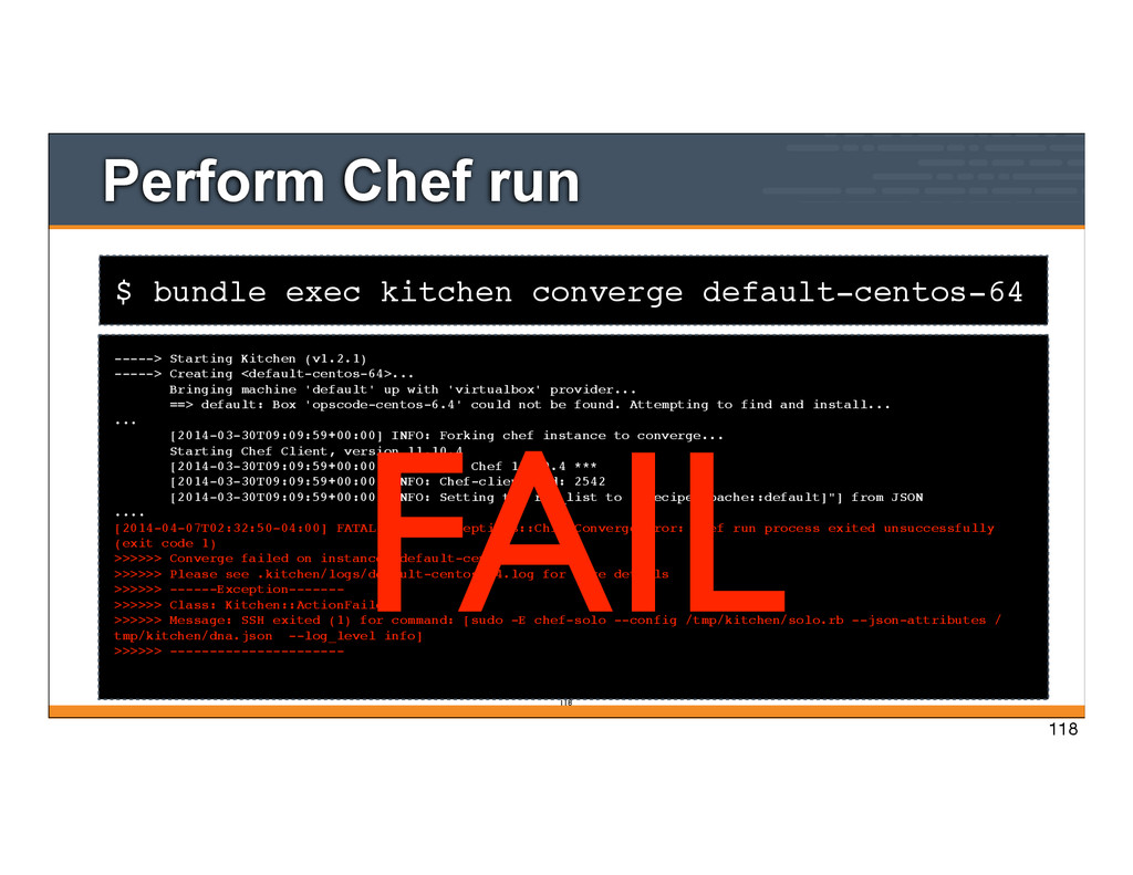 Starting Kitchen (v1.2.1) -----> Creating <default-centos-64>... Bringing machine 'default' up with 'virtualbox' provider... ==> default: Box 'opscode-centos-6.4' could not be found. Attempting to find and install... ... [2014-03-30T09:09:59+00:00] INFO: Forking chef instance to converge... Starting Chef Client, version 11.10.4 [2014-03-30T09:09:59+00:00] INFO: *** Chef 11.10.4 *** [2014-03-30T09:09:59+00:00] INFO: Chef-client pid: 2542 [2014-03-30T09:09:59+00:00] INFO: Setting the run_list to ["recipe[apache::default]"] from JSON .... [2014-04-07T02:32:50-04:00] FATAL: Chef::Exceptions::ChildConvergeError: Chef run process exited unsuccessfully (exit code 1) >>>>>> Converge failed on instance <default-centos-64>. >>>>>> Please see .kitchen/logs/default-centos-64.log for more details >>>>>> ------Exception------- >>>>>> Class: Kitchen::ActionFailed >>>>>> Message: SSH exited (1) for command: [sudo -E chef-solo --config /tmp/kitchen/solo.rb --json-attributes / tmp/kitchen/dna.json --log_level info] >>>>>> ---------------------- 118 FAIL 118