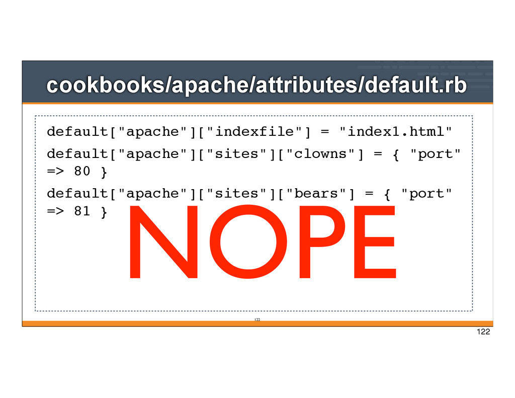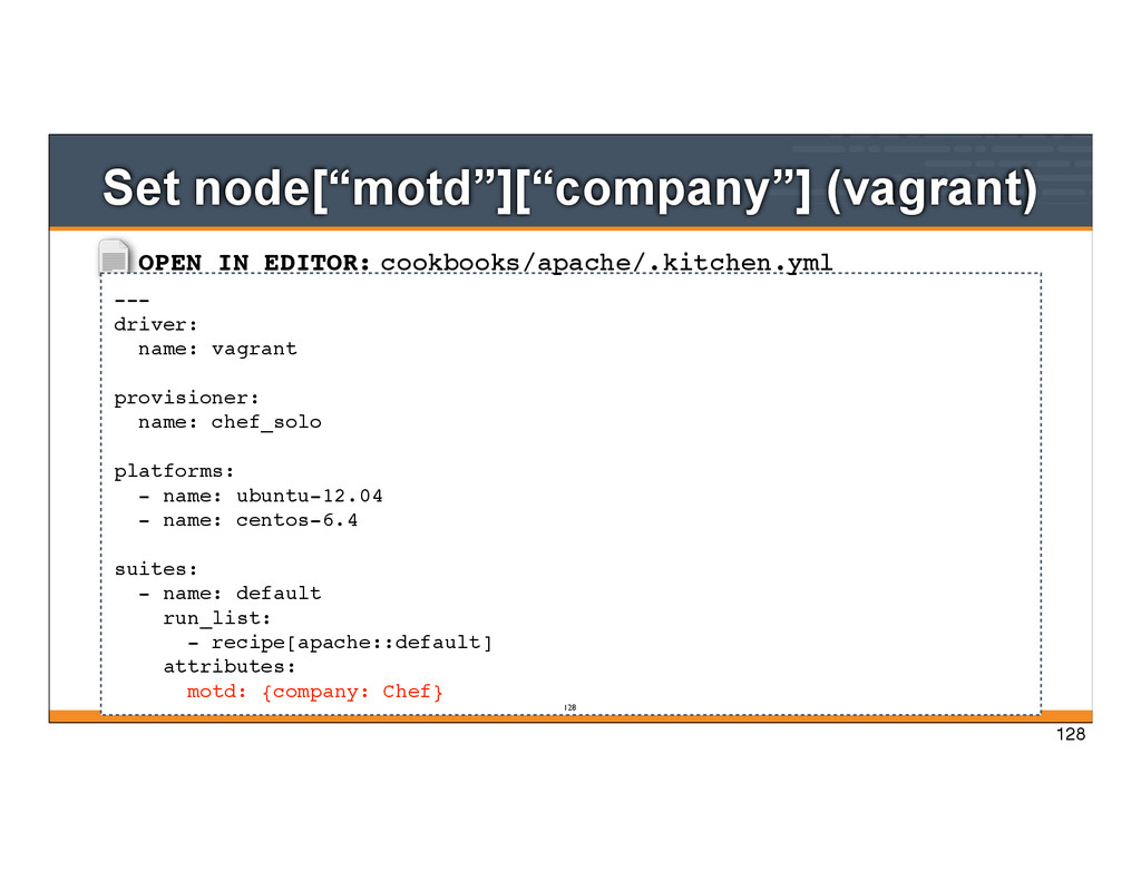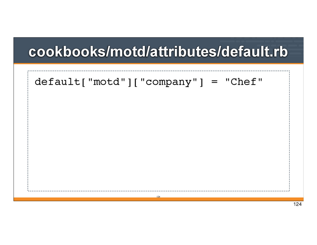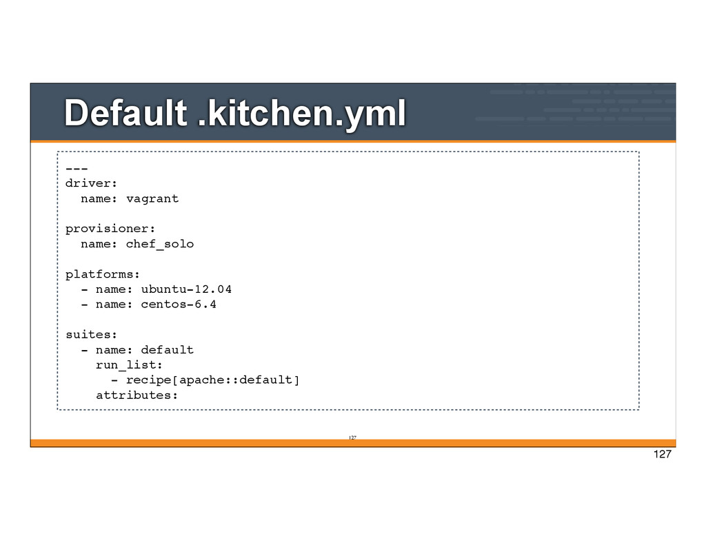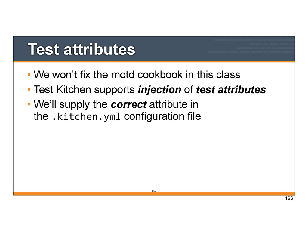 • They set reasonable defaults for all attributes used • Test Kitchen is designed to run a cookbook in isolation to give you feedback on attribute use 125 125