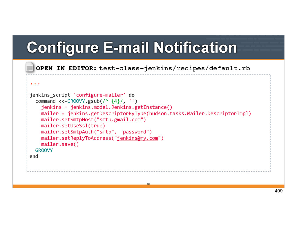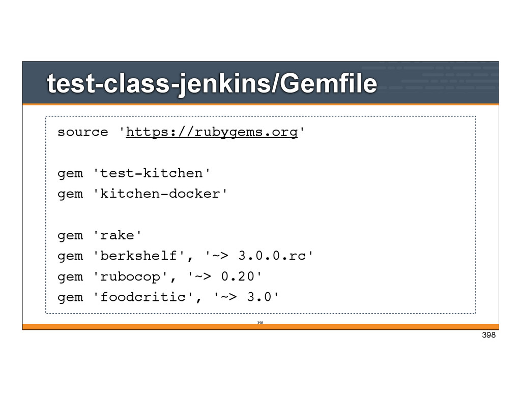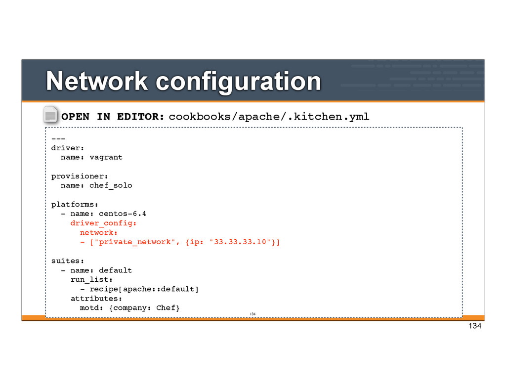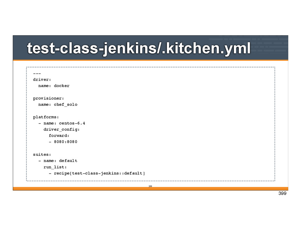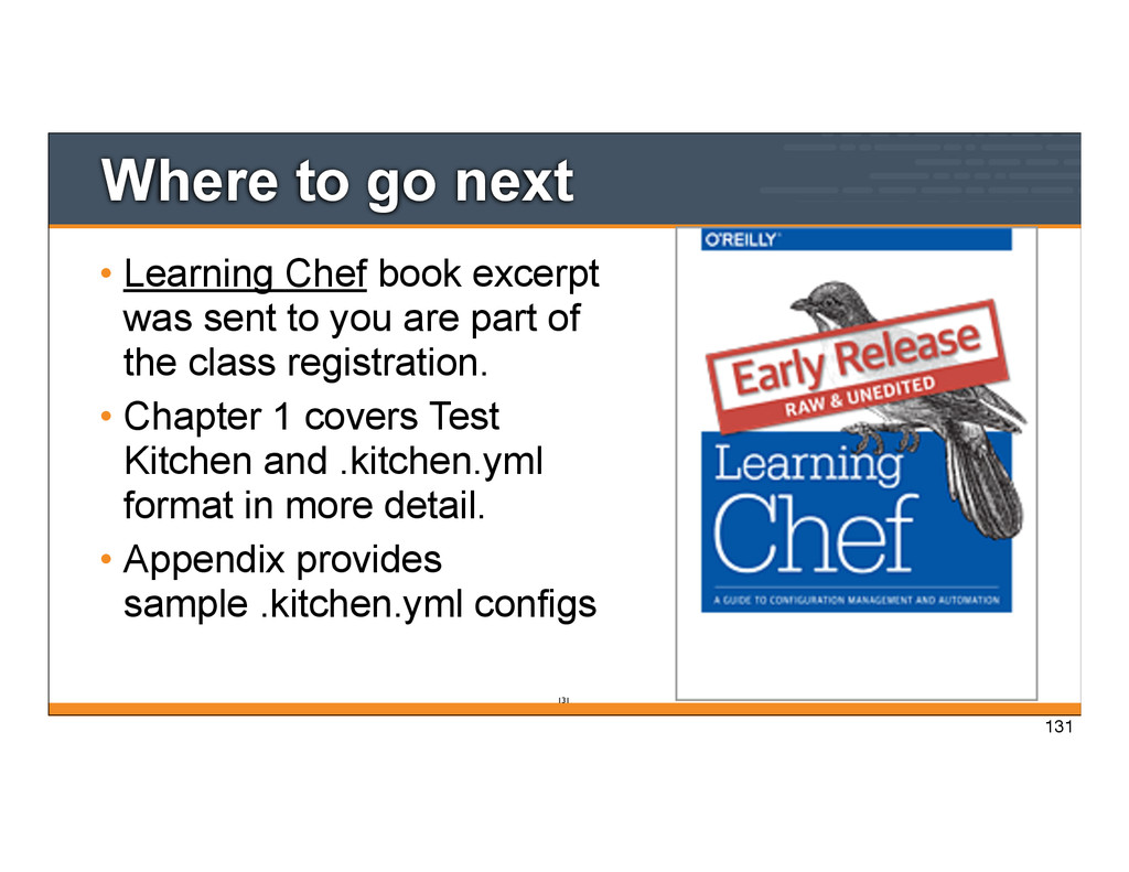 sent to you are part of the class registration. • Chapter 1 covers Test Kitchen and .kitchen.yml format in more detail. • Appendix provides sample .kitchen.yml configs 131 131