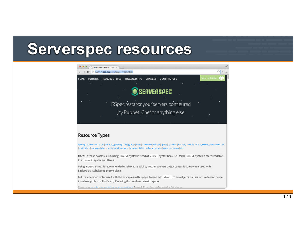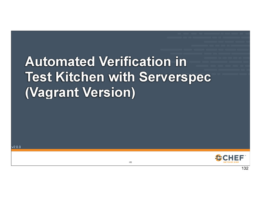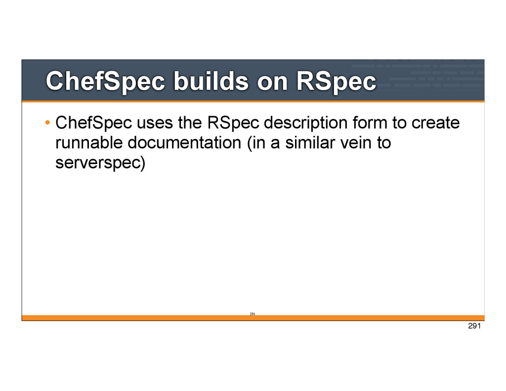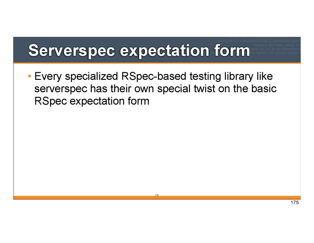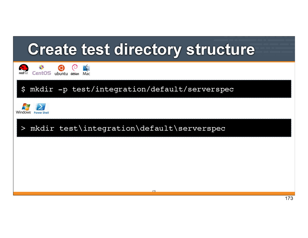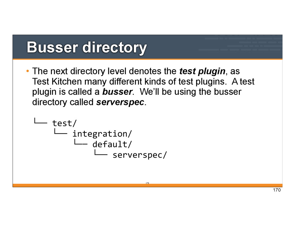 test plugin, as Test Kitchen many different kinds of test plugins. A test plugin is called a busser. We’ll be using the busser directory called serverspec. └── test/ └── integration/ └── default/ └── serverspec/ 170