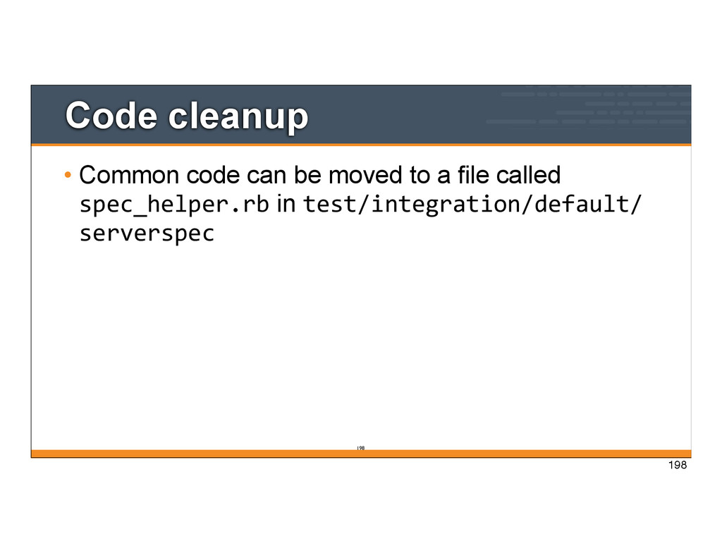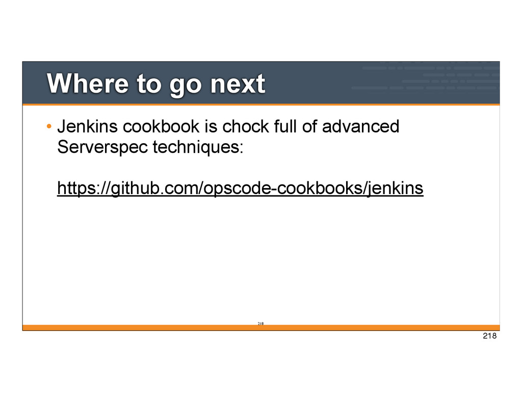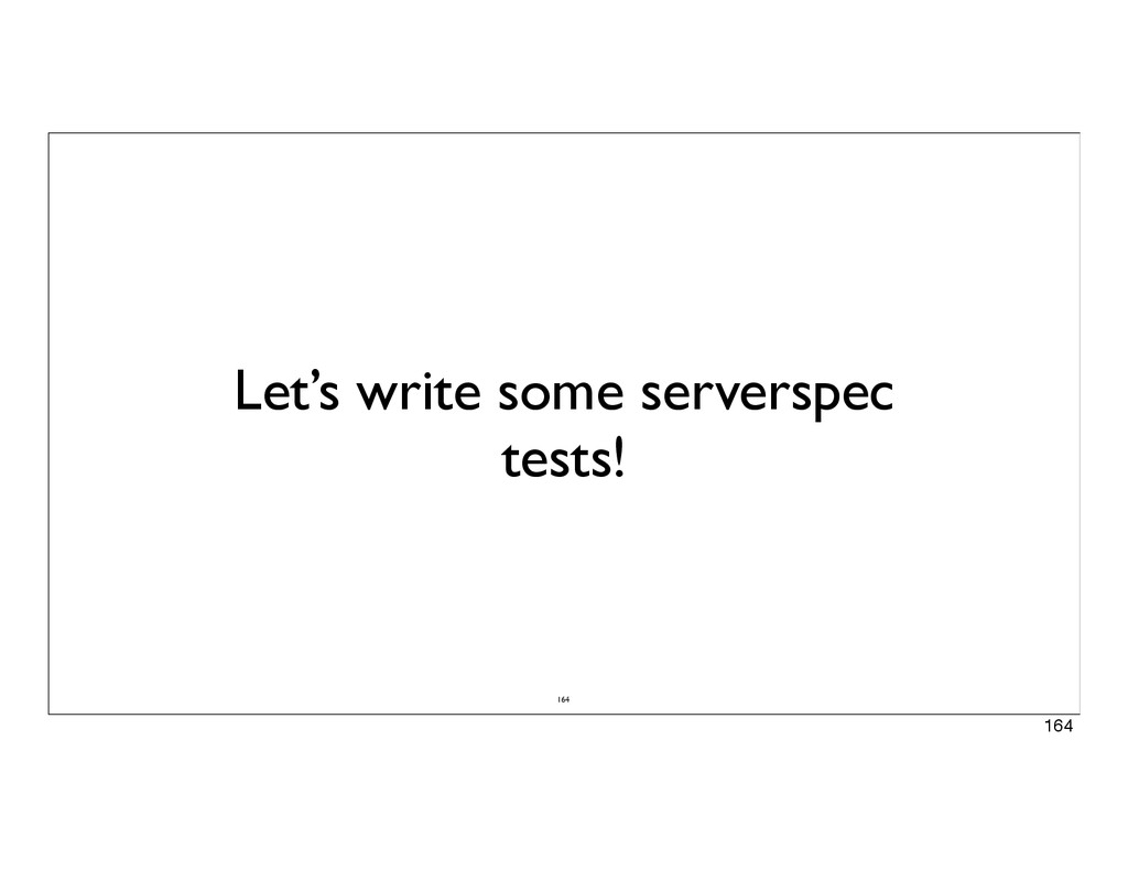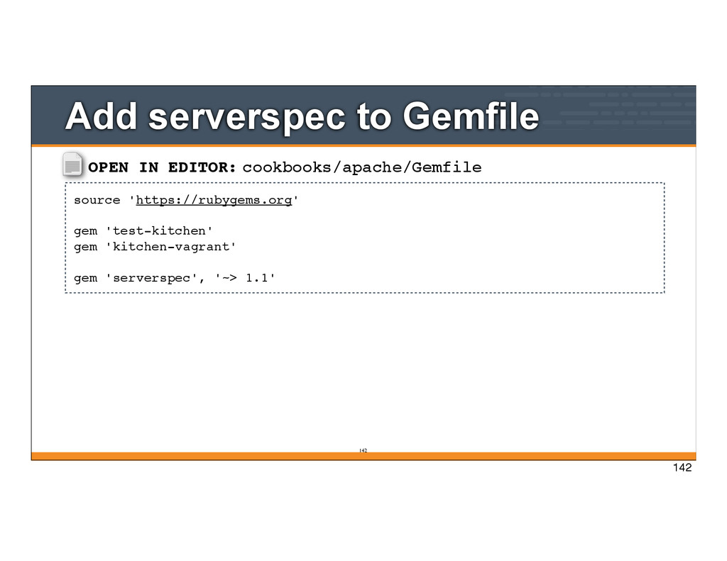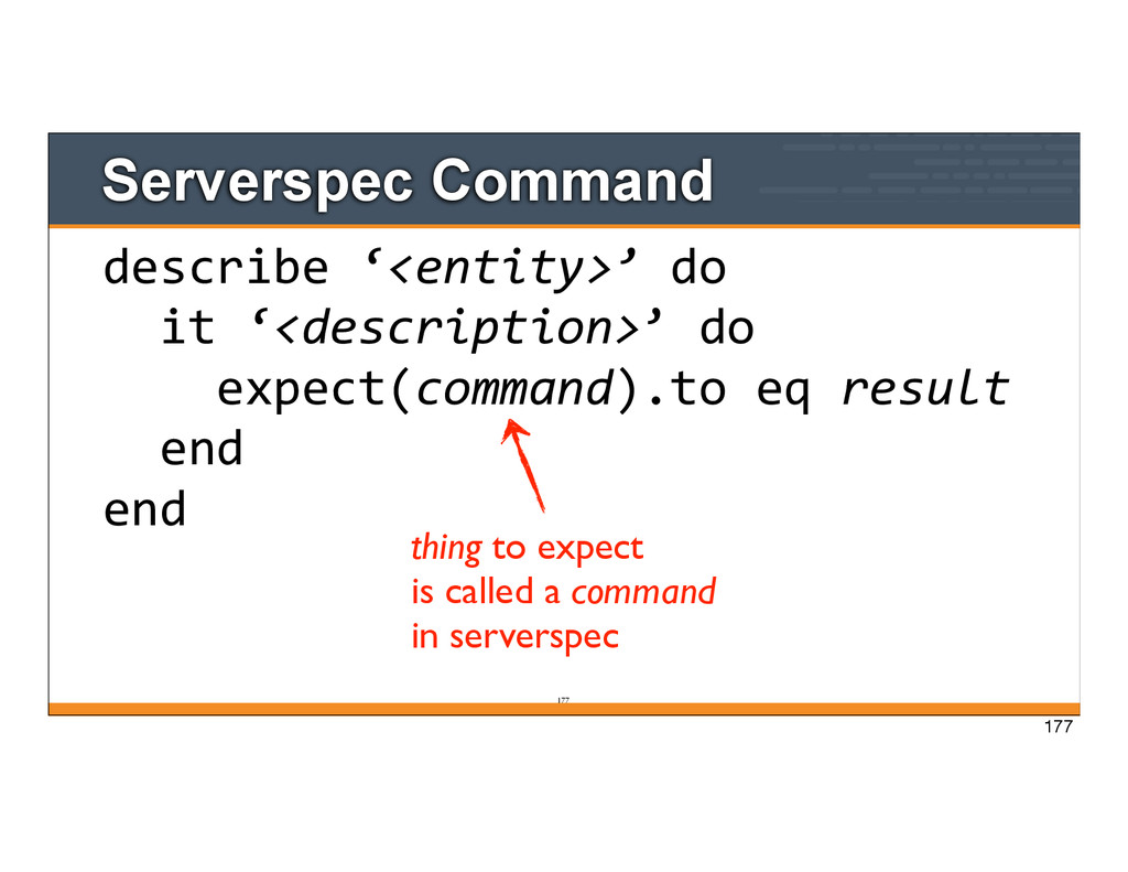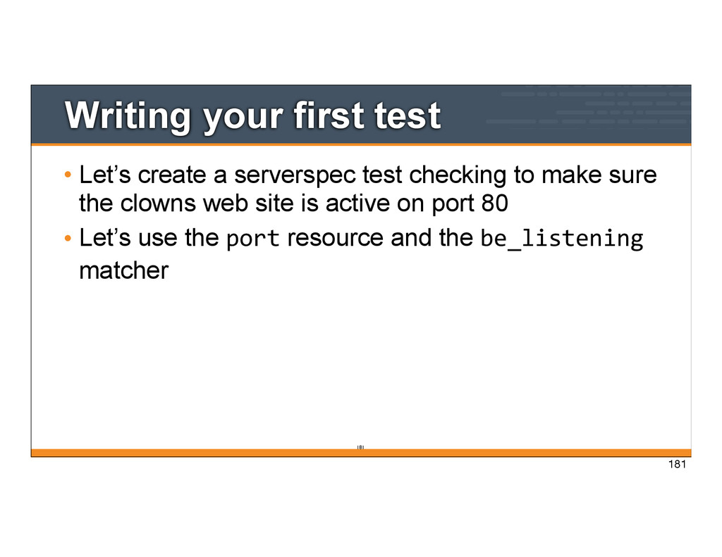 test plugin, as Test Kitchen many different kinds of test plugins. A test plugin is called a busser. We’ll be using the busser directory called serverspec. └── test/ └── integration/ └── default/ └── serverspec/ 170