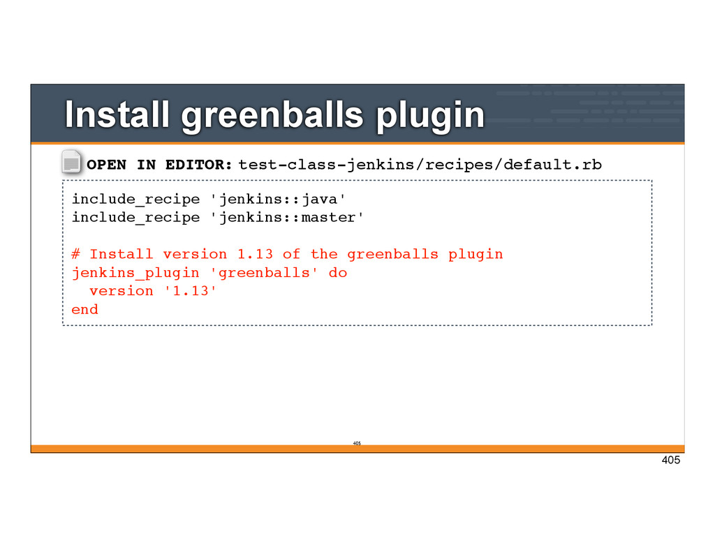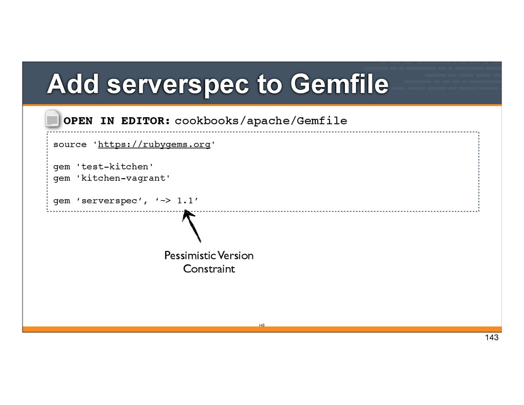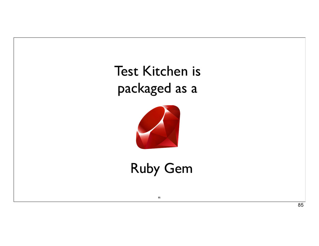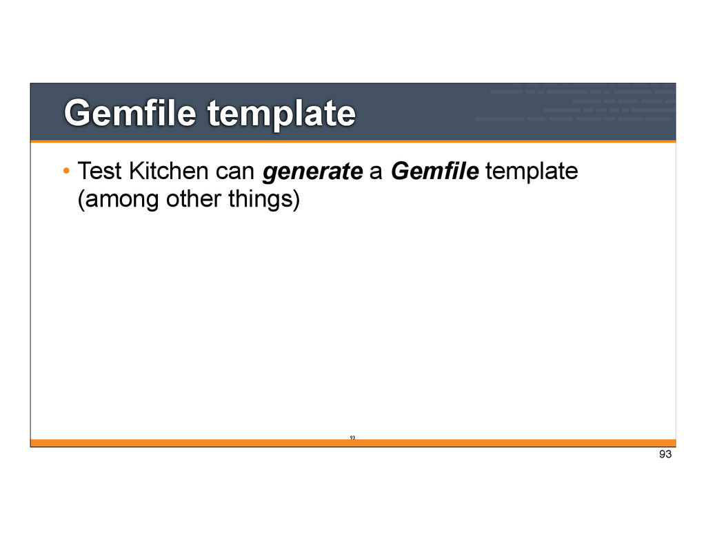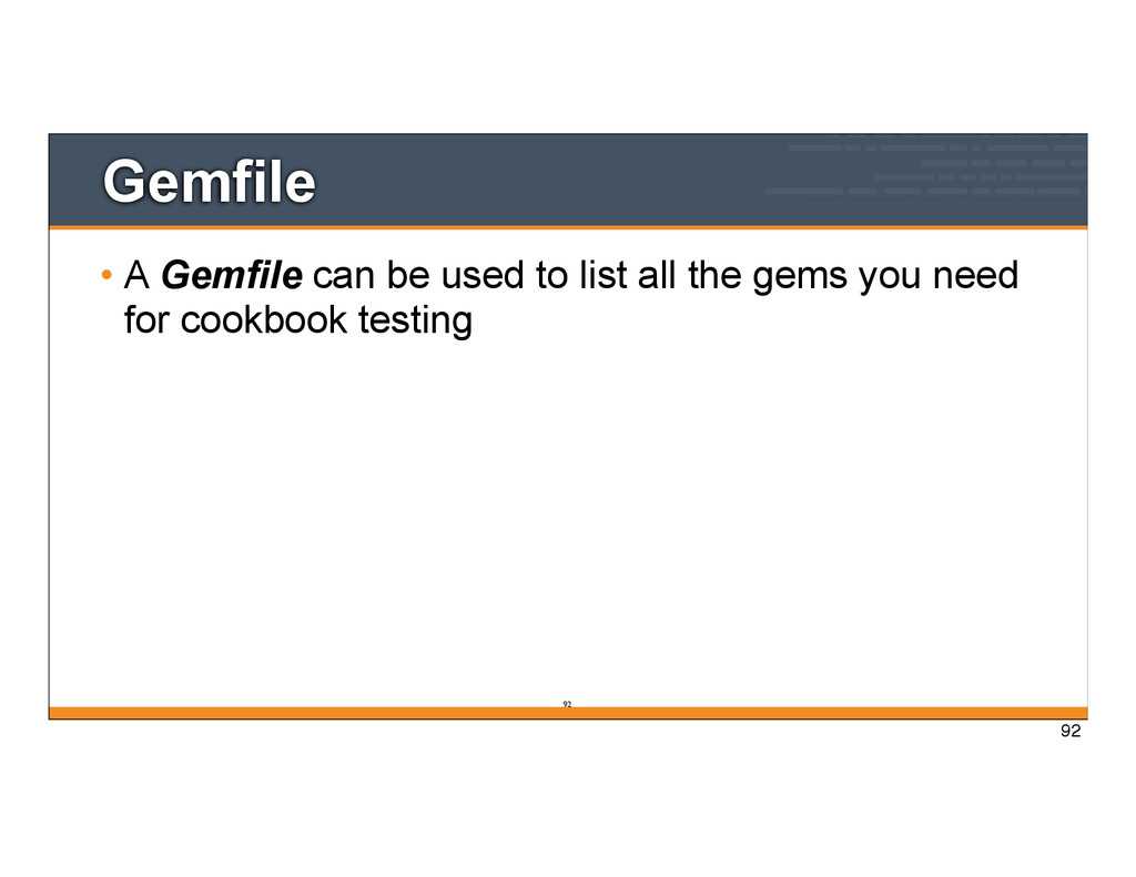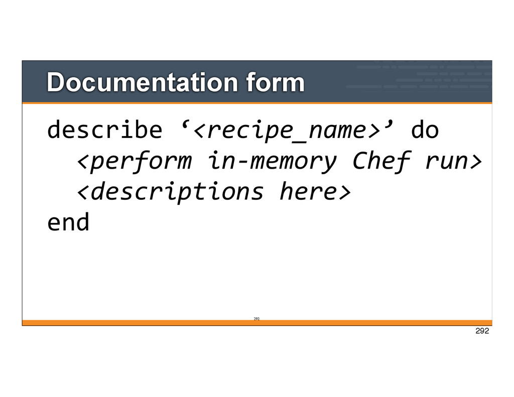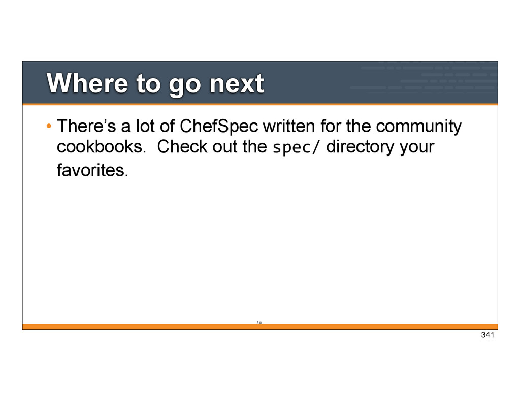 test plugin, as Test Kitchen many different kinds of test plugins. A test plugin is called a busser. We’ll be using the busser directory called serverspec. └── test/ └── integration/ └── default/ └── serverspec/ 170