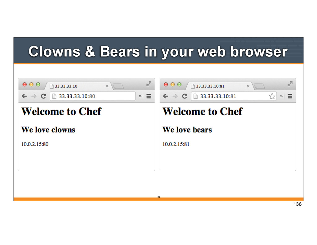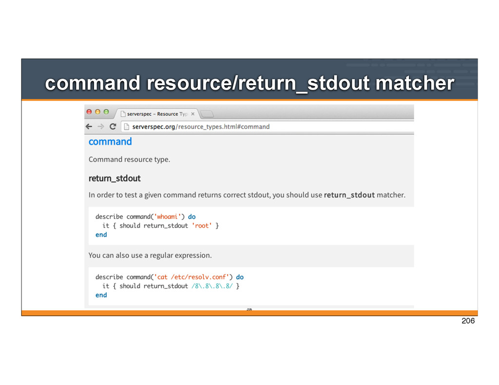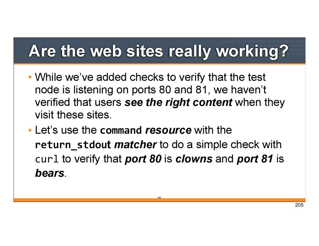 added checks to verify that the test node is listening on ports 80 and 81, we haven’t verified that users see the right content when they visit these sites. • Let’s use the command resource with the return_stdout matcher to do a simple check with curl to verify that port 80 is clowns and port 81 is bears. 205