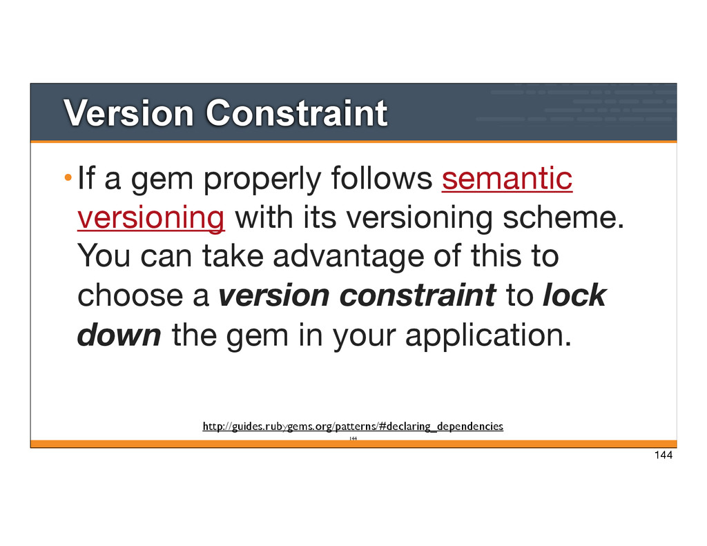 with its versioning scheme. You can take advantage of this to choose a version constraint to lock down the gem in your application. http://guides.rubygems.org/patterns/#declaring_dependencies 144