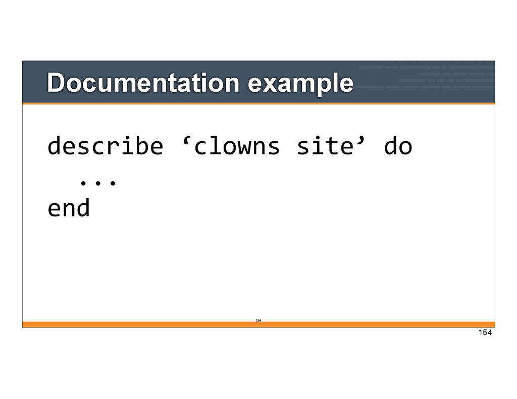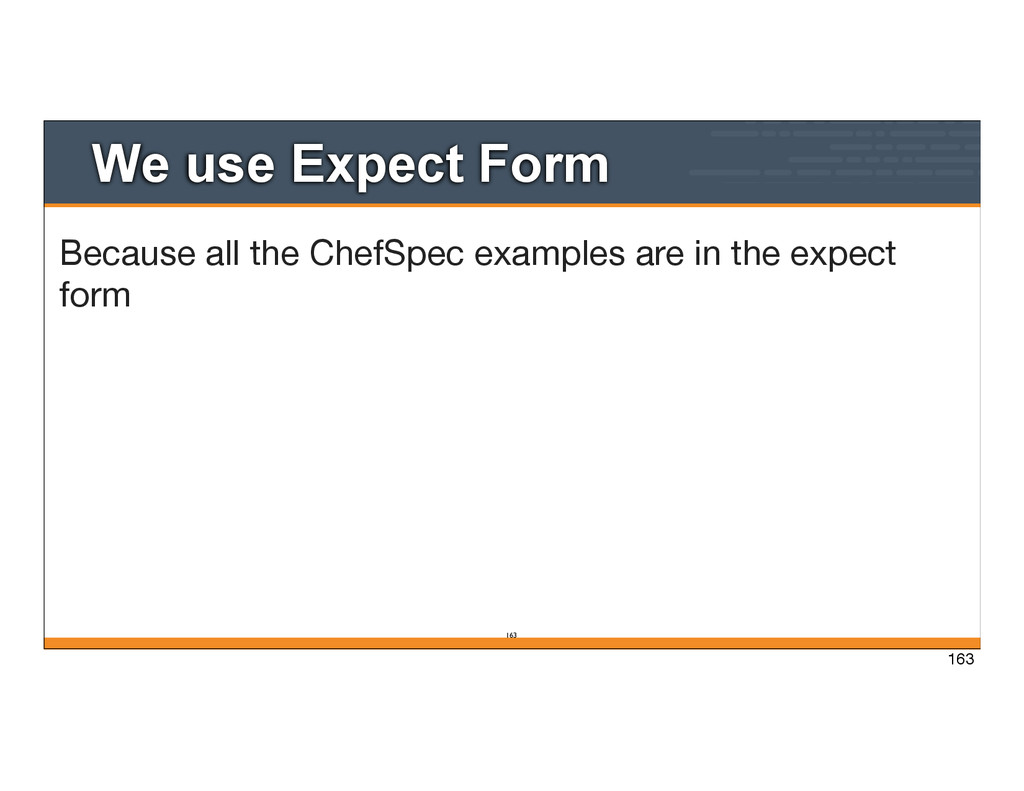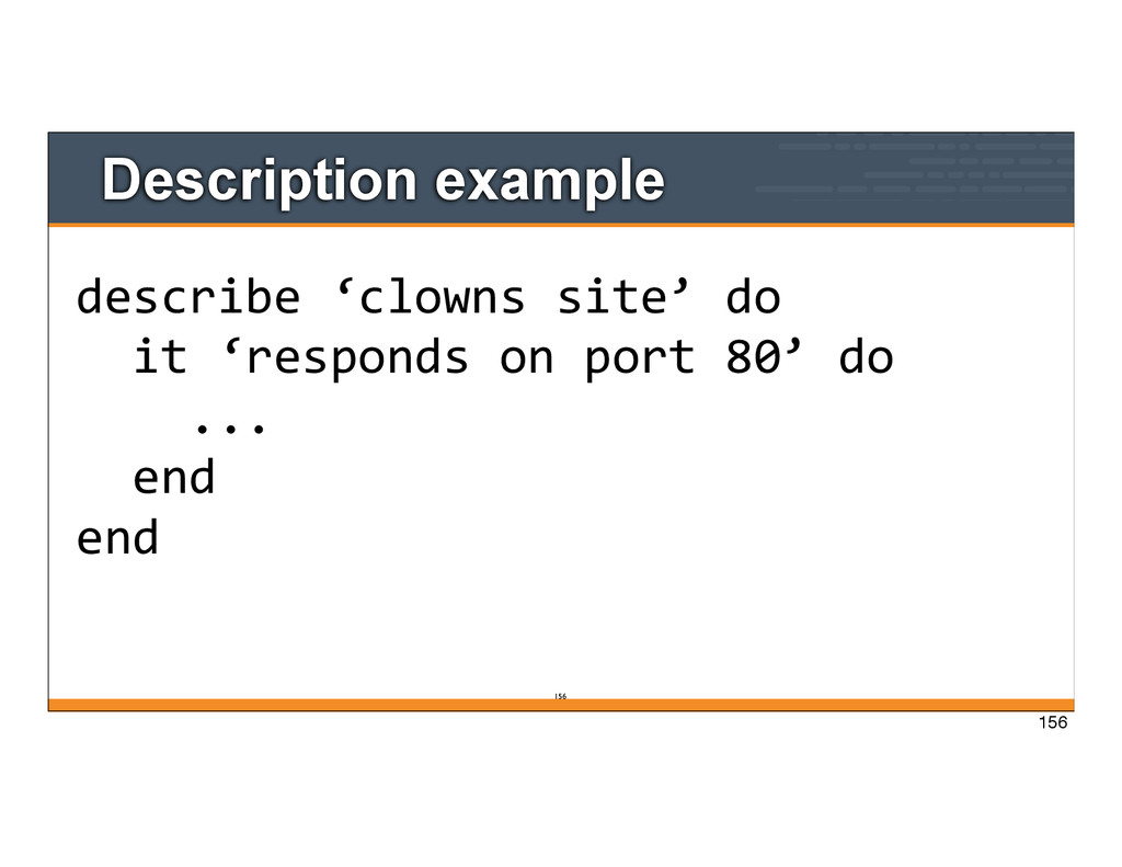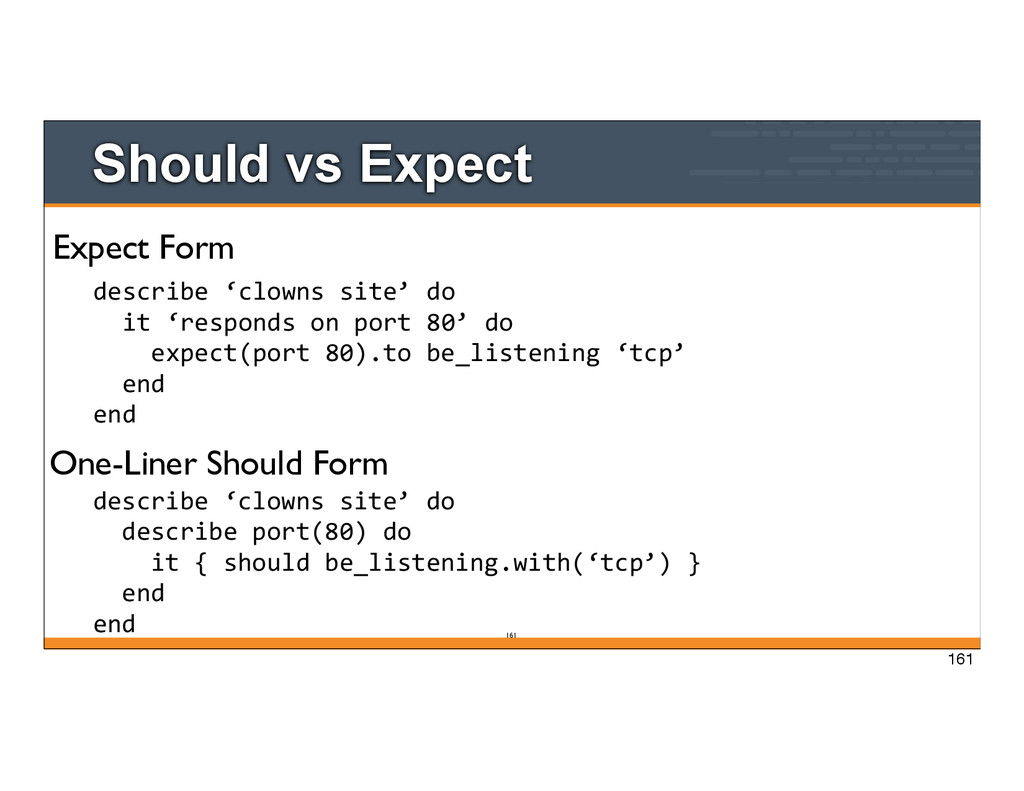 ‘responds on port 80’ do expect(port 80).to be_listening ‘tcp’ end end Expect Form One-Liner Should Form describe ‘clowns site’ do describe port(80) do it { should be_listening.with(‘tcp’) } end end 161