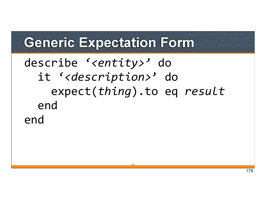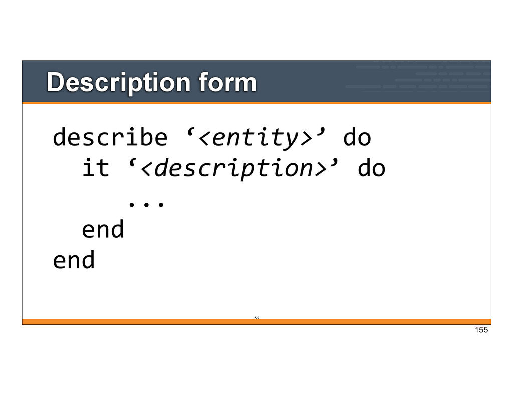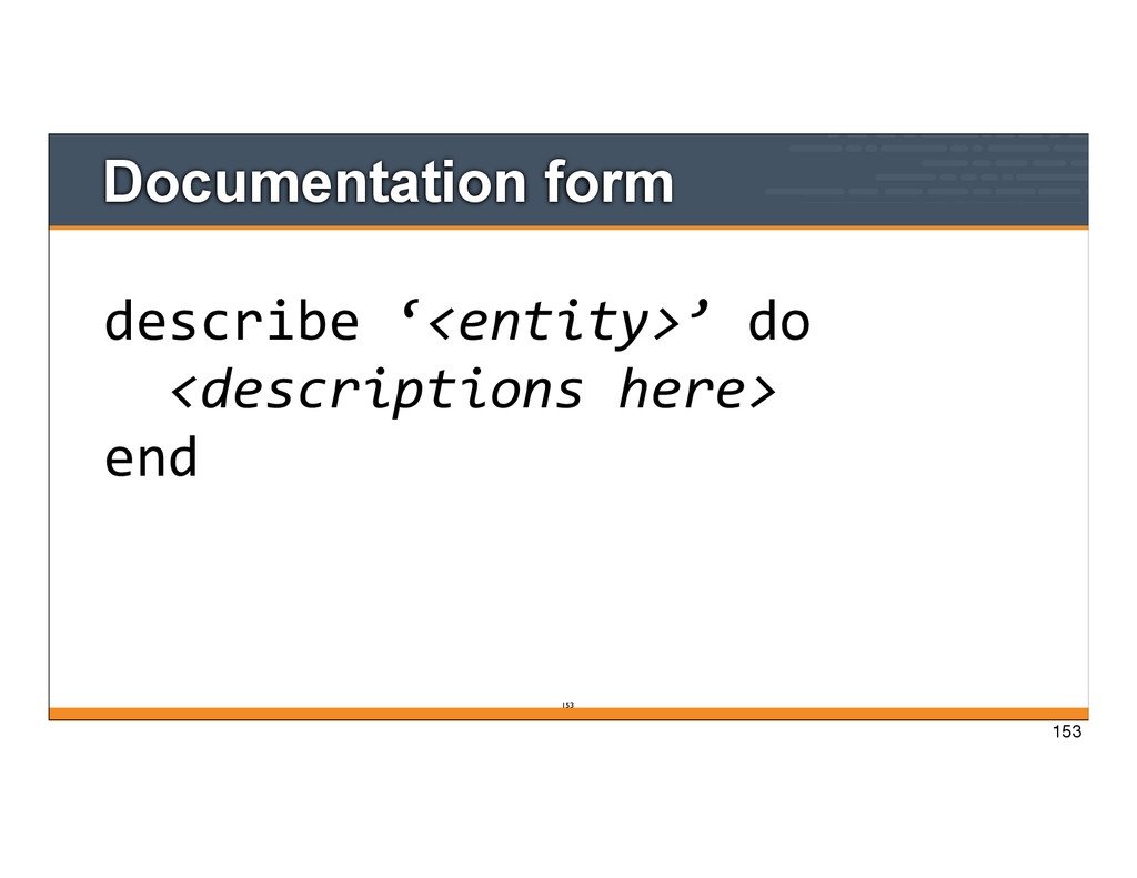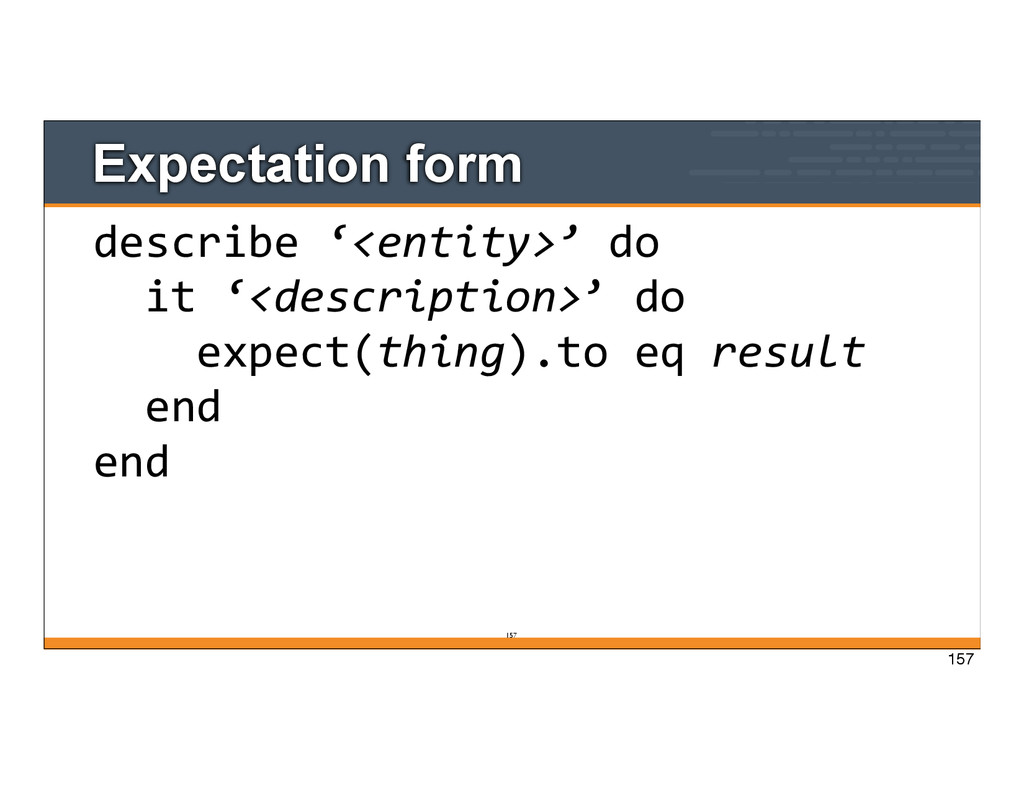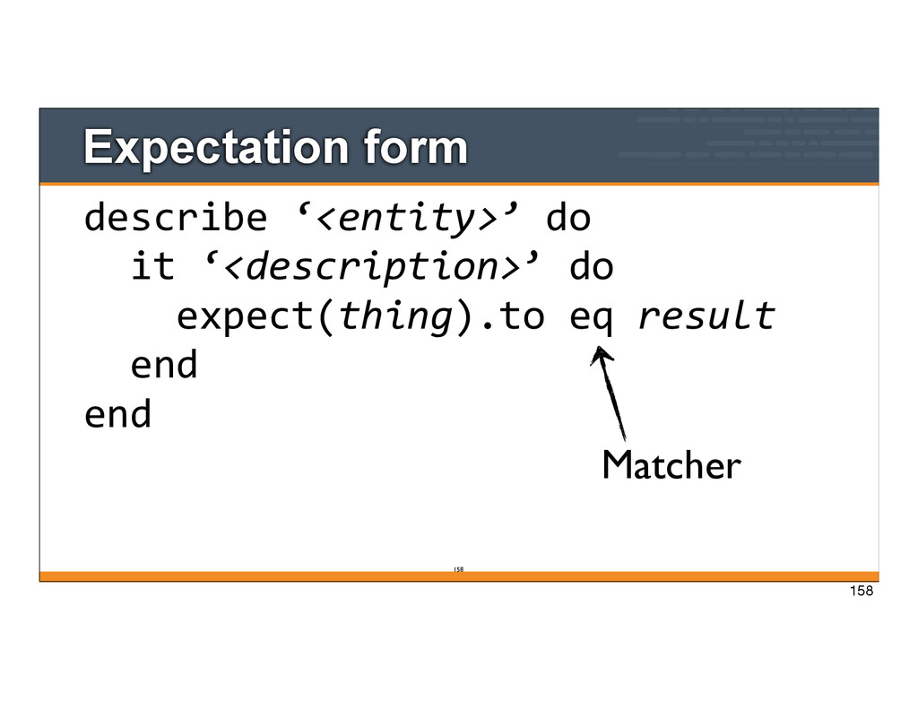 ‘responds on port 80’ do expect(port 80).to be_listening ‘tcp’ end end Expect Form One-Liner Should Form describe ‘clowns site’ do describe port(80) do it { should be_listening.with(‘tcp’) } end end 161