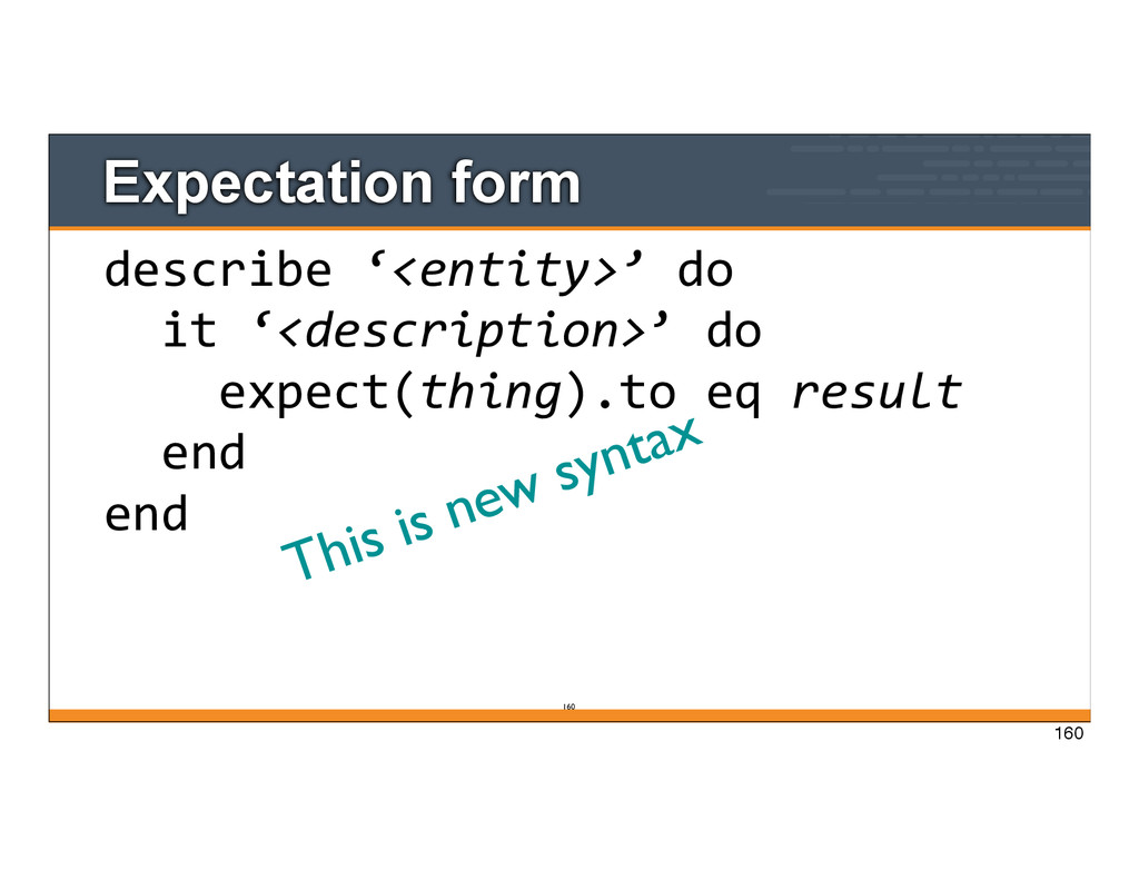 use expect vs. should is epic: http://myronmars.to/n/dev-blog/2012/06/rspecs-new- expectation-syntax ...and pointless. Use whatever makes the most sense to you. There are some technical limitations to the ‘should’ form, but if you stick to the “one-liner should” syntax, they are essentially interchangeable. 162
