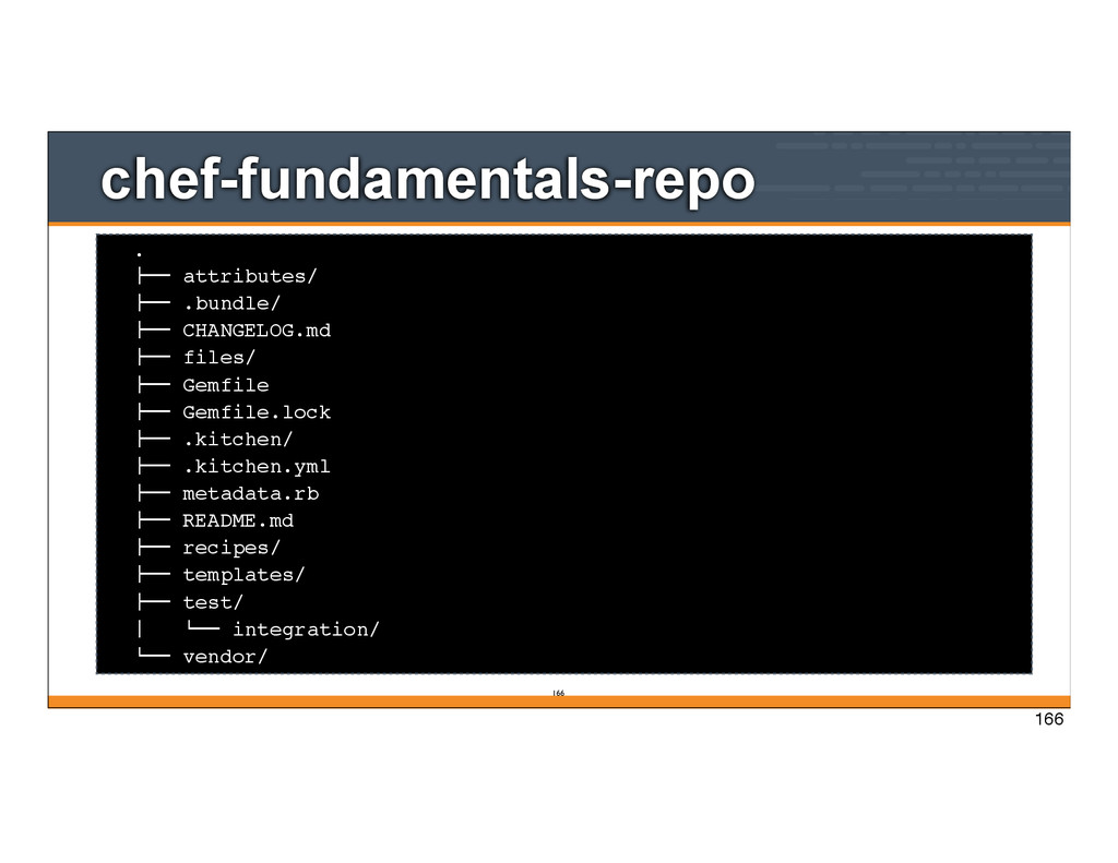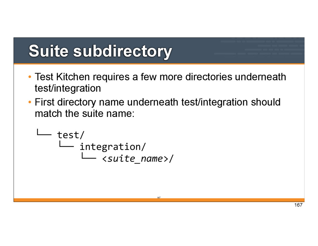 will look in the test/ integration directory for test-related files • For convenience, Test Kitchen creates this directory when you run kitchen init 165