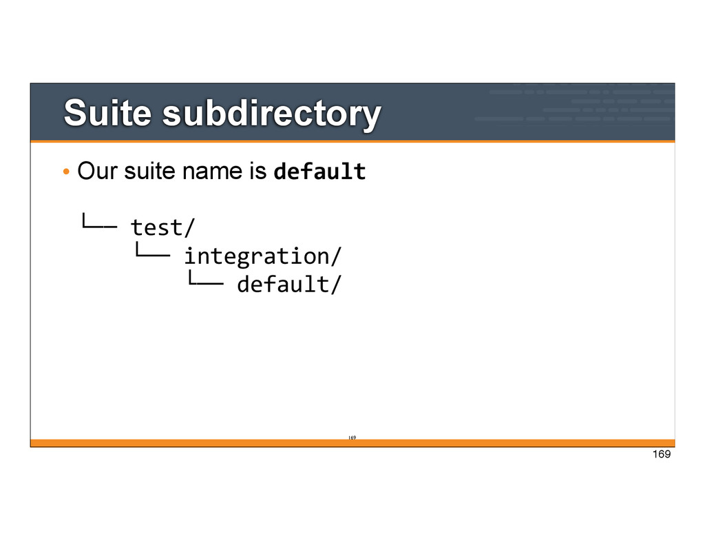 directories underneath test/integration • First directory name underneath test/integration should match the suite name: └── test/ └── integration/ └── <suite_name>/ 167