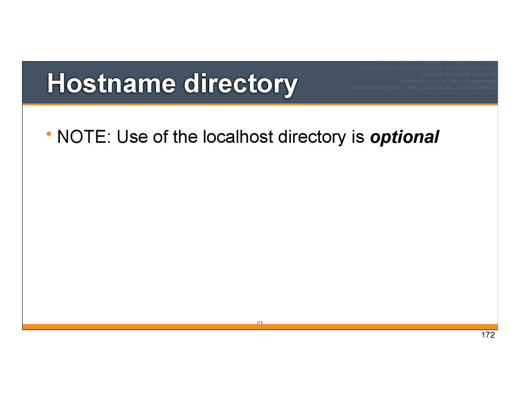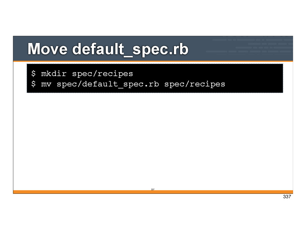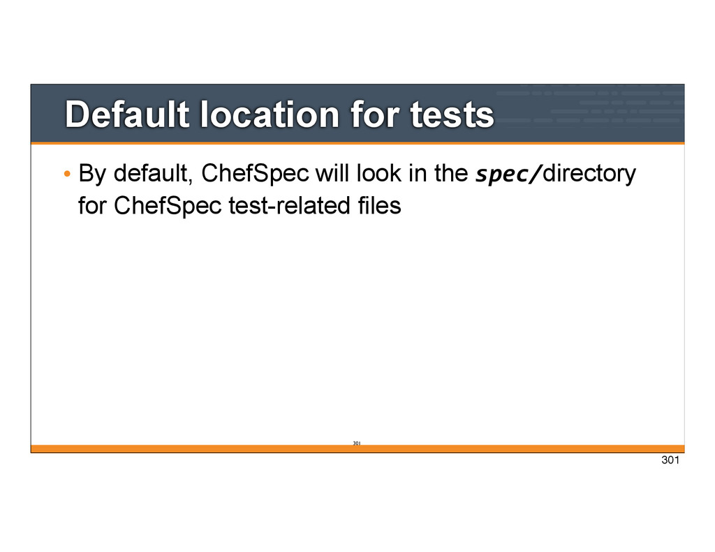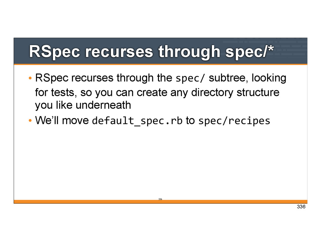 it requires yet another directory level to denote the hostname. We won’t be using this capability, so it should be localhost └── test/ └── integration/ └── default/ └── serverspec/ └── localhost/ 171