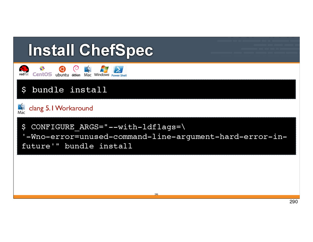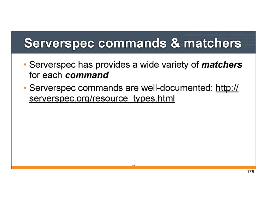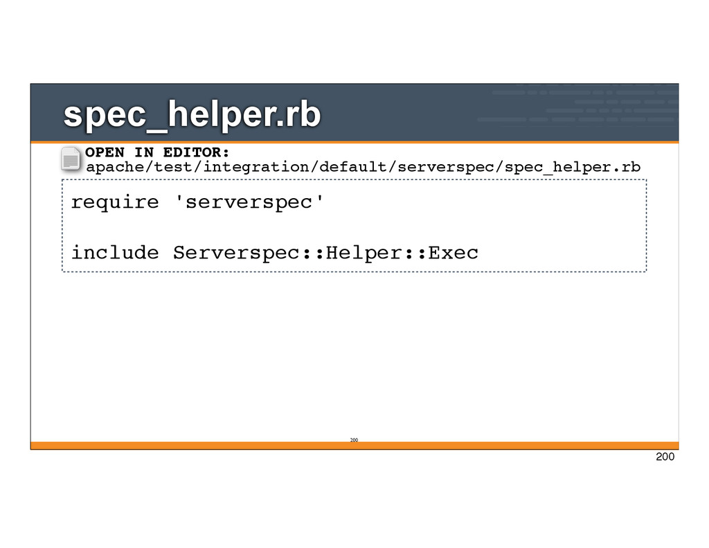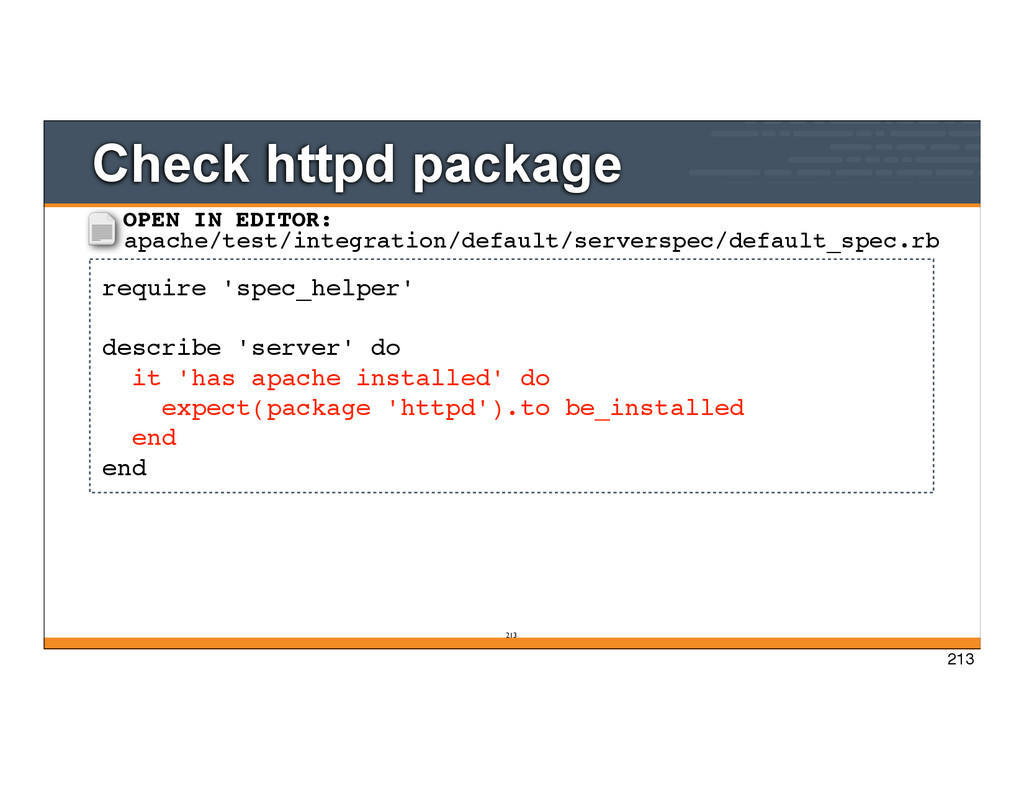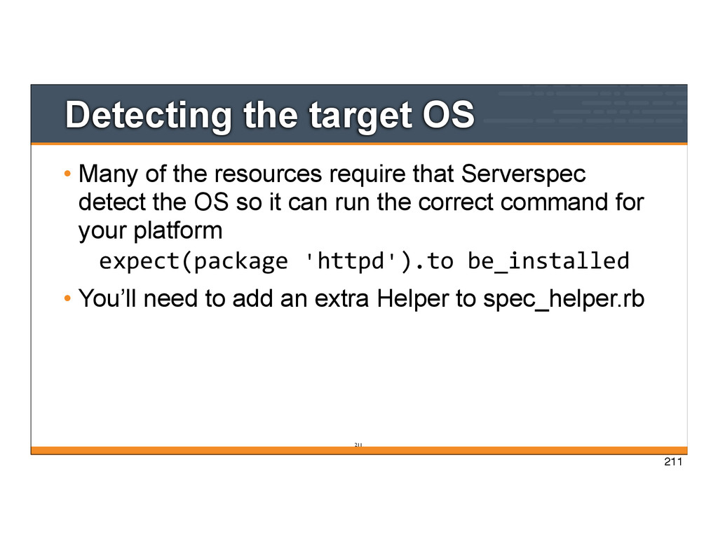 require that Serverspec detect the OS so it can run the correct command for your platform expect(package 'httpd').to be_installed • You’ll need to add an extra Helper to spec_helper.rb 211
