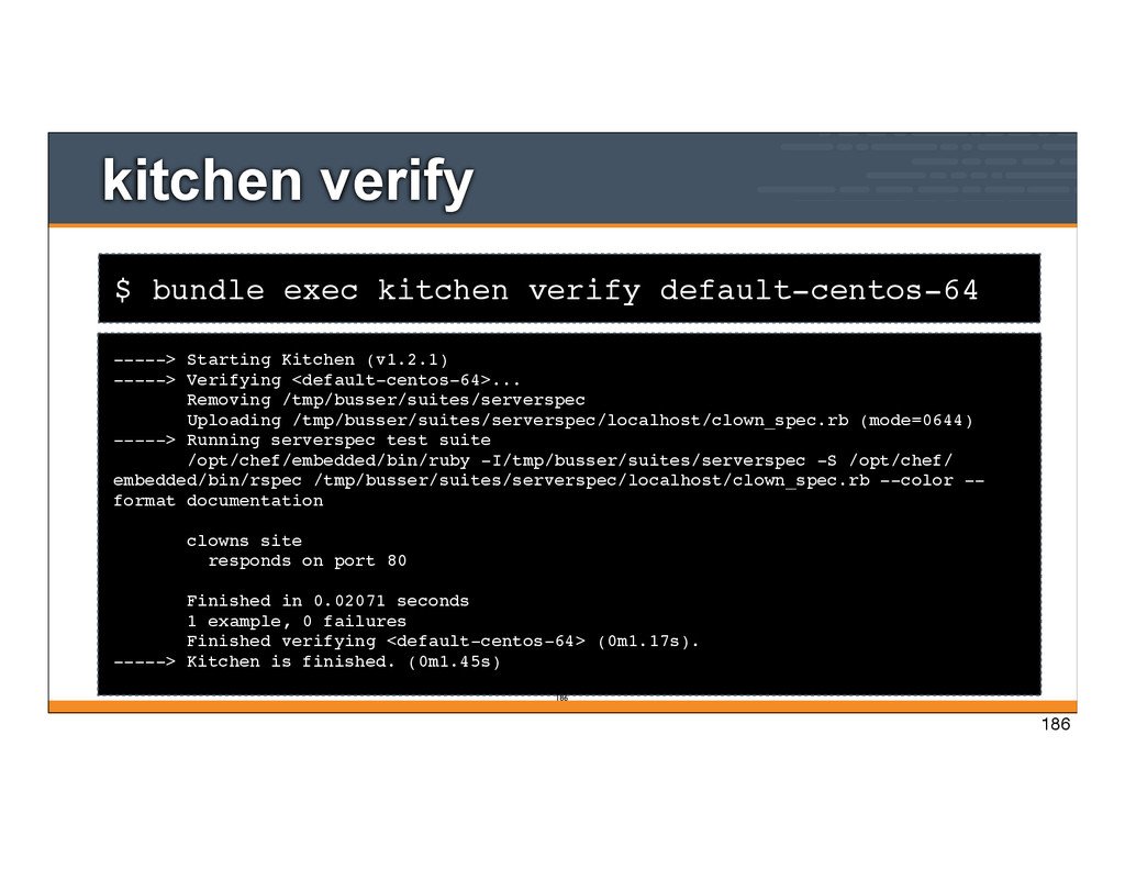 -----> Running serverspec test suite /opt/chef/embedded/bin/ruby -I/tmp/busser/suites/serverspec -S /opt/chef/embedded/bin/rspec /tmp/busser/ suites/serverspec/localhost/bear_spec.rb /tmp/busser/suites/serverspec/localhost/clown_spec.rb --color -- format documentation bears site responds on port 81 returns bears in the HTML body clowns site responds on port 80 returns clowns in the HTML body Finished in 0.0293 seconds 4 examples, 0 failures Finished verifying <default-centos-64> (0m1.73s). -----> Kitchen is finished. (0m1.79s) ... 214 WIN 214