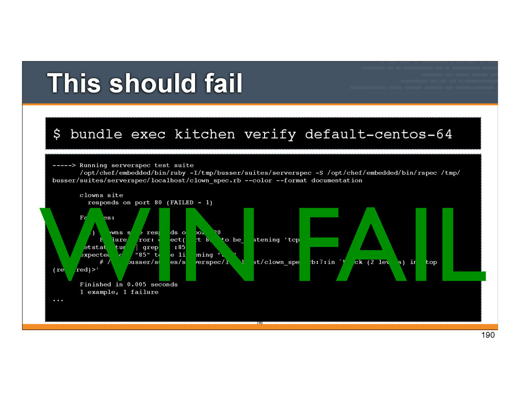 Running serverspec test suite /opt/chef/embedded/bin/ruby -I/tmp/busser/suites/serverspec -S /opt/chef/embedded/bin/rspec /tmp/ busser/suites/serverspec/localhost/clown_spec.rb --color --format documentation clowns site responds on port 80 (FAILED - 1) Failures: 1) clowns site responds on port 80 Failure/Error: expect(port 85).to be_listening 'tcp' netstat -tunl | grep -- :85\ expected Port "85" to be listening "tcp" # /tmp/busser/suites/serverspec/localhost/clown_spec.rb:7:in `block (2 levels) in <top (required)>' Finished in 0.005 seconds 1 example, 1 failure ... 190 WIN FAIL 190