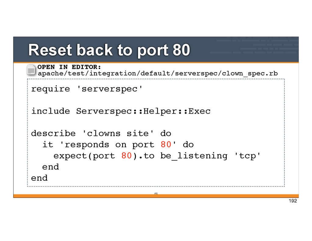 describe 'clowns site' do it 'responds on port 80' do expect(port 80).to be_listening 'tcp' end end OPEN IN EDITOR: apache/test/integration/default/serverspec/clown_spec.rb 192