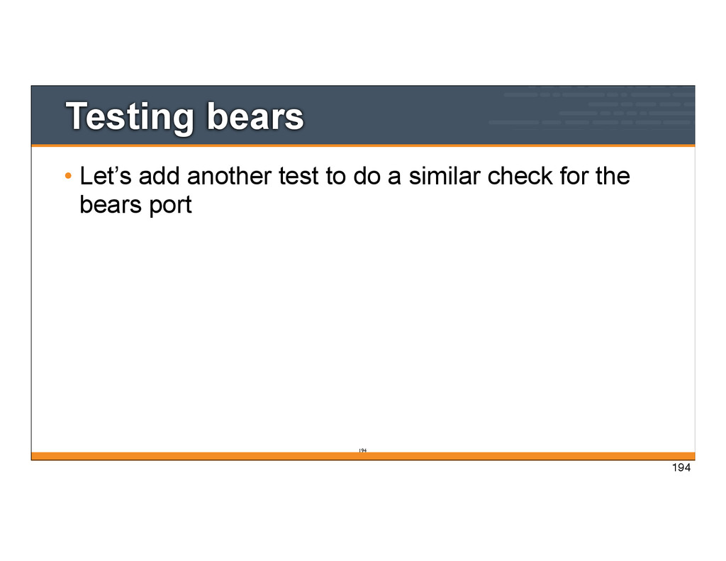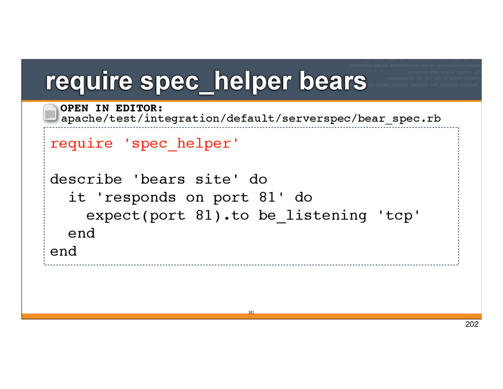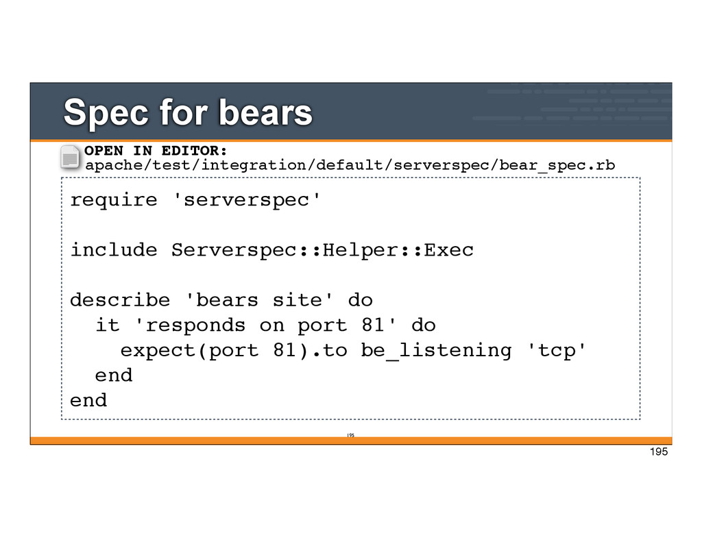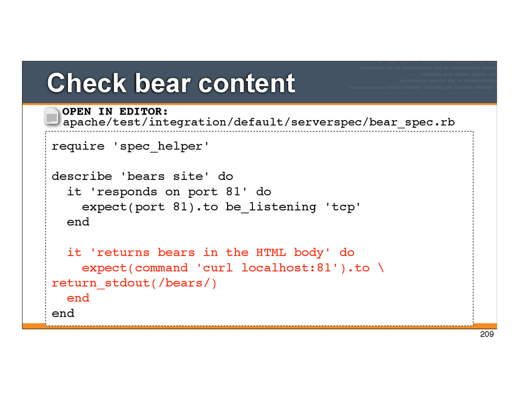 it 'responds on port 81' do expect(port 81).to be_listening 'tcp' end it 'returns bears in the HTML body' do expect(command 'curl localhost:81').to \ return_stdout(/bears/) end end OPEN IN EDITOR: apache/test/integration/default/serverspec/bear_spec.rb 209
