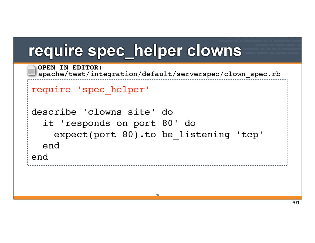it 'responds on port 80' do expect(port 80).to be_listening 'tcp' end it 'returns clowns in the HTML body' do expect(command 'curl localhost:80').to \ return_stdout(/clowns/) end end OPEN IN EDITOR: apache/test/integration/default/serverspec/clown_spec.rb 207
