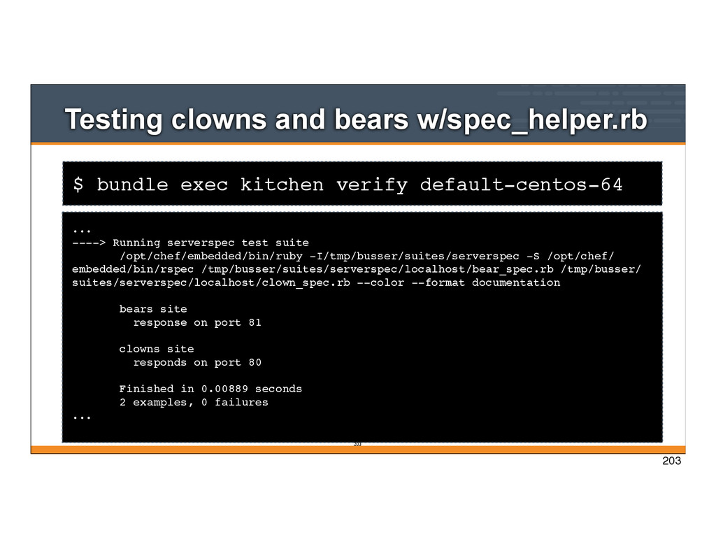w/spec_helper.rb ... ----> Running serverspec test suite /opt/chef/embedded/bin/ruby -I/tmp/busser/suites/serverspec -S /opt/chef/ embedded/bin/rspec /tmp/busser/suites/serverspec/localhost/bear_spec.rb /tmp/busser/ suites/serverspec/localhost/clown_spec.rb --color --format documentation bears site response on port 81 clowns site responds on port 80 Finished in 0.00889 seconds 2 examples, 0 failures ... 203 203