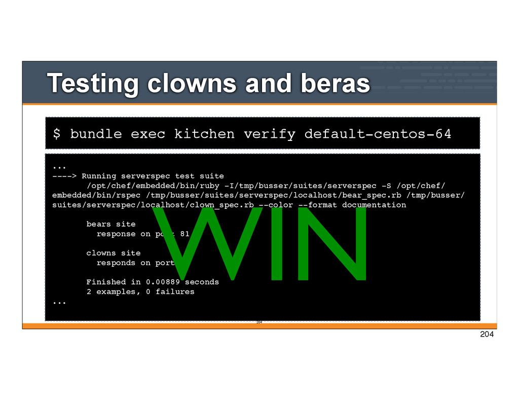 ... ----> Running serverspec test suite /opt/chef/embedded/bin/ruby -I/tmp/busser/suites/serverspec -S /opt/chef/ embedded/bin/rspec /tmp/busser/suites/serverspec/localhost/bear_spec.rb /tmp/busser/ suites/serverspec/localhost/clown_spec.rb --color --format documentation bears site response on port 81 clowns site responds on port 80 Finished in 0.00889 seconds 2 examples, 0 failures ... 204 WIN 204