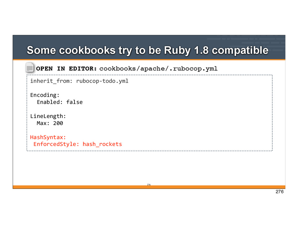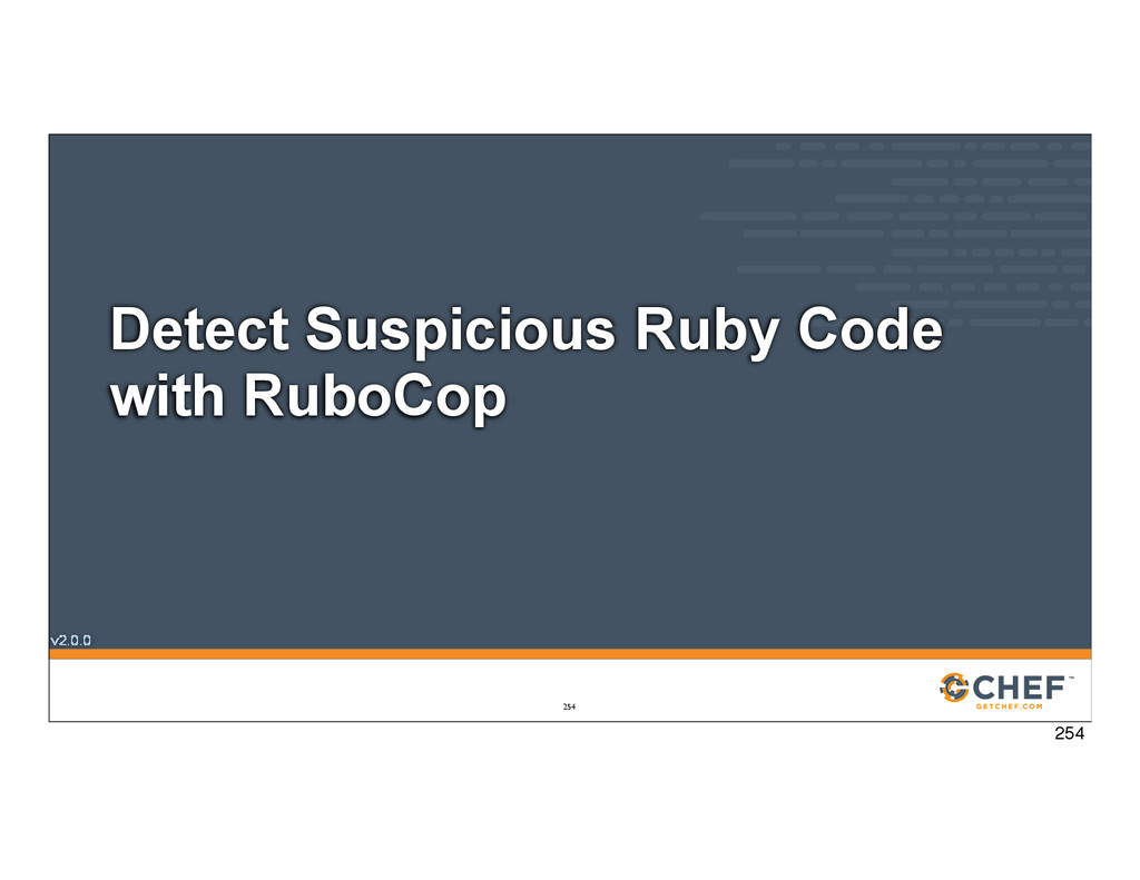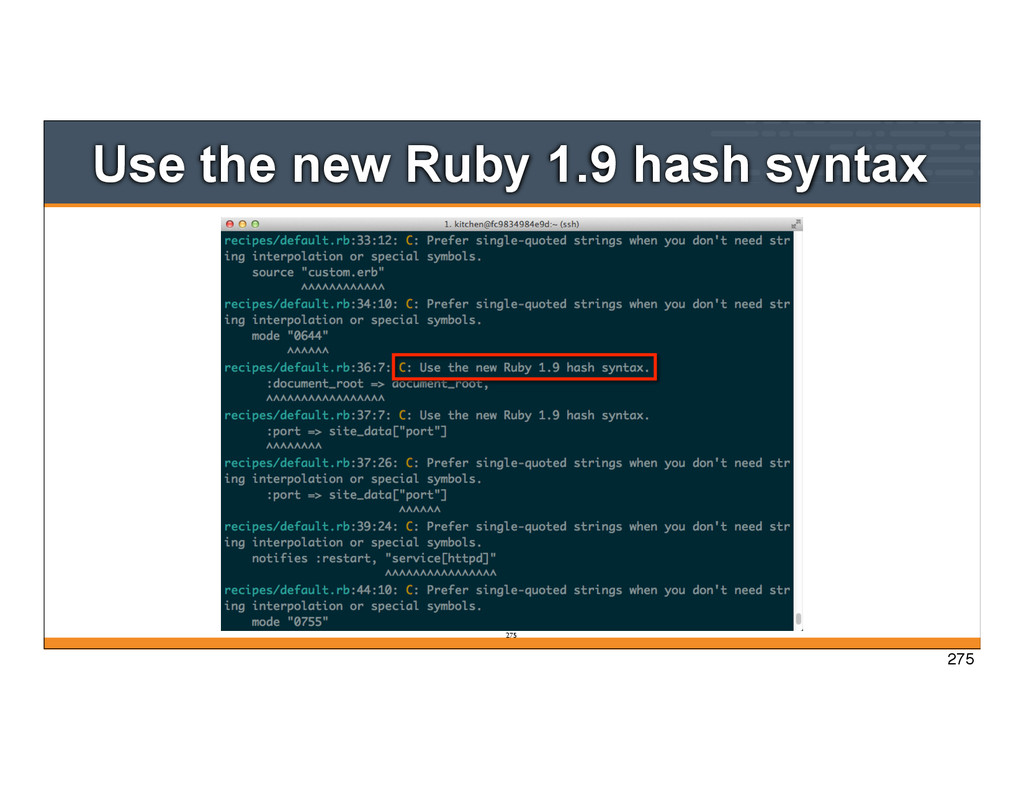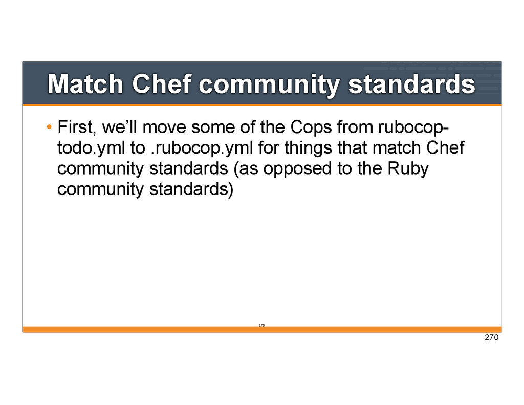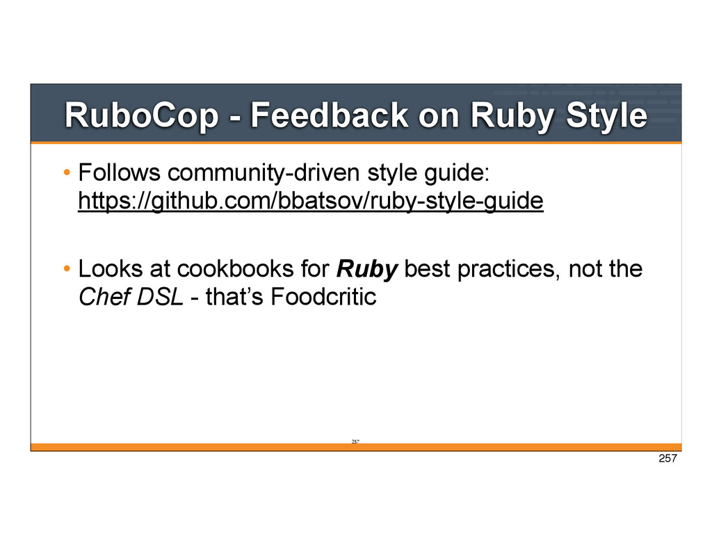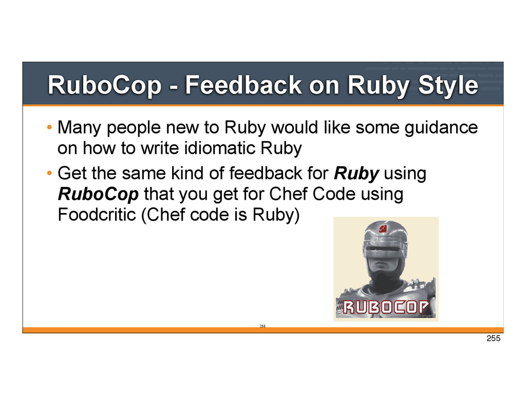 to Ruby would like some guidance on how to write idiomatic Ruby • Get the same kind of feedback for Ruby using RuboCop that you get for Chef Code using Foodcritic (Chef code is Ruby) 255 255