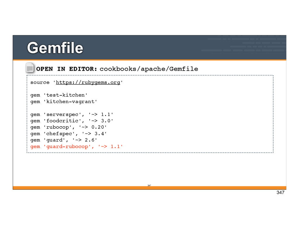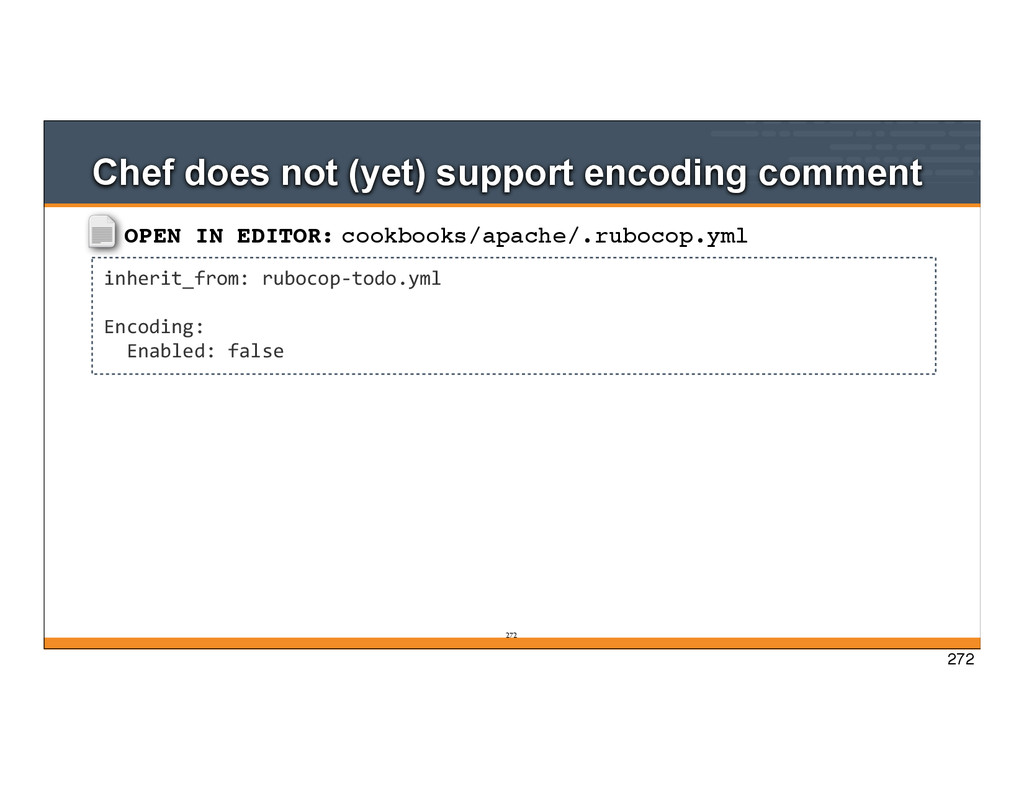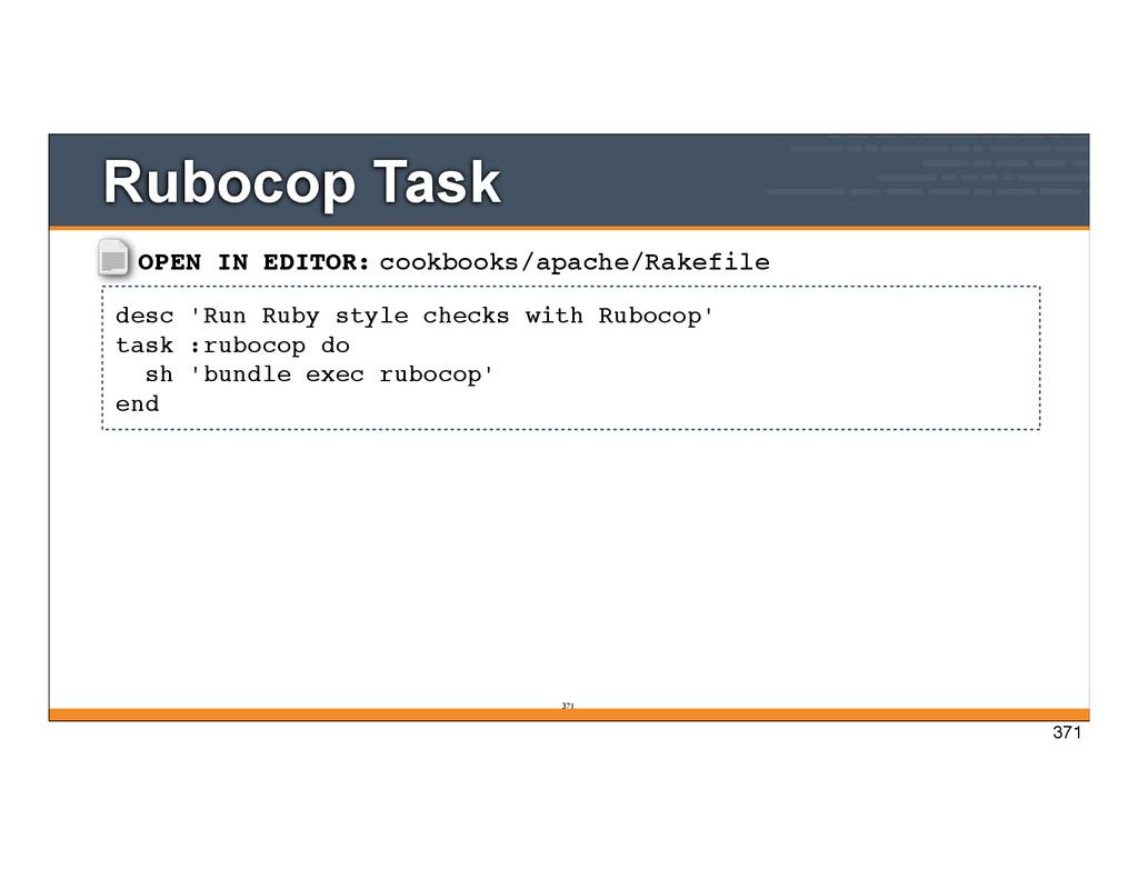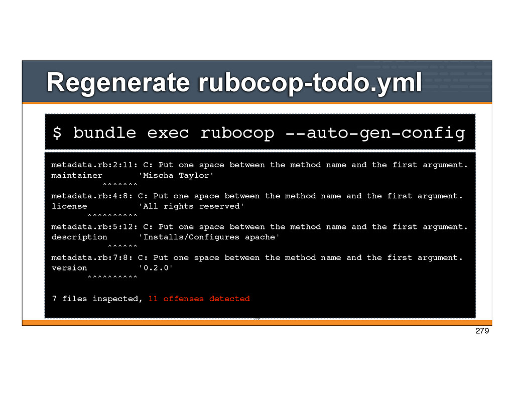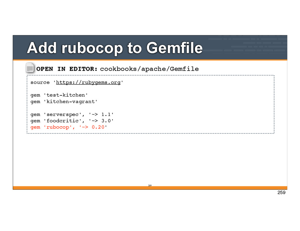 to Ruby would like some guidance on how to write idiomatic Ruby • Get the same kind of feedback for Ruby using RuboCop that you get for Chef Code using Foodcritic (Chef code is Ruby) 255 255