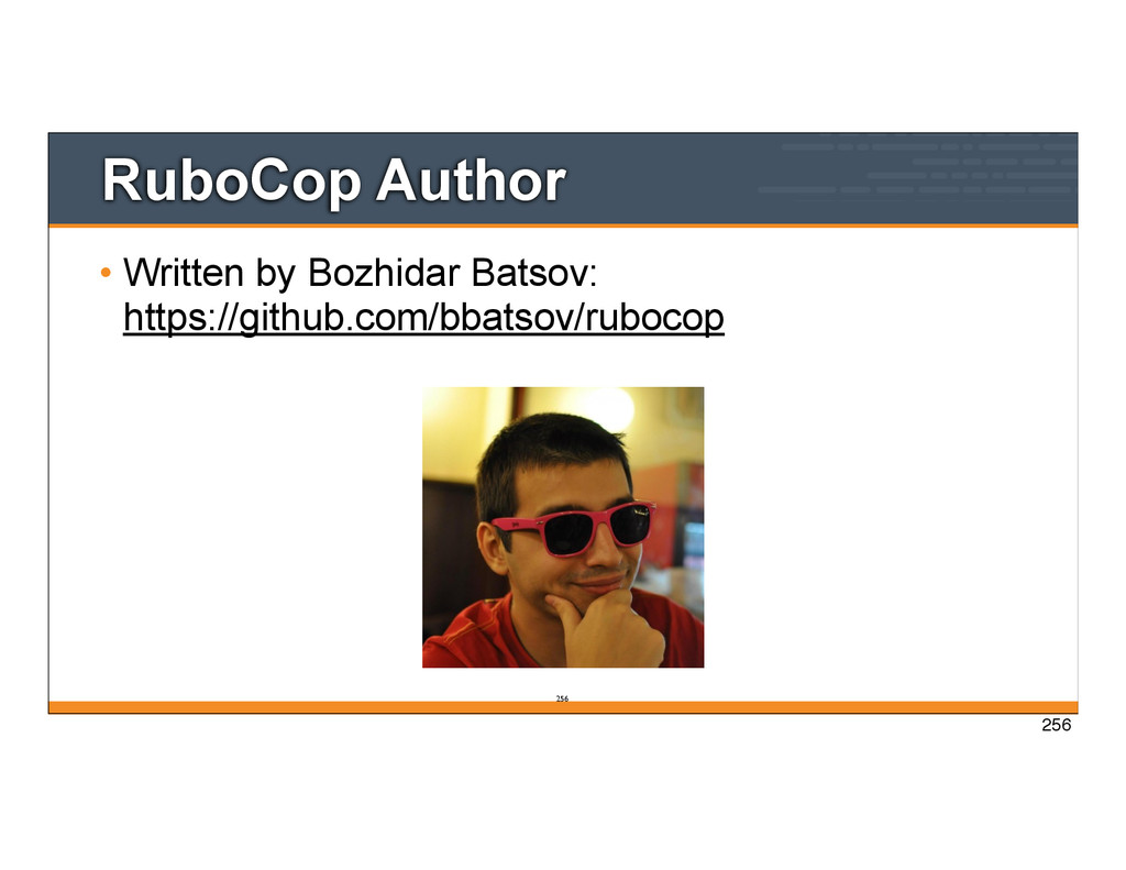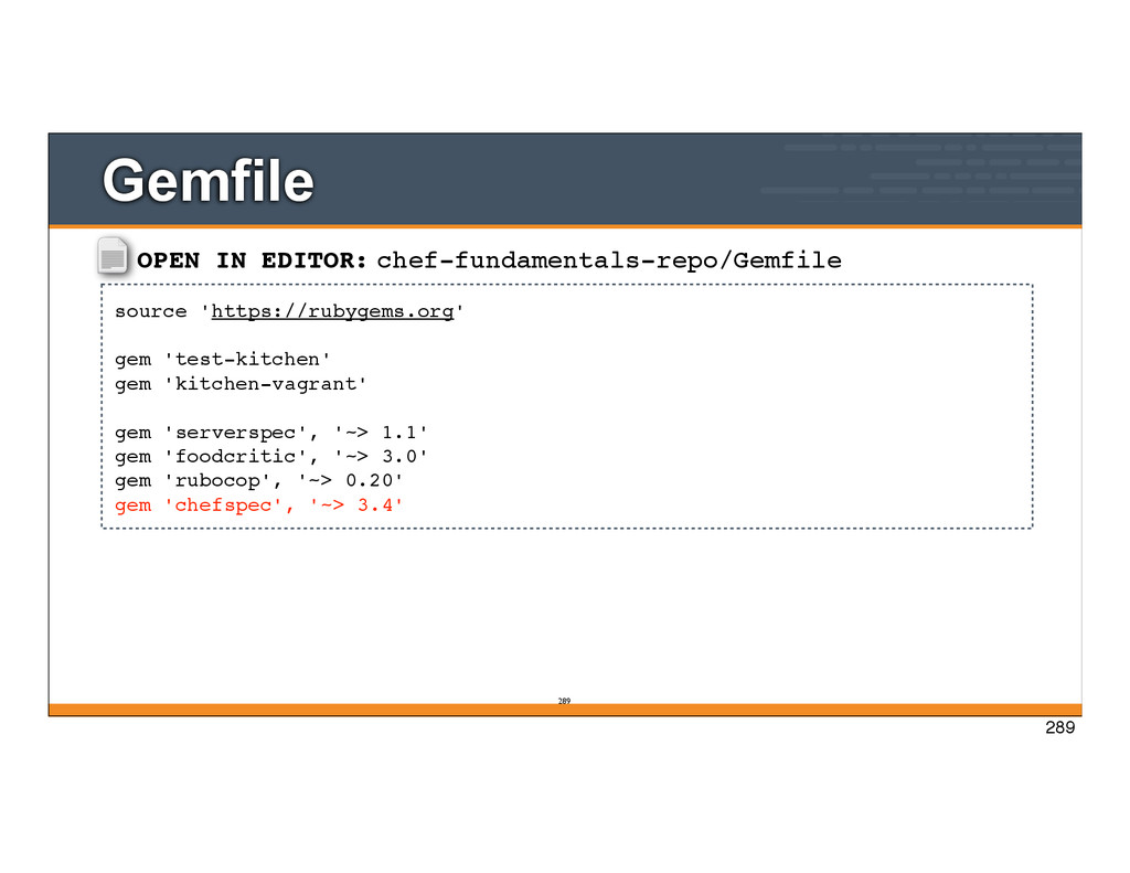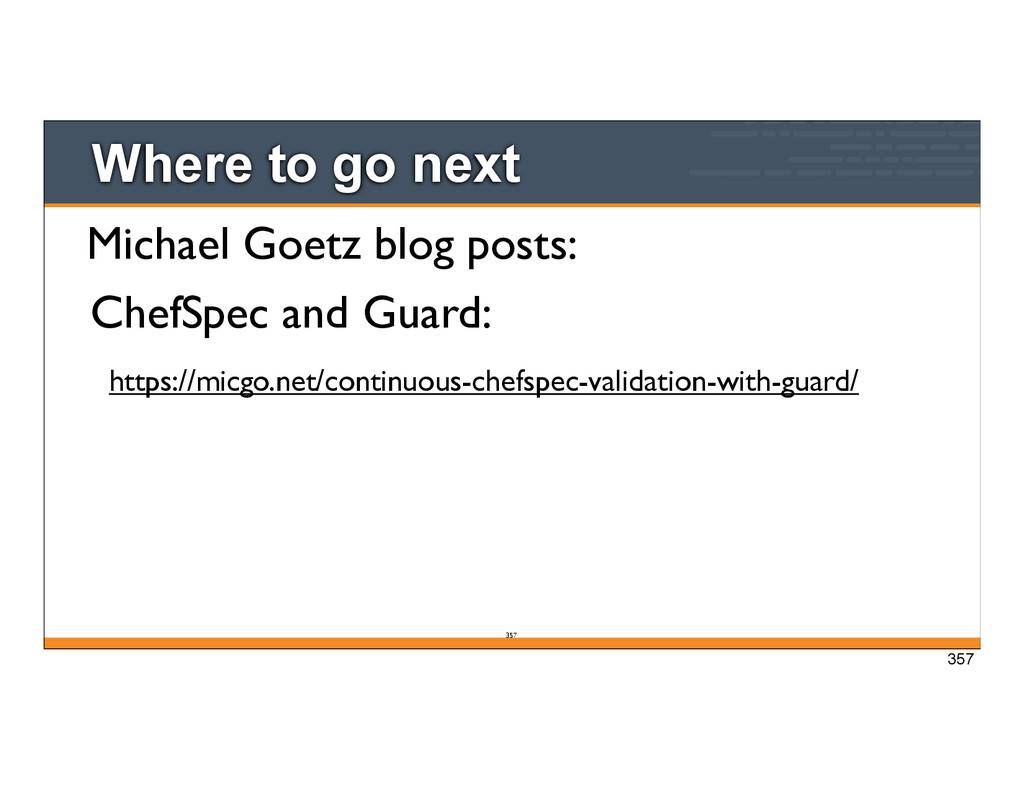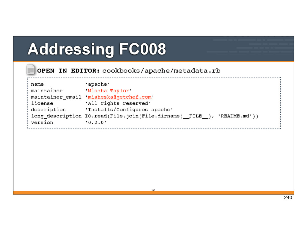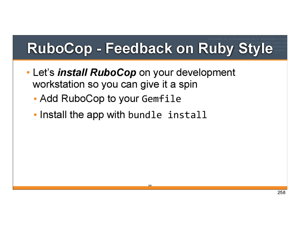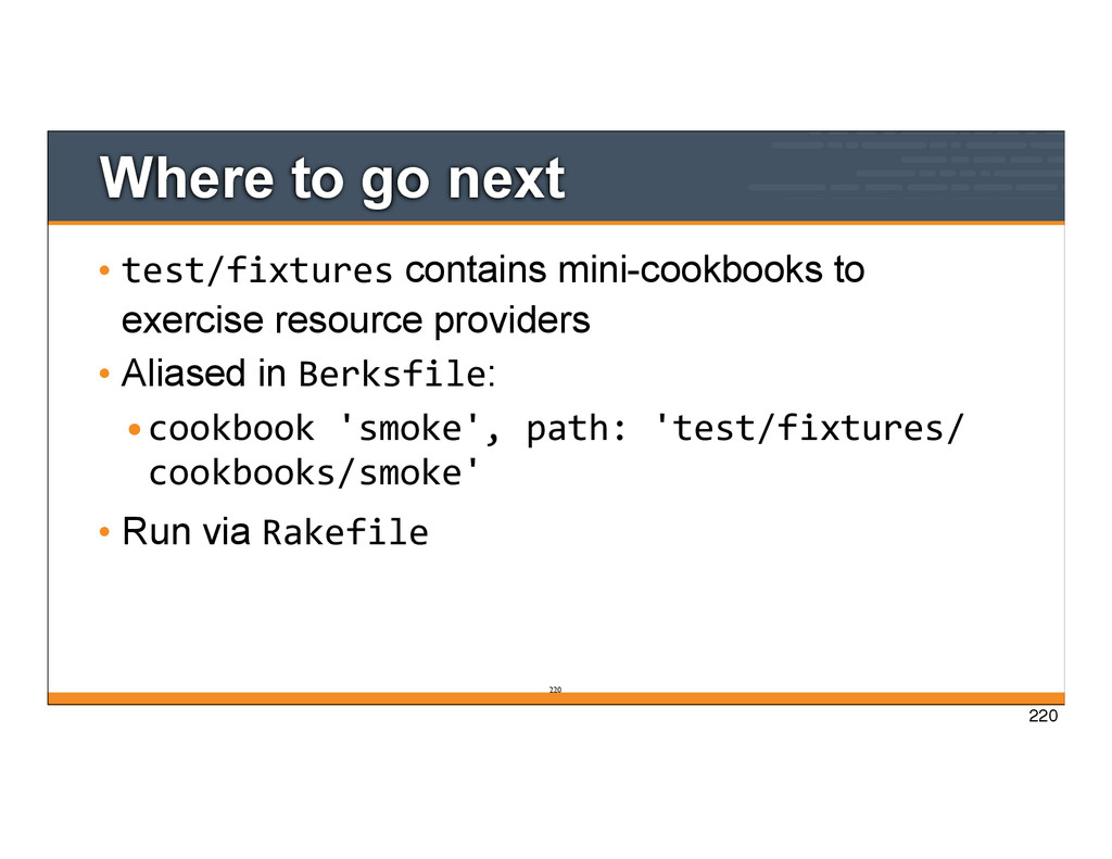to Ruby would like some guidance on how to write idiomatic Ruby • Get the same kind of feedback for Ruby using RuboCop that you get for Chef Code using Foodcritic (Chef code is Ruby) 255 255