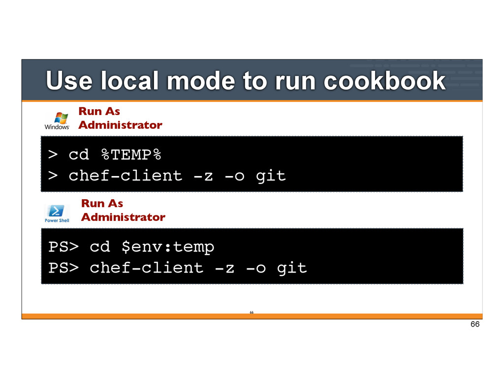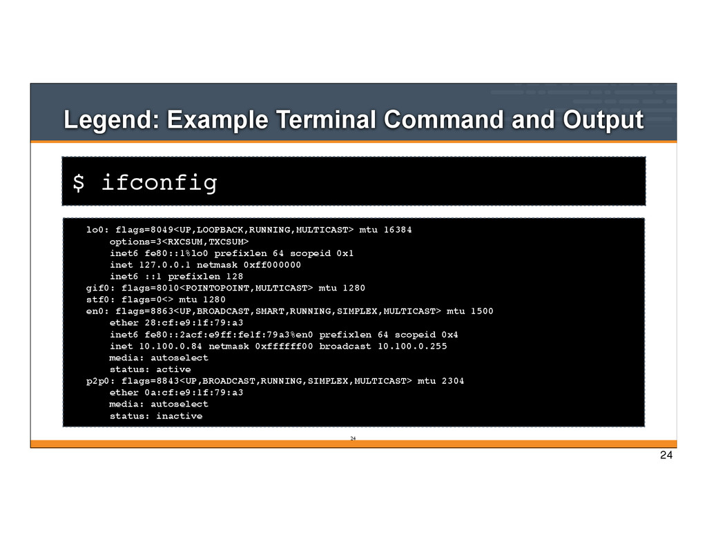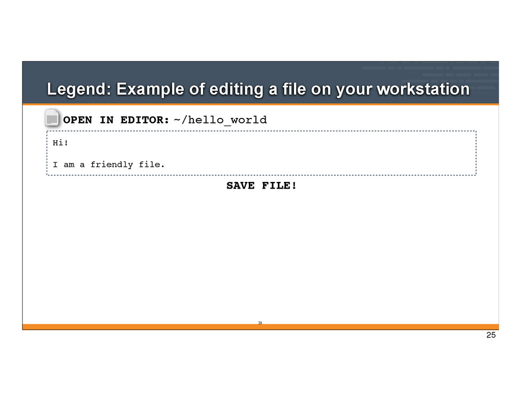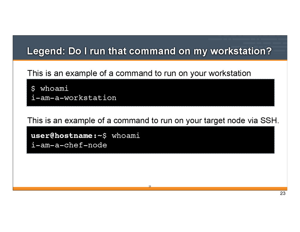 whoami i-am-a-workstation This is an example of a command to run on your workstation user@hostname:~$ whoami i-am-a-chef-node This is an example of a command to run on your target node via SSH. 23 23