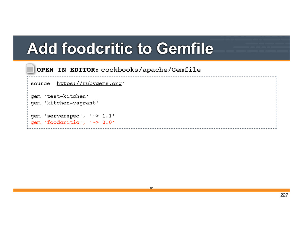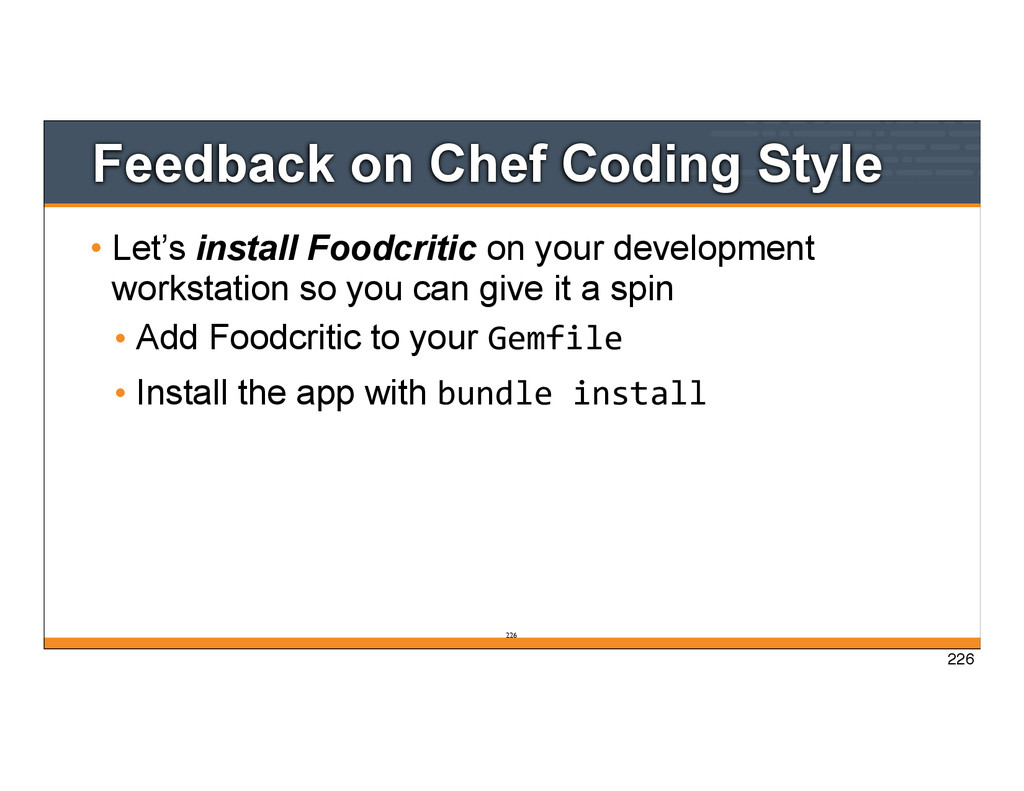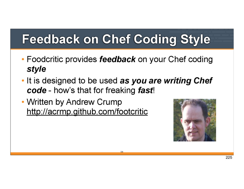 your Chef coding style • It is designed to be used as you are writing Chef code - how’s that for freaking fast! • Written by Andrew Crump http://acrmp.github.com/footcritic 225 225