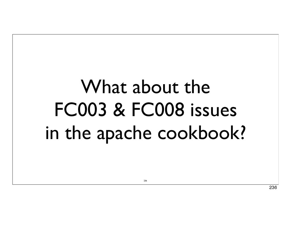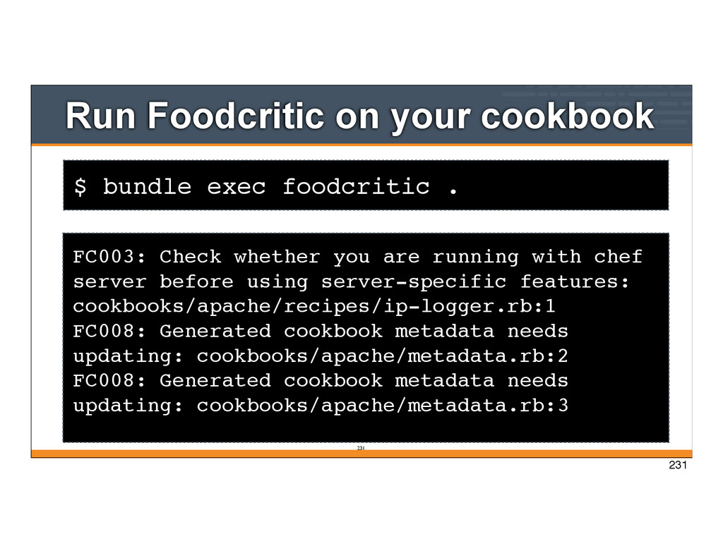 231 FC003: Check whether you are running with chef server before using server-specific features: cookbooks/apache/recipes/ip-logger.rb:1 FC008: Generated cookbook metadata needs updating: cookbooks/apache/metadata.rb:2 FC008: Generated cookbook metadata needs updating: cookbooks/apache/metadata.rb:3 231