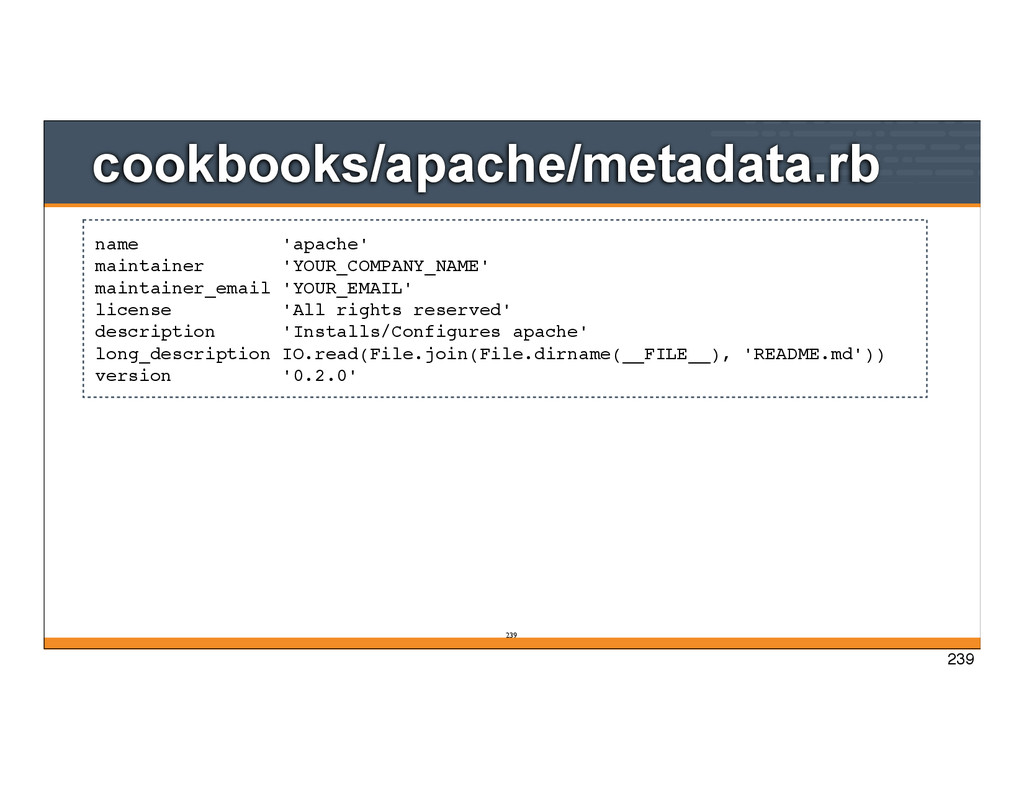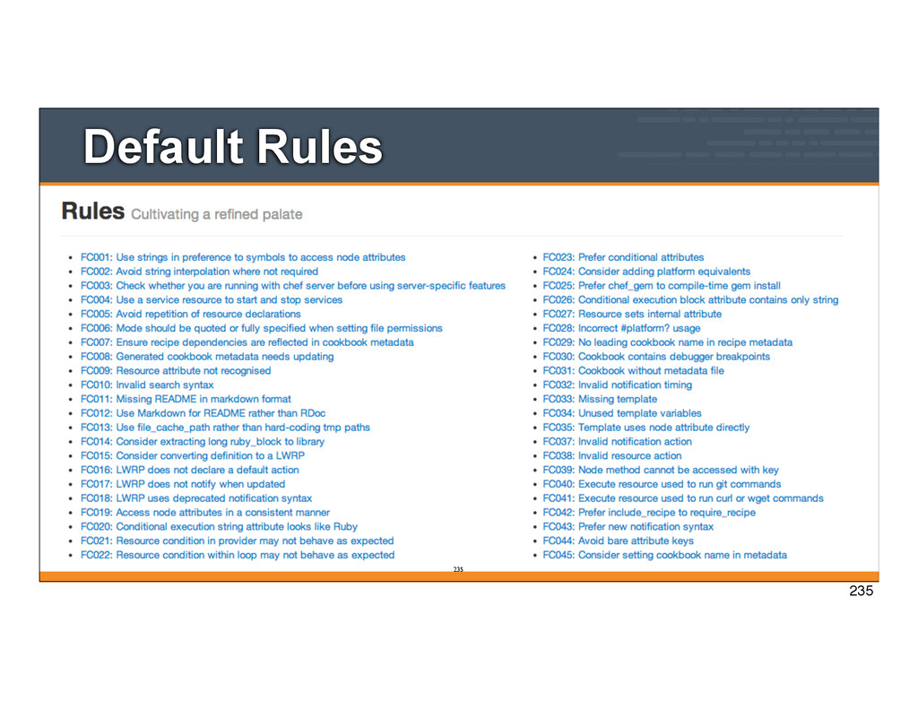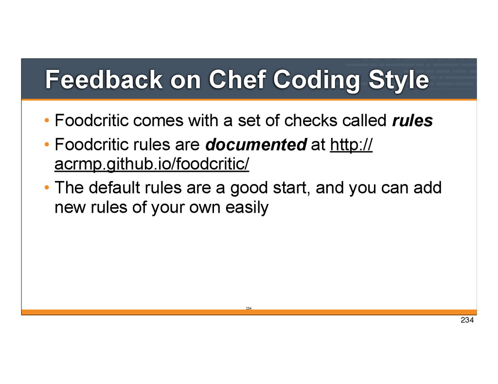 set of checks called rules • Foodcritic rules are documented at http:// acrmp.github.io/foodcritic/ • The default rules are a good start, and you can add new rules of your own easily 234 234