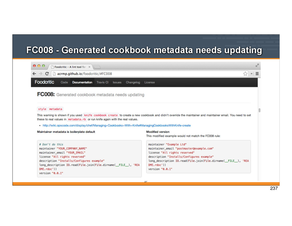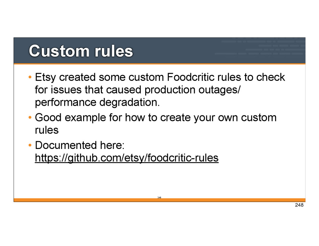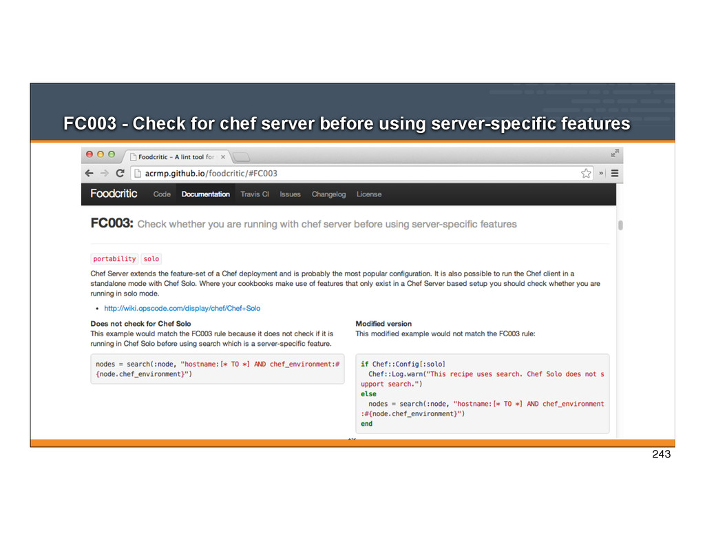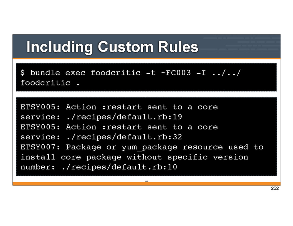 to check for issues that caused production outages/ performance degradation. • Good example for how to create your own custom rules • Documented here: https://github.com/etsy/foodcritic-rules 248