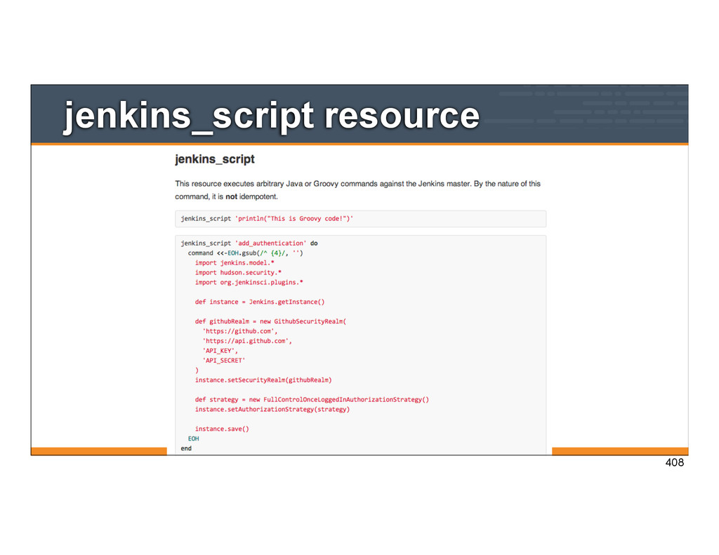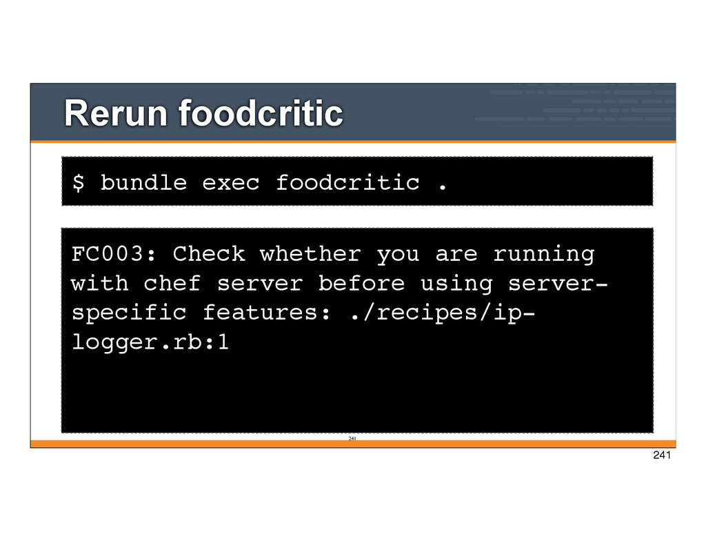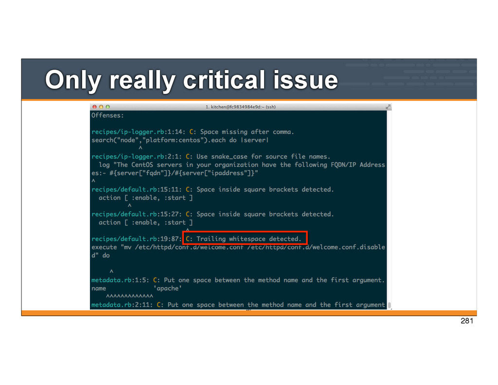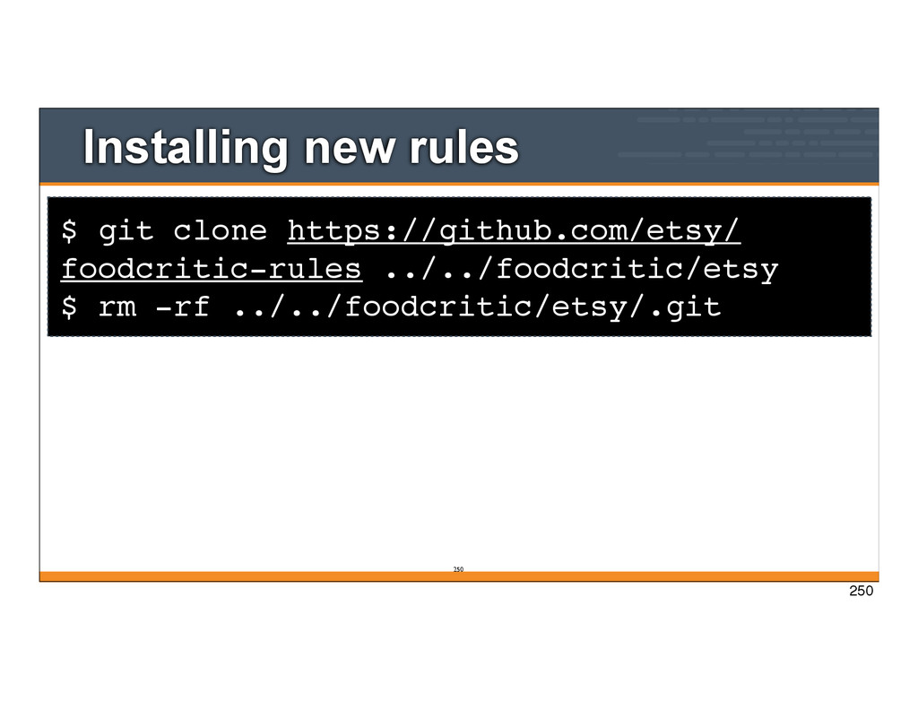 to check for issues that caused production outages/ performance degradation. • Good example for how to create your own custom rules • Documented here: https://github.com/etsy/foodcritic-rules 248