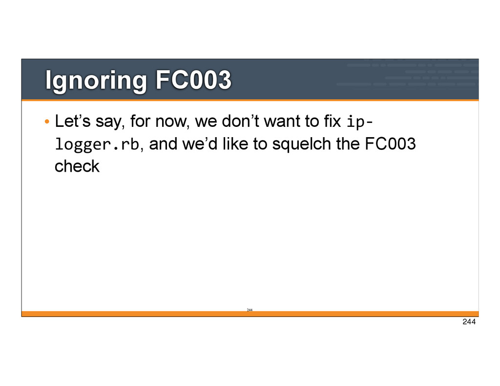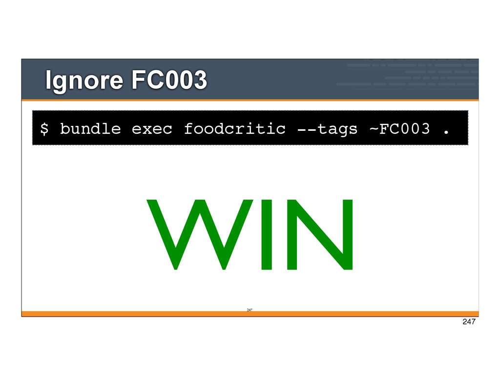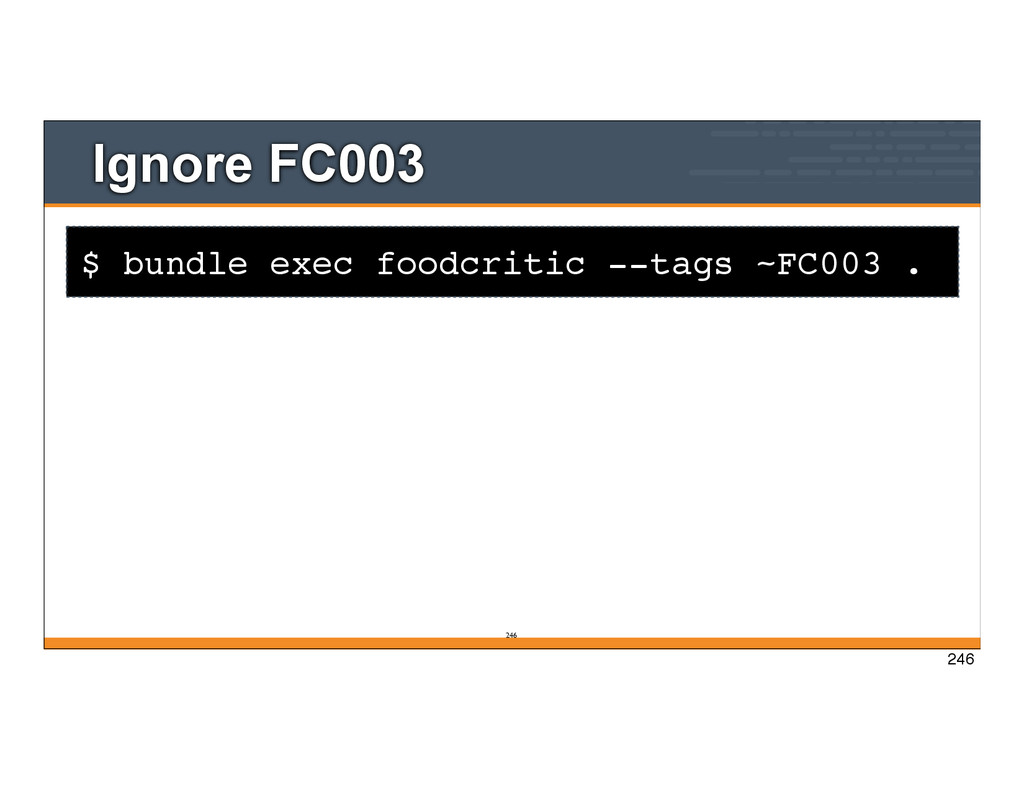 used to specify a list of rules for foodcritic to use •foodcritic -‐-‐tags FC001,FC002,FC008 • The tilde (~) modifier can be used to ignore specific rules •foodcritic -‐-‐tags ~FC003 245