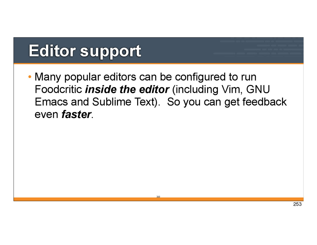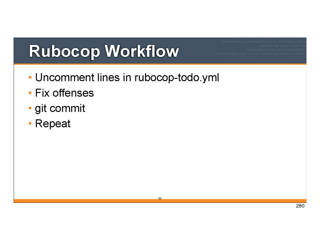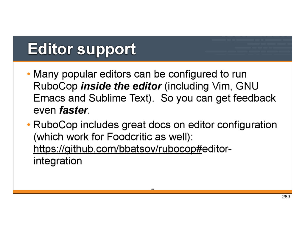 to run RuboCop inside the editor (including Vim, GNU Emacs and Sublime Text). So you can get feedback even faster. • RuboCop includes great docs on editor configuration (which work for Foodcritic as well): https://github.com/bbatsov/rubocop#editor- integration 283
