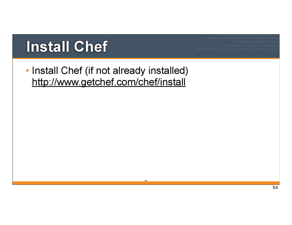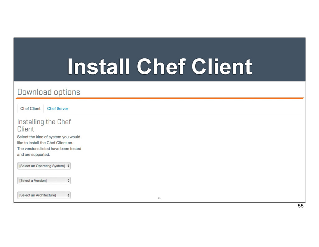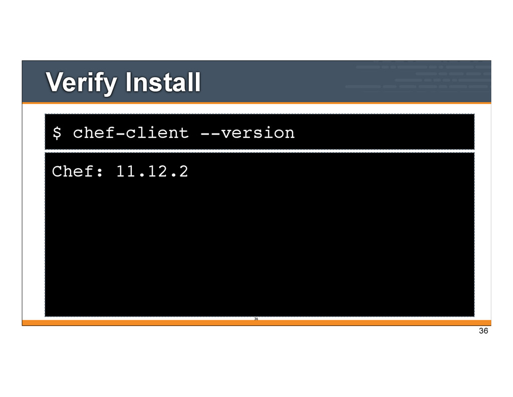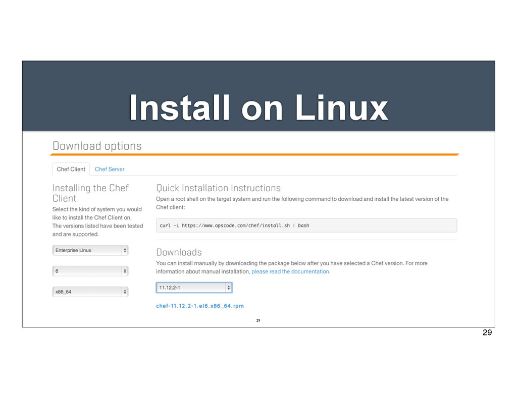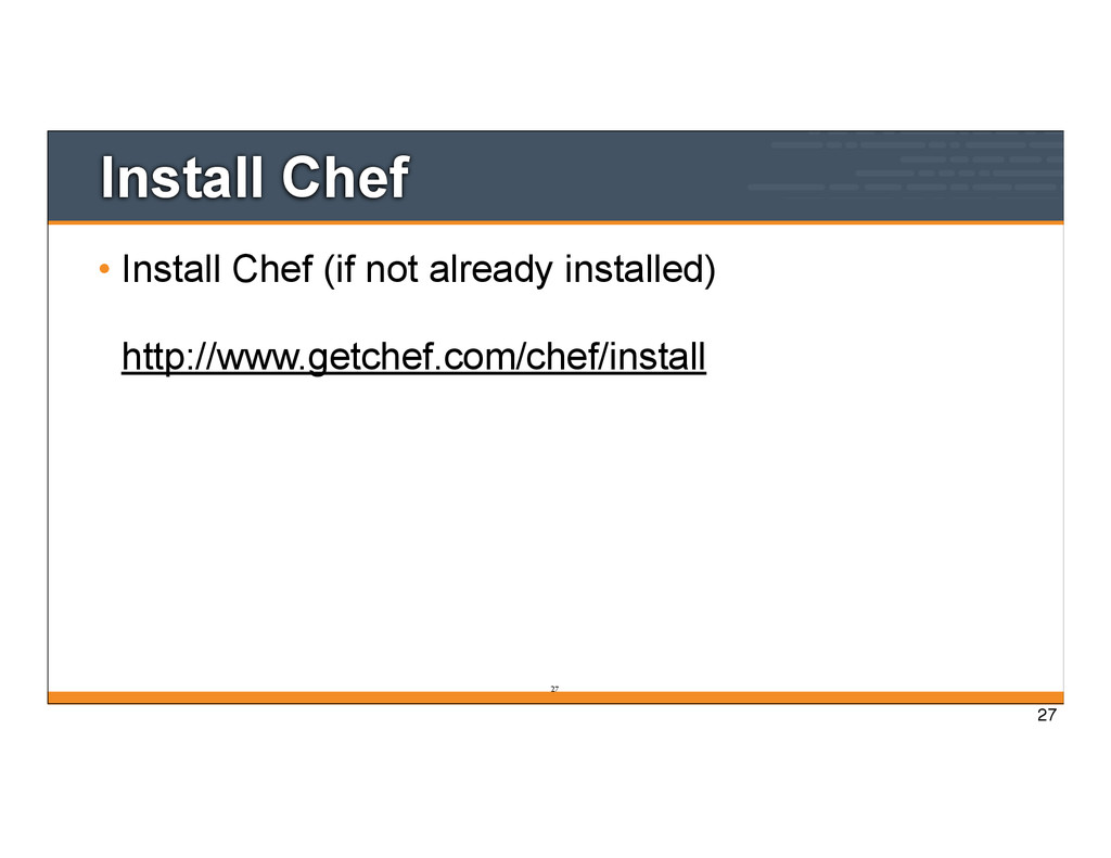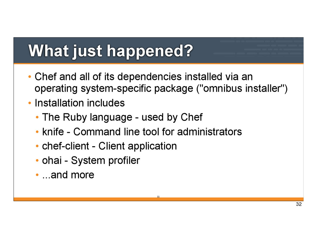 installed via an operating system-specific package ("omnibus installer") • Installation includes • The Ruby language - used by Chef • knife - Command line tool for administrators • chef-client - Client application • ohai - System profiler • ...and more 32 32