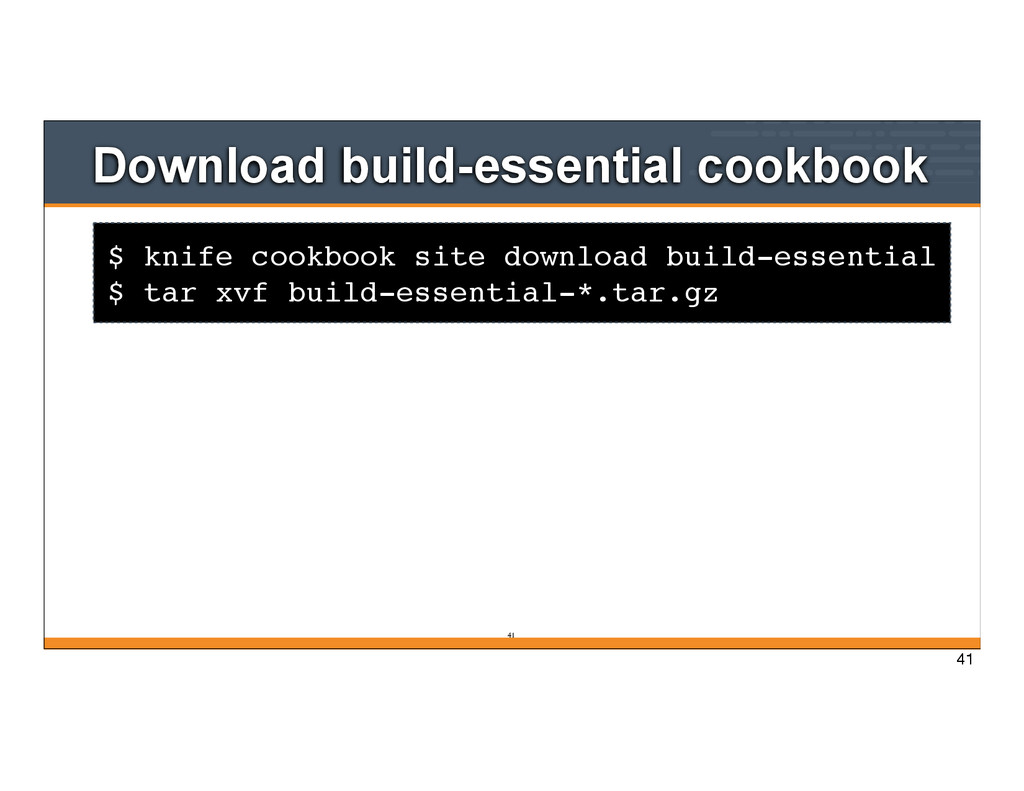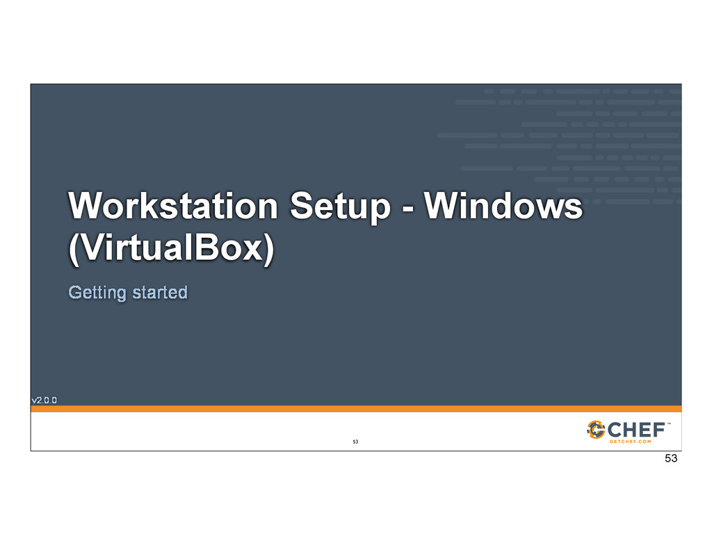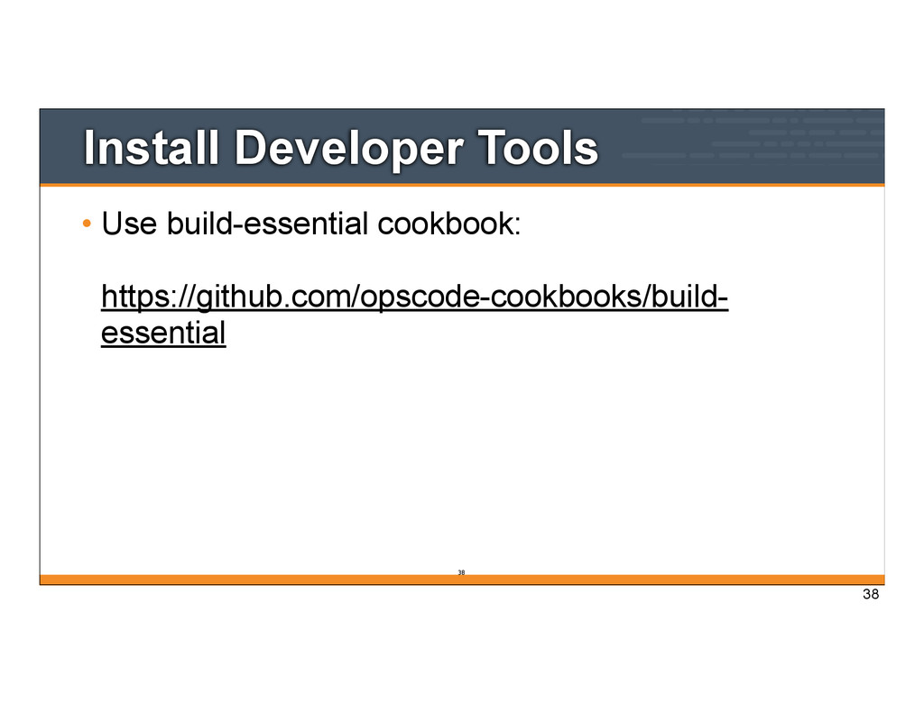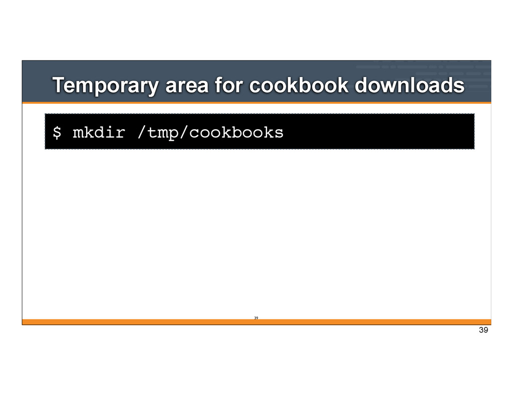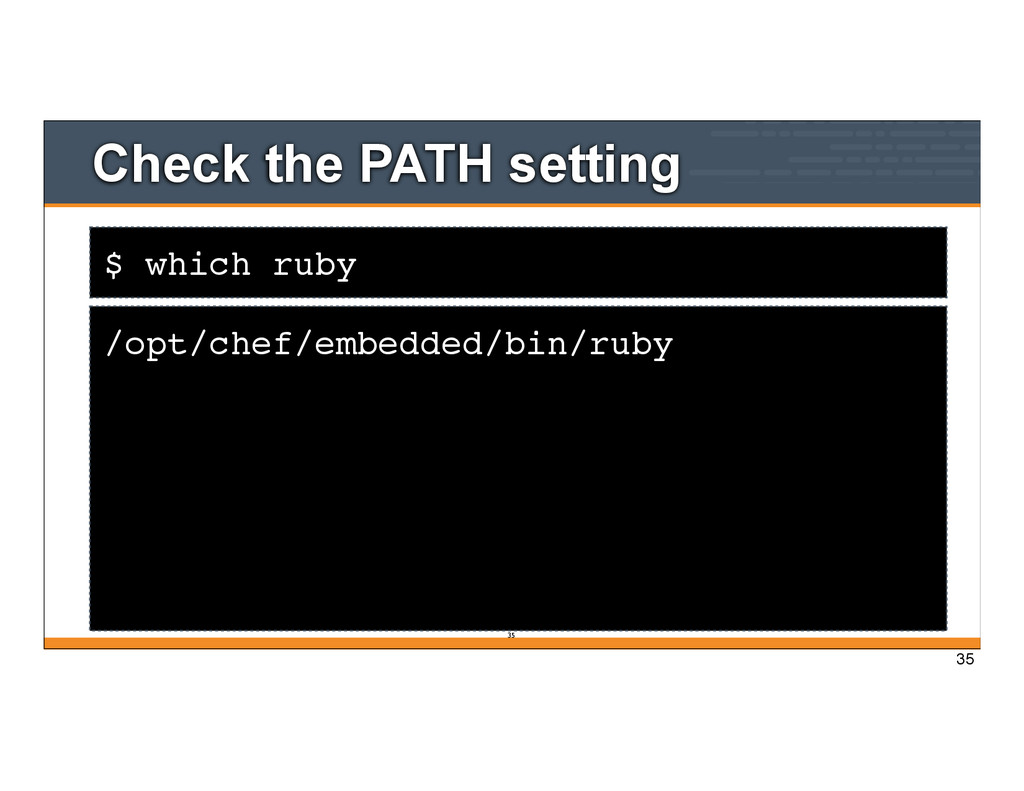 installed via an operating system-specific package ("omnibus installer") • Installation includes • The Ruby language - used by Chef • knife - Command line tool for administrators • chef-client - Client application • ohai - System profiler • ...and more 32 32