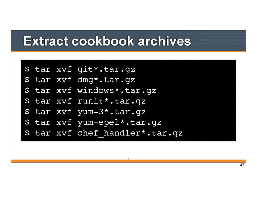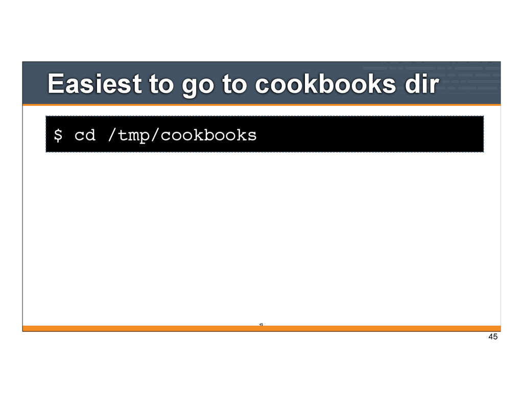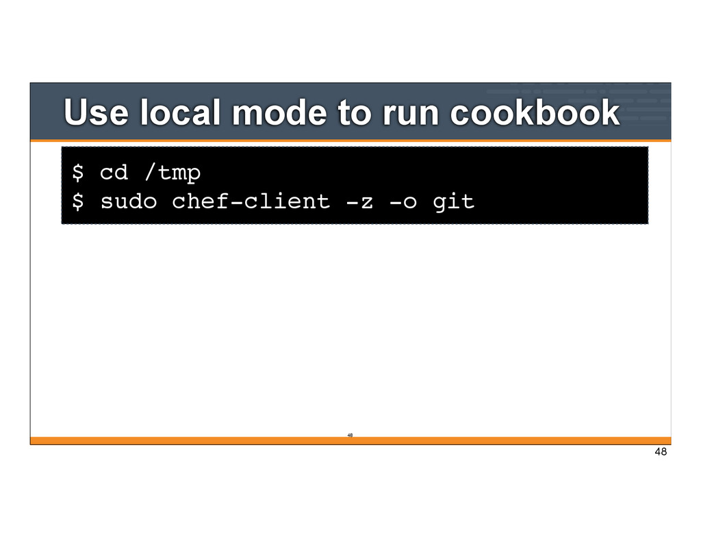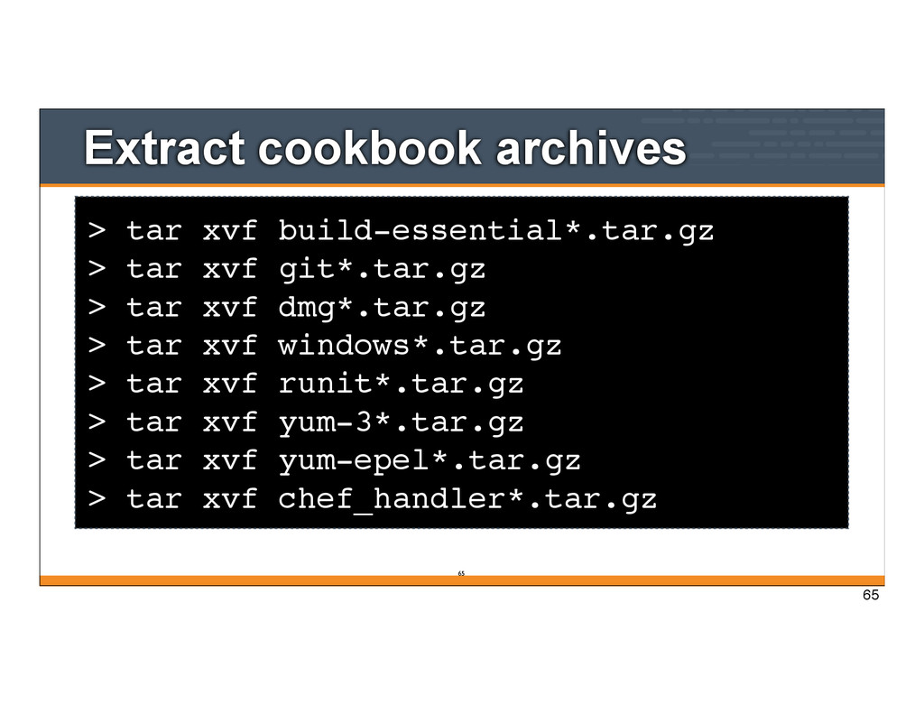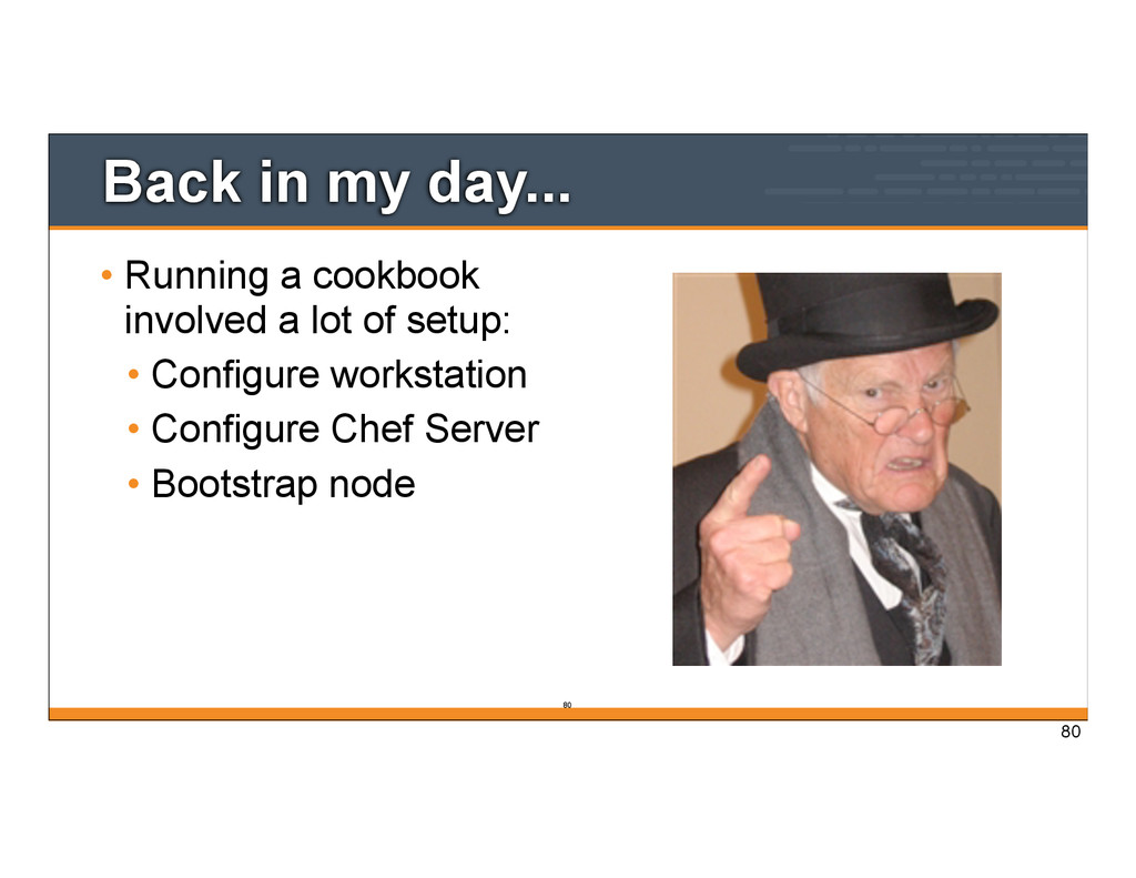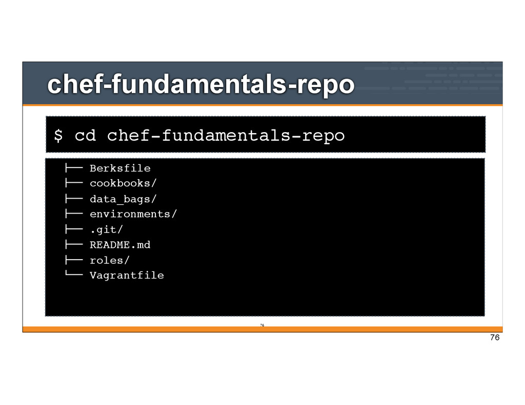 installed via an operating system-specific package ("omnibus installer") • Installation includes • The Ruby language - used by Chef • knife - Command line tool for administrators • chef-client - Client application • ohai - System profiler • ...and more 32 32
