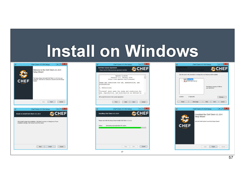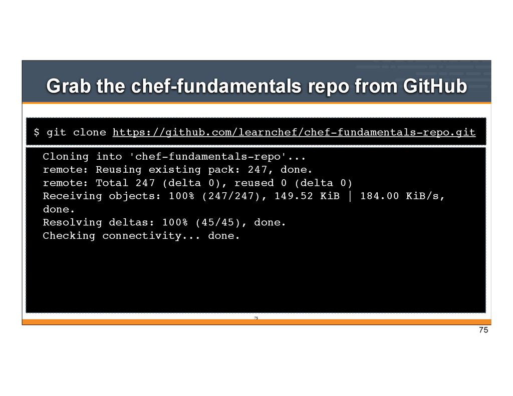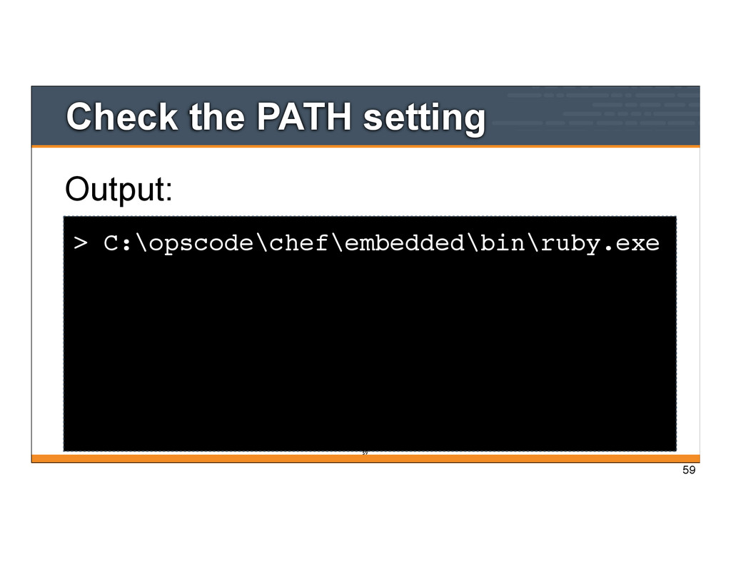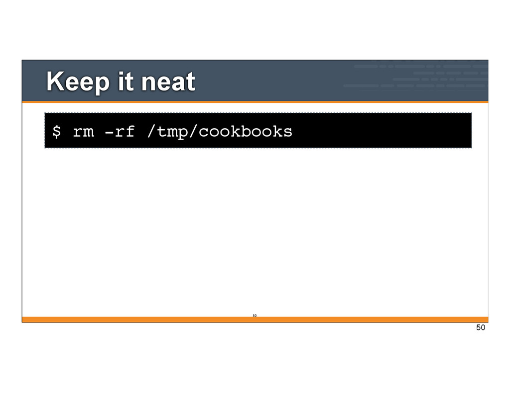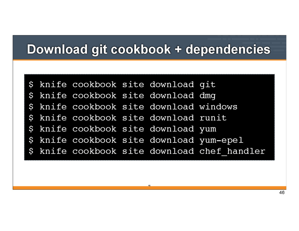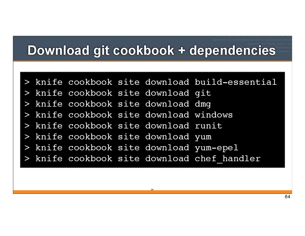 installed via an operating system-specific package ("omnibus installer") • Installation includes • The Ruby language - used by Chef • knife - Command line tool for administrators • chef-client - Client application • ohai - System profiler • ...and more 32 32