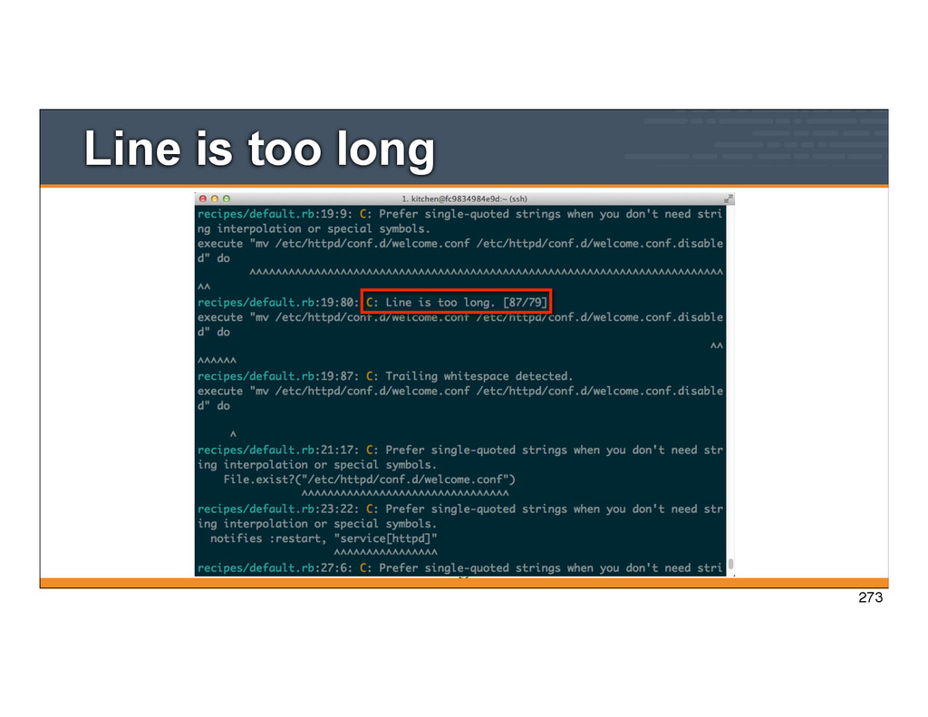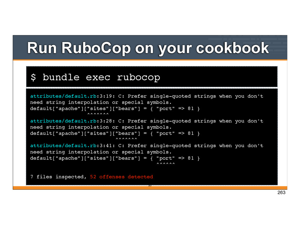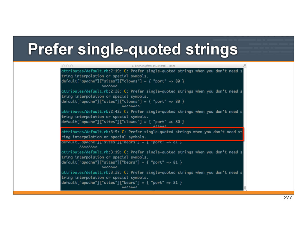 single-quoted strings when you don't need string interpolation or special symbols. default["apache"]["sites"]["bears"] = { "port" => 81 } ^^^^^^^ attributes/default.rb:3:41: C: Prefer single-quoted strings when you don't need string interpolation or special symbols. default["apache"]["sites"]["bears"] = { "port" => 81 } ^^^^^^ 7 files inspected, 52 offenses detected Created rubocop-todo.yml. Run `rubocop --config rubocop-todo.yml`, or add inherit_from: rubocop-todo.yml in a .rubocop.yml file. 265 265