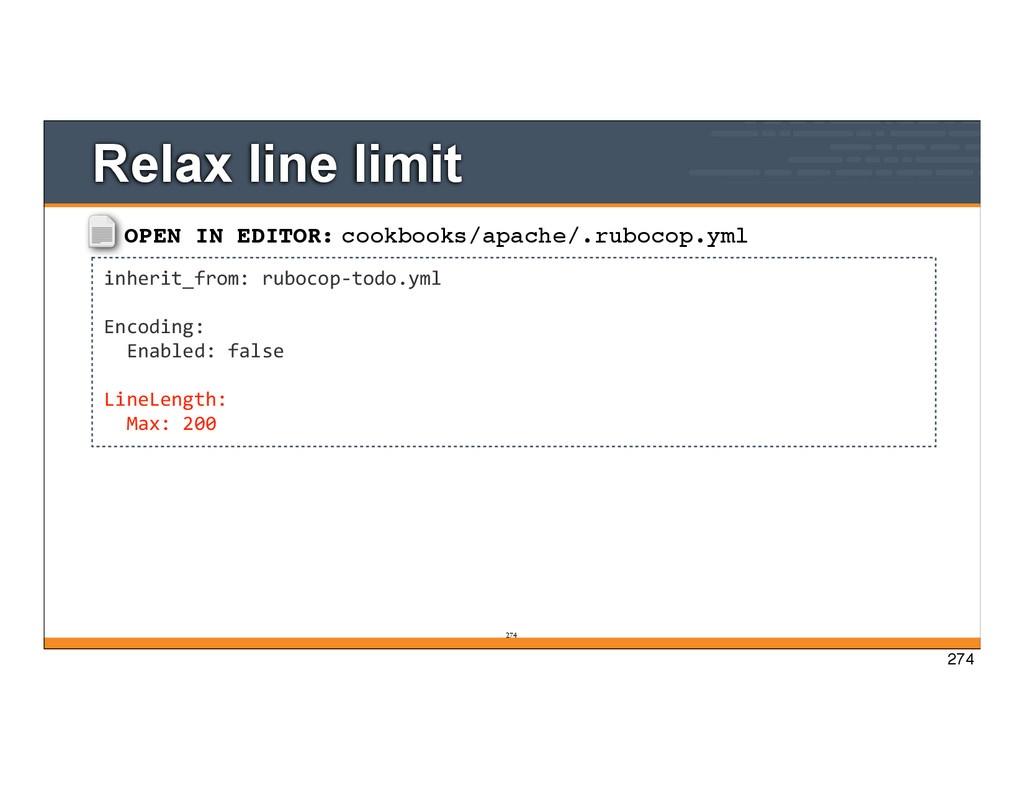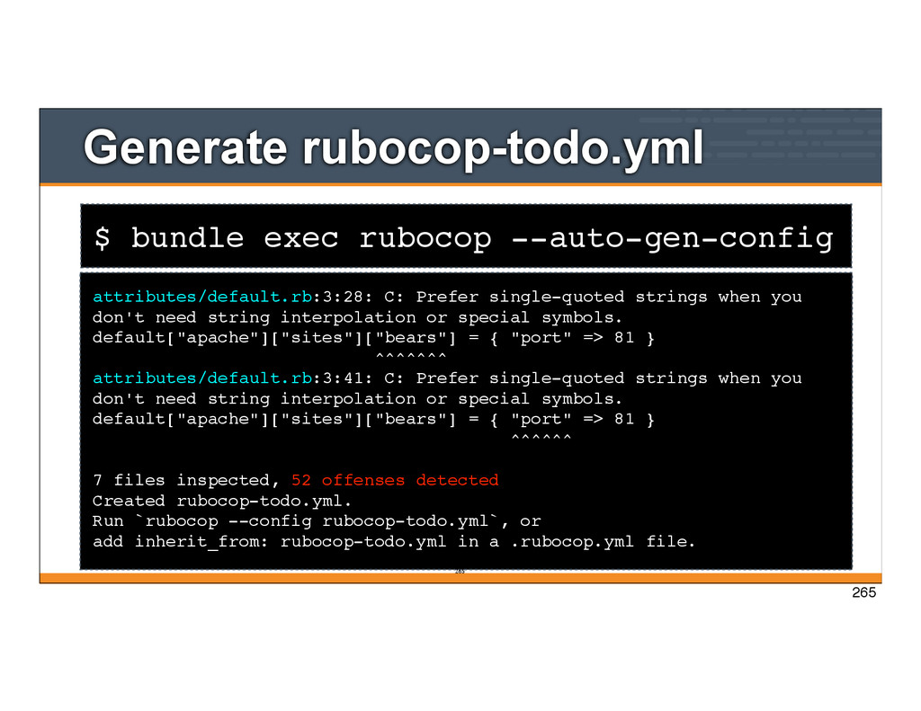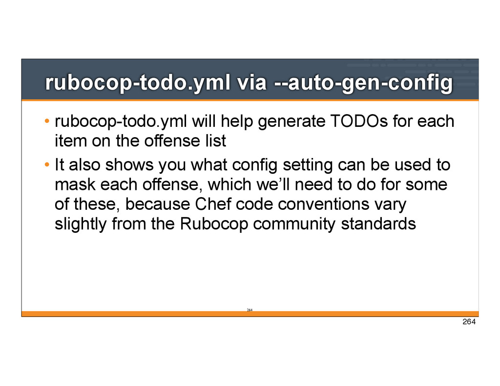 each item on the offense list • It also shows you what config setting can be used to mask each offense, which we’ll need to do for some of these, because Chef code conventions vary slightly from the Rubocop community standards 264 264