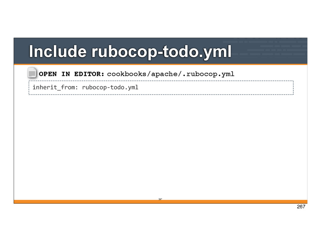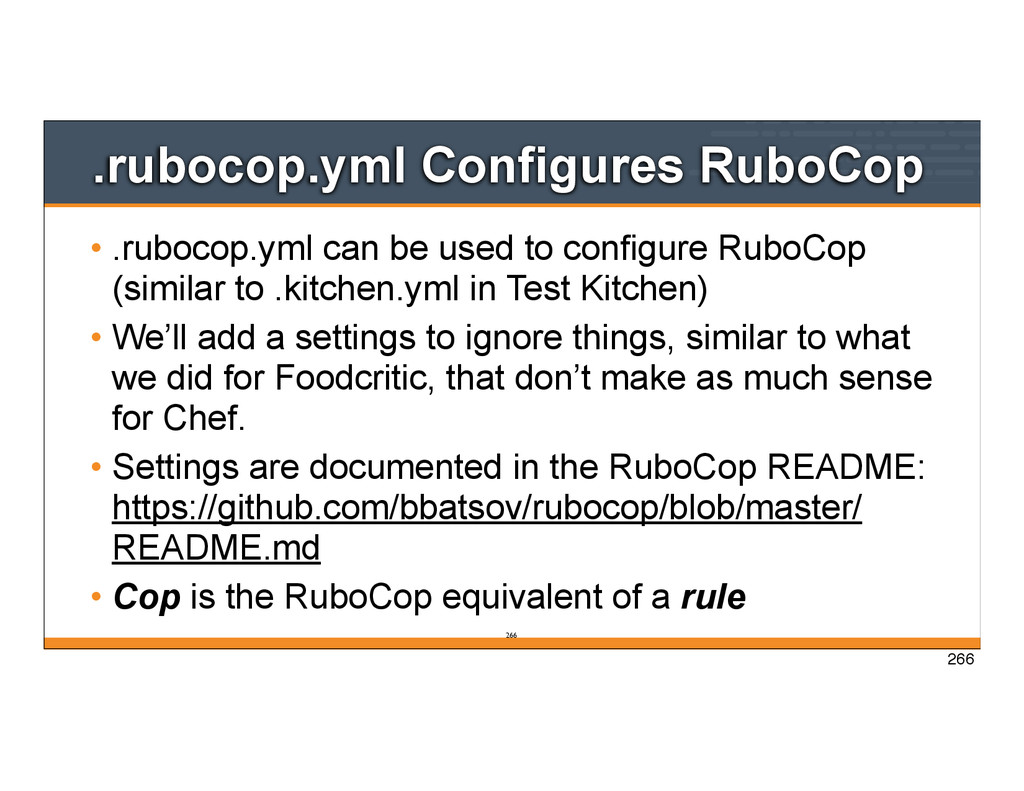 RuboCop (similar to .kitchen.yml in Test Kitchen) • We’ll add a settings to ignore things, similar to what we did for Foodcritic, that don’t make as much sense for Chef. • Settings are documented in the RuboCop README: https://github.com/bbatsov/rubocop/blob/master/ README.md • Cop is the RuboCop equivalent of a rule 266 266