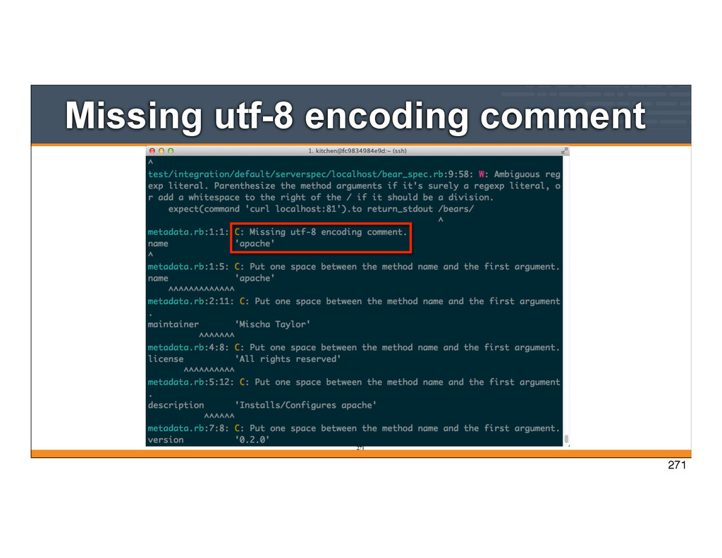 one space between the method name and the first argument. maintainer 'Mischa Taylor' ^^^^^^^ metadata.rb:4:8: C: Put one space between the method name and the first argument. license 'All rights reserved' ^^^^^^^^^^ metadata.rb:5:12: C: Put one space between the method name and the first argument. description 'Installs/Configures apache' ^^^^^^ metadata.rb:7:8: C: Put one space between the method name and the first argument. version '0.2.0' ^^^^^^^^^^ 7 files inspected, 11 offenses detected 279 279