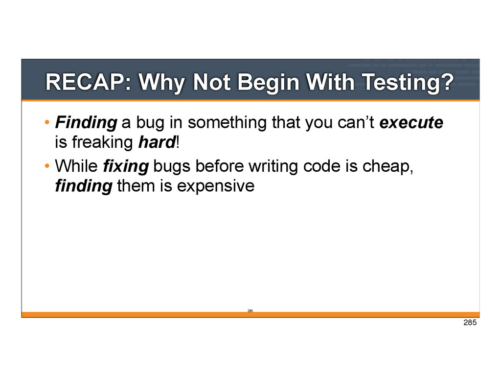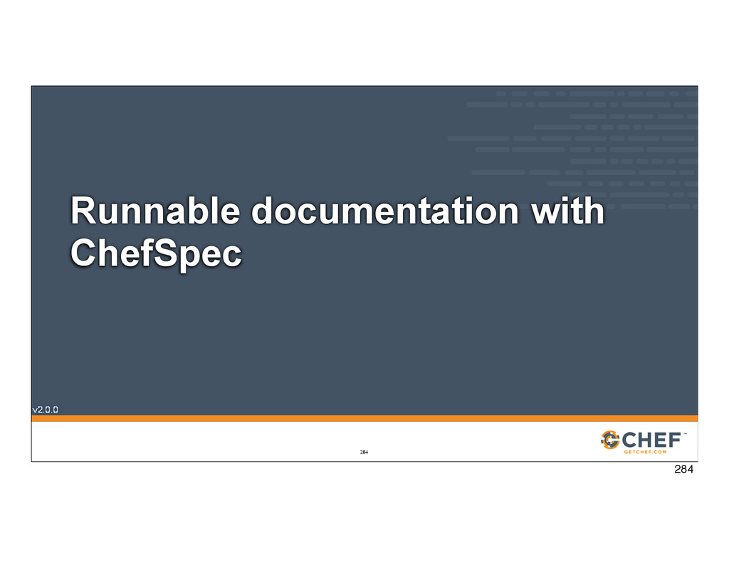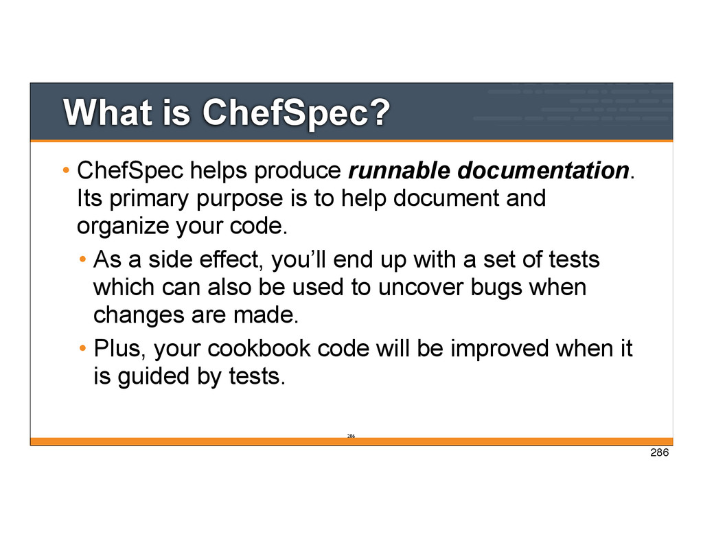 primary purpose is to help document and organize your code. • As a side effect, you’ll end up with a set of tests which can also be used to uncover bugs when changes are made. • Plus, your cookbook code will be improved when it is guided by tests. 286 286