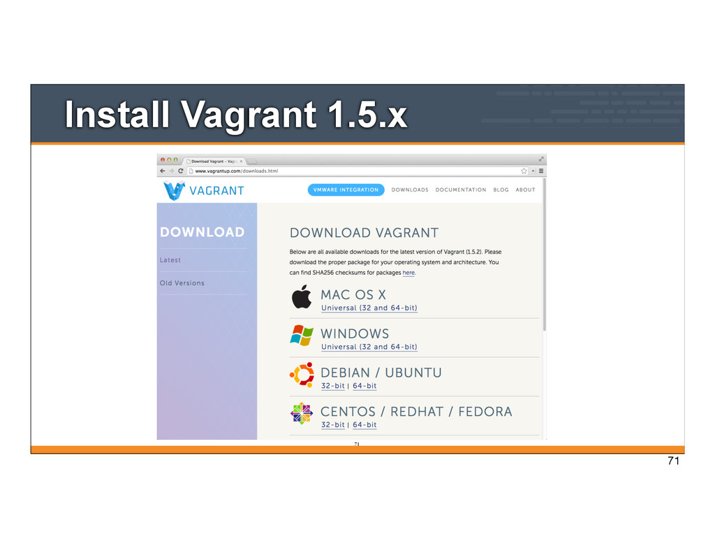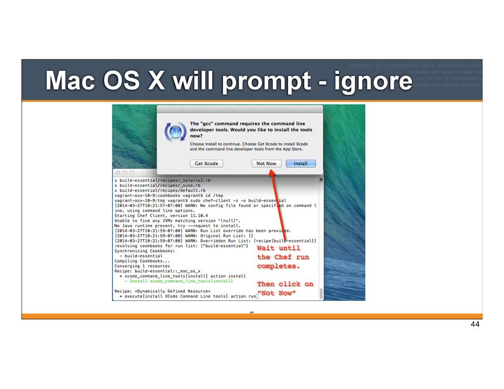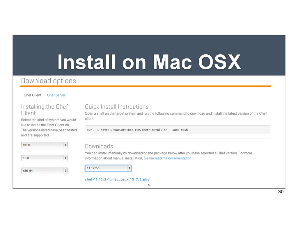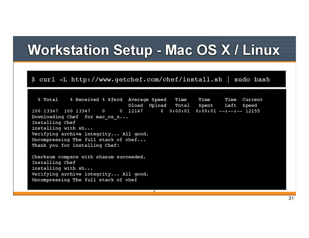 Mac OS X / Linux % Total % Received % Xferd Average Speed Time Time Time Current Dload Upload Total Spent Left Speed 100 13347 100 13347 0 0 12147 0 0:00:01 0:00:01 --:--:-- 12155 Downloading Chef for mac_os_x... Installing Chef installing with sh... Verifying archive integrity... All good. Uncompressing The full stack of chef... Thank you for installing Chef! Checksum compare with shasum succeeded. Installing Chef installing with sh... Verifying archive integrity... All good. Uncompressing The full stack of chef 31 31