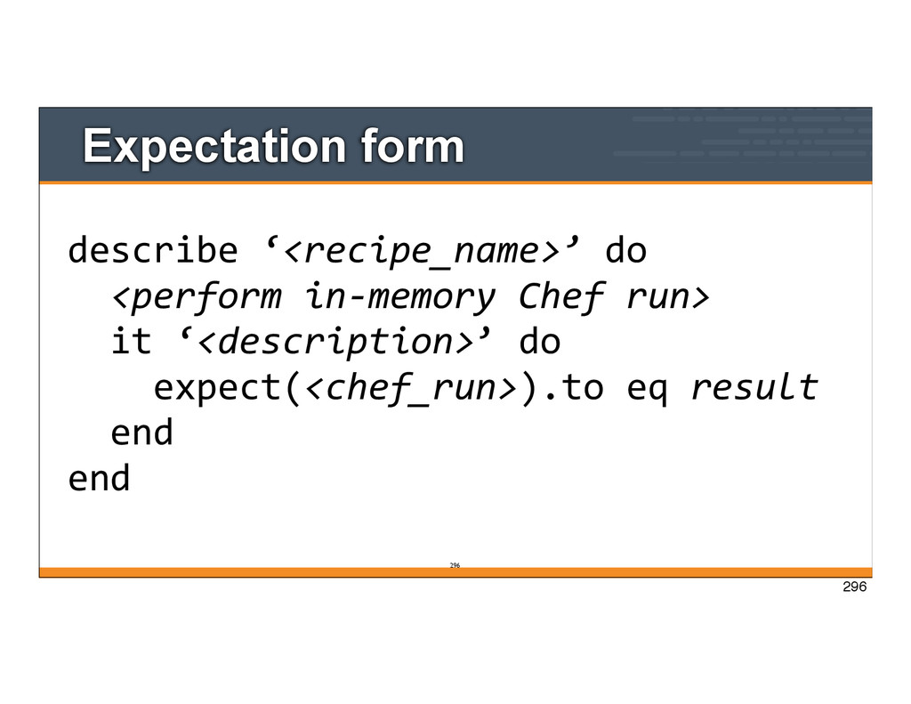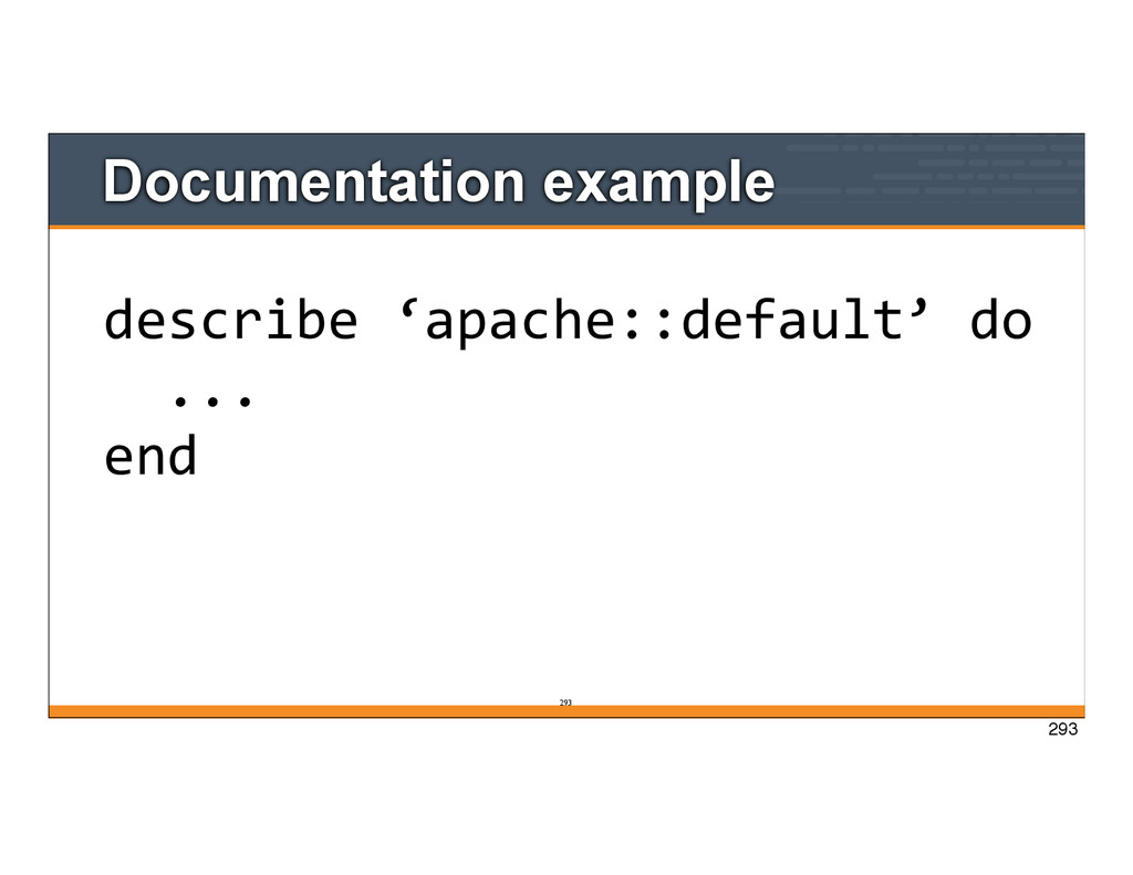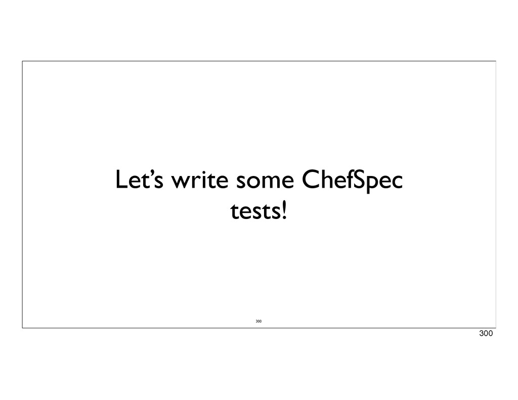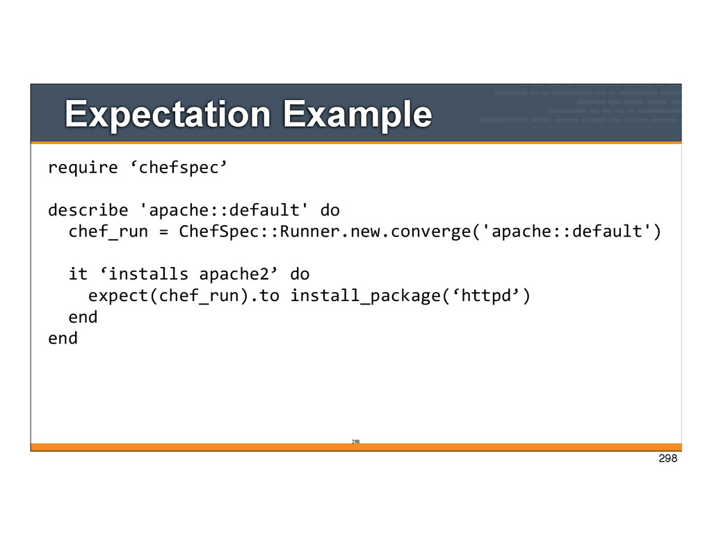 httpd package installation • It just verifies the cookbook syntax that it instructs Chef to install the package • Good enough for well-tested primitives like the package resource 299 299