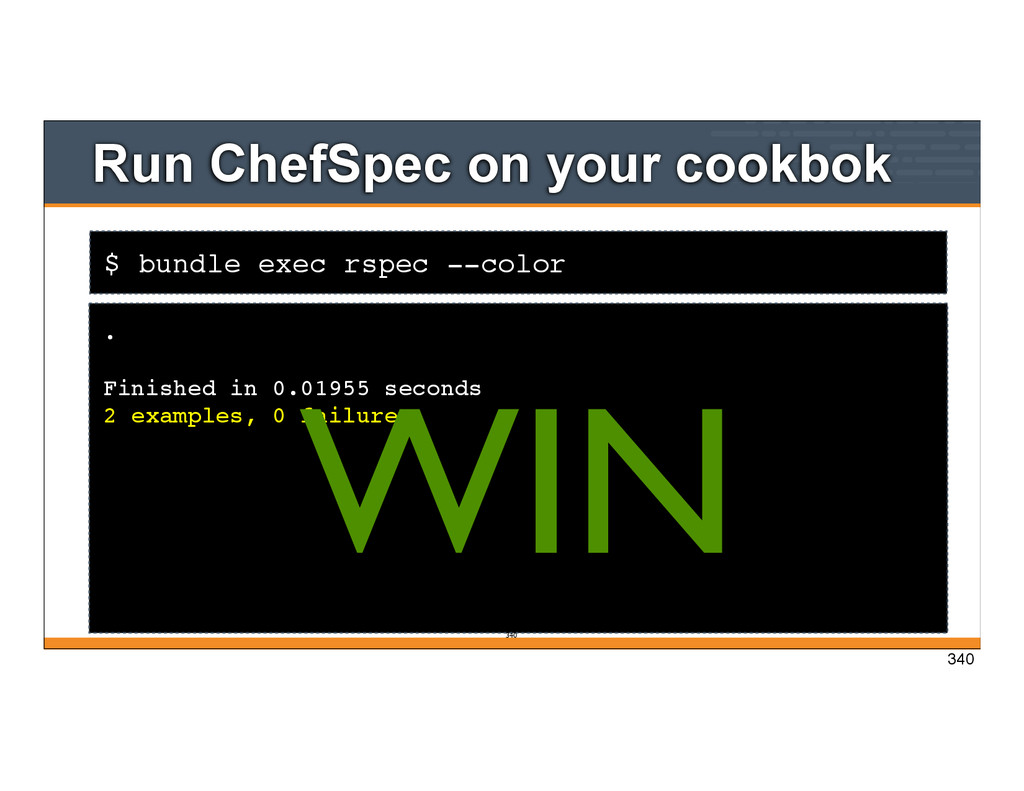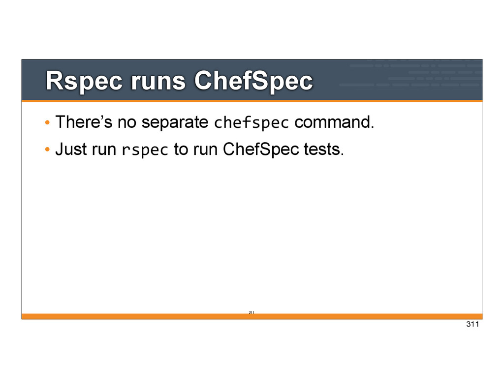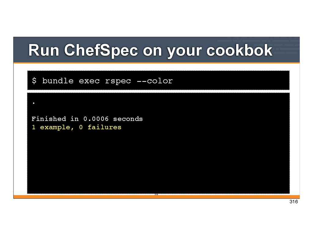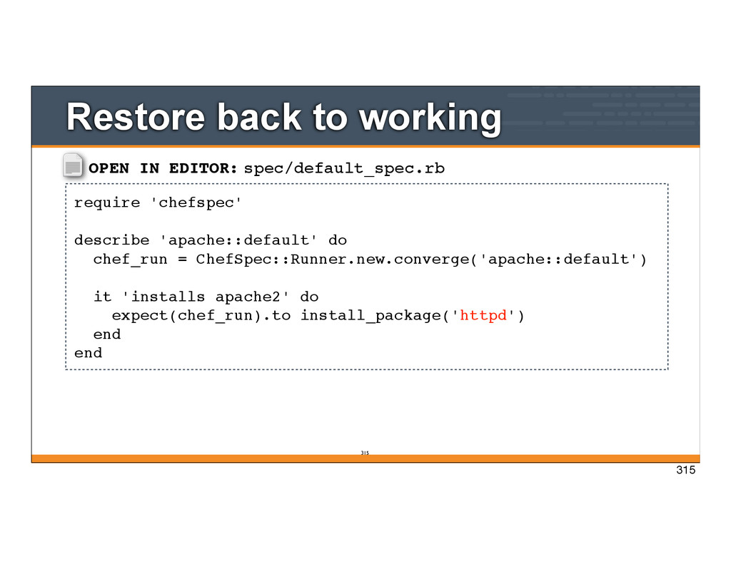 = ChefSpec::Runner.new.converge('apache::default') it 'installs apache2' do expect(chef_run).to install_package('httpd') end end Restore back to working 315 315