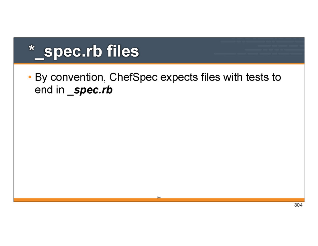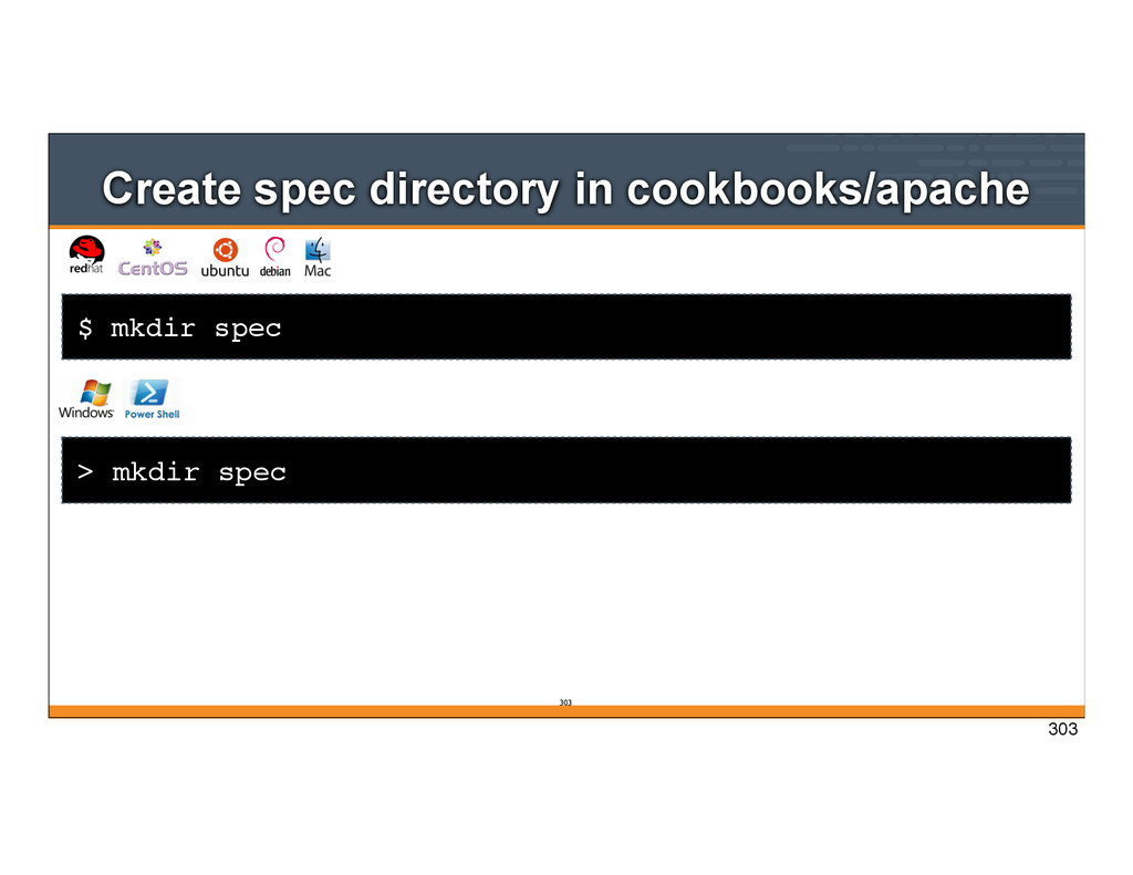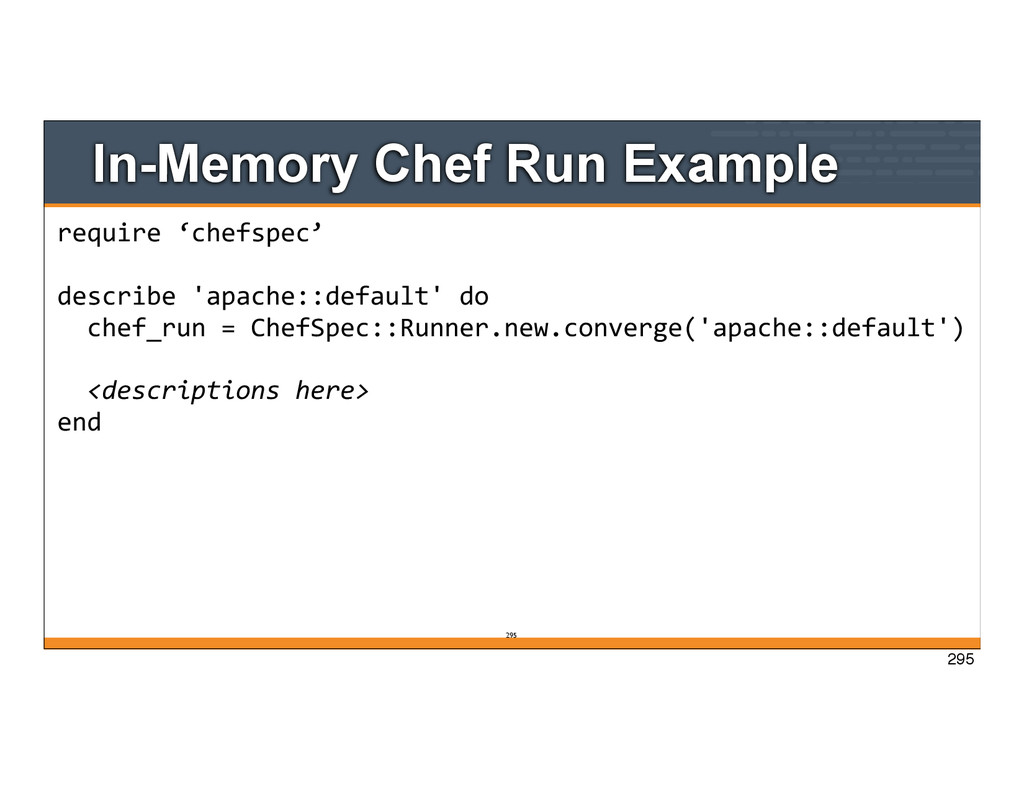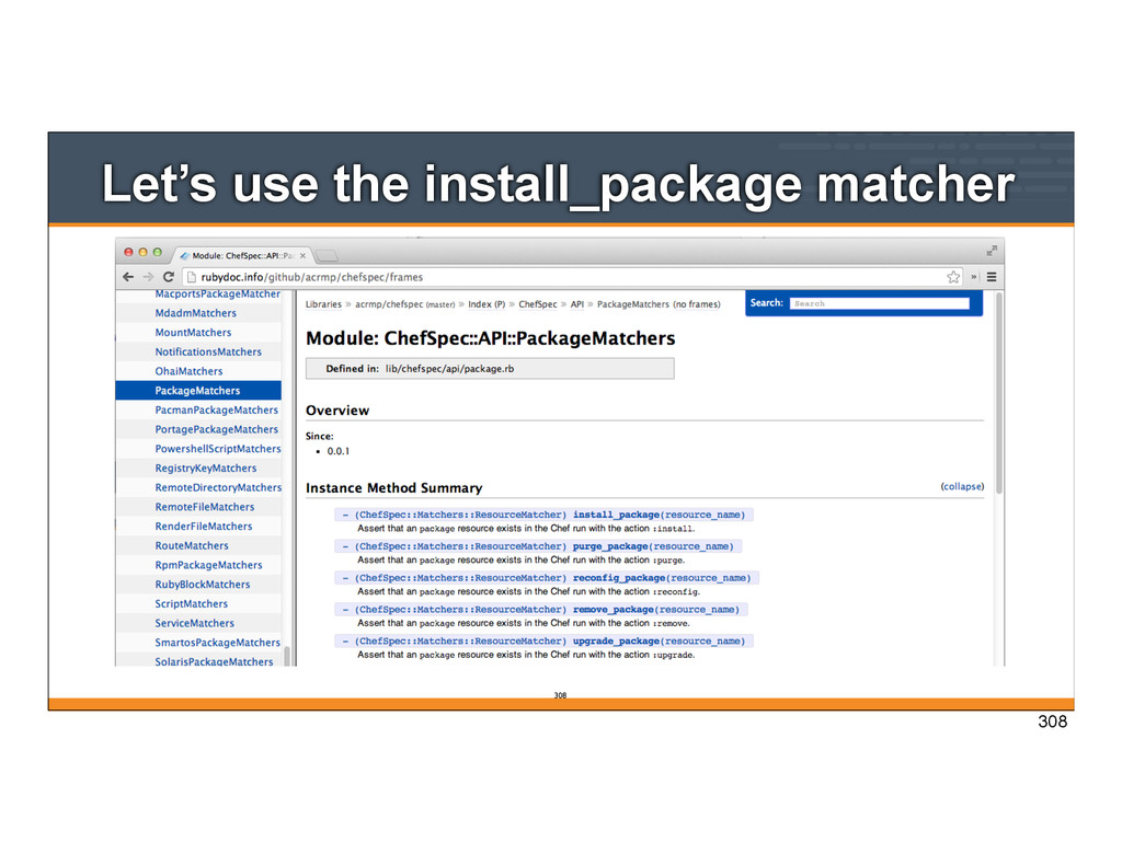 = ChefSpec::Runner.new.converge('apache::default') it 'installs apache2' do expect(chef_run).to install_package('httpd') end end Restore back to working 315 315