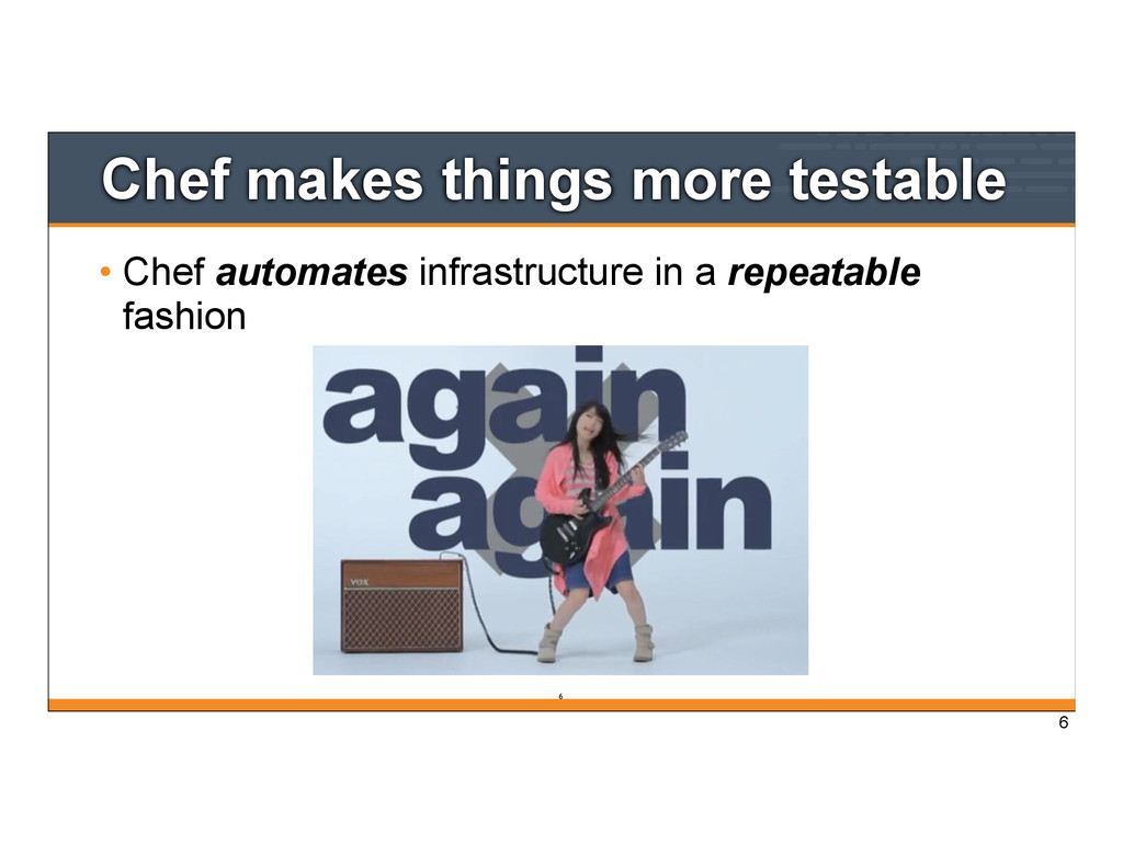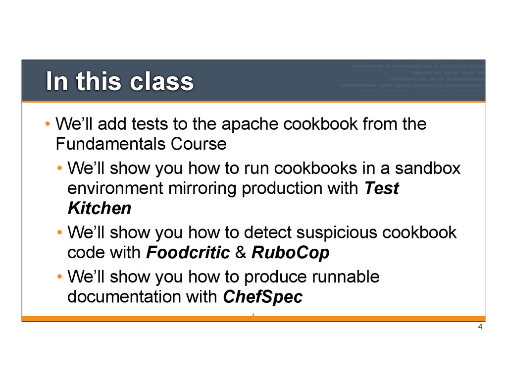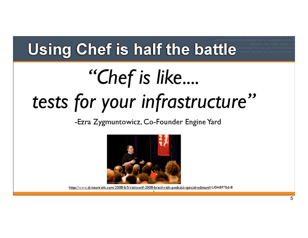 cookbook from the Fundamentals Course • We’ll show you how to run cookbooks in a sandbox environment mirroring production with Test Kitchen • We’ll show you how to detect suspicious cookbook code with Foodcritic & RuboCop • We’ll show you how to produce runnable documentation with ChefSpec 4 4