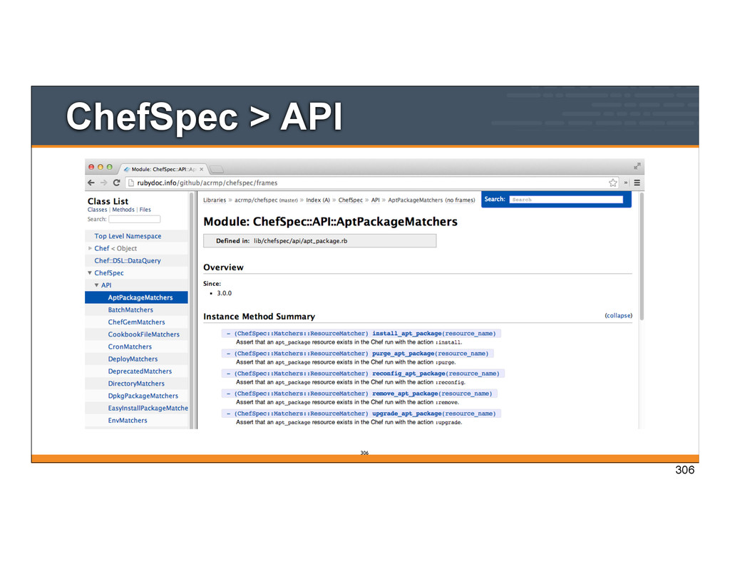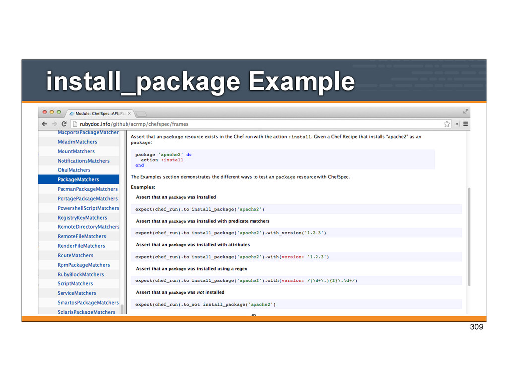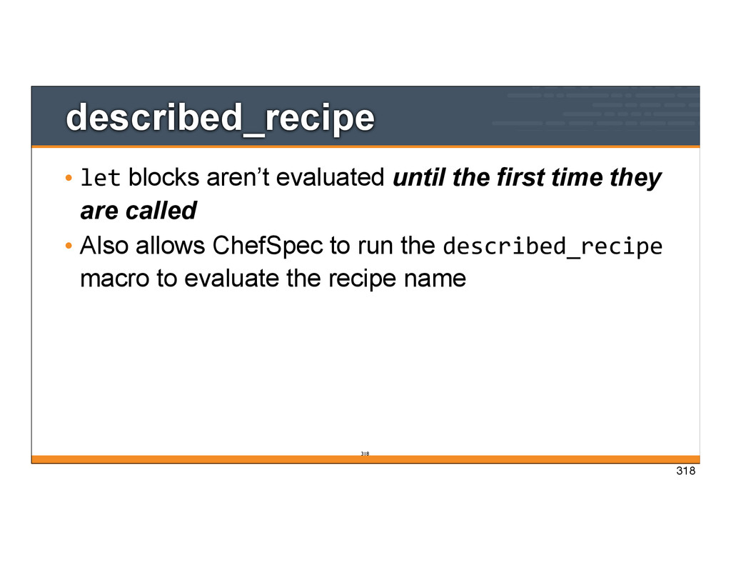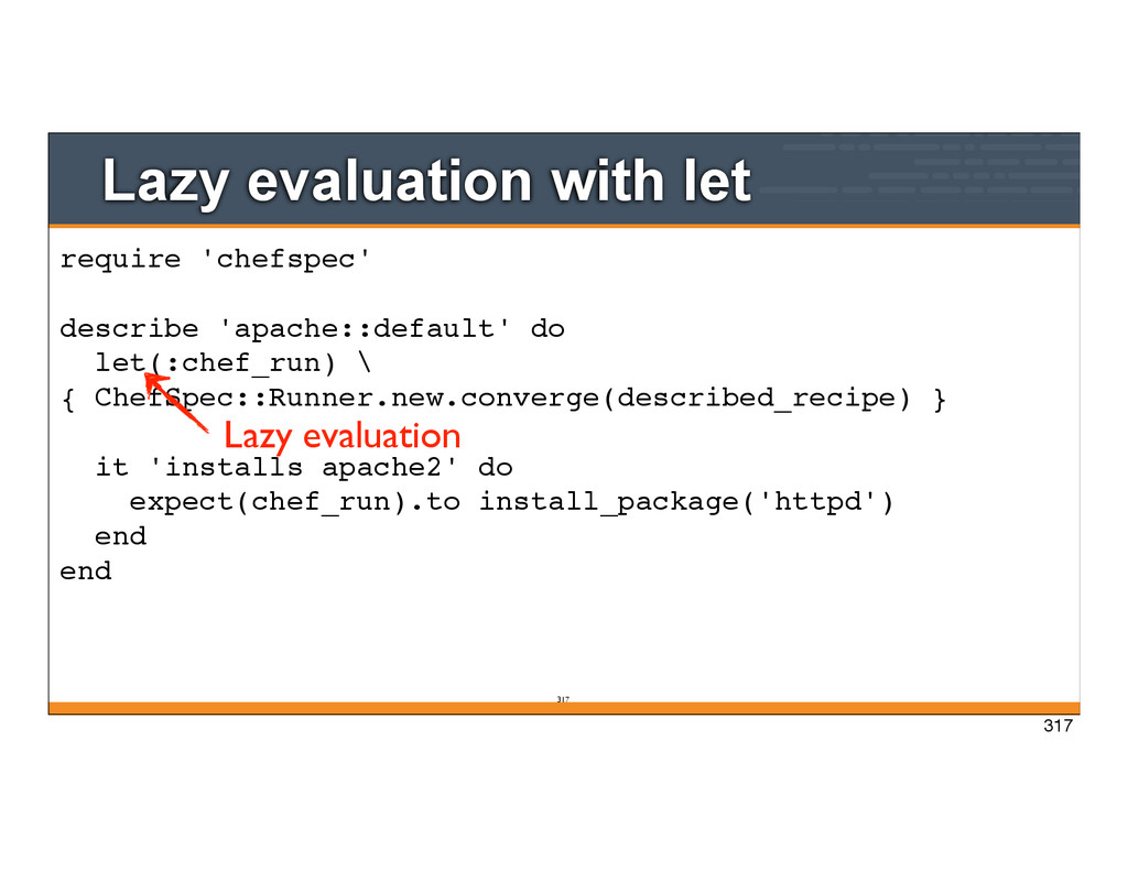 let(:chef_run) \ { ChefSpec::Runner.new.converge(described_recipe) } it 'installs apache2' do expect(chef_run).to install_package('httpd') end end Lazy evaluation 317