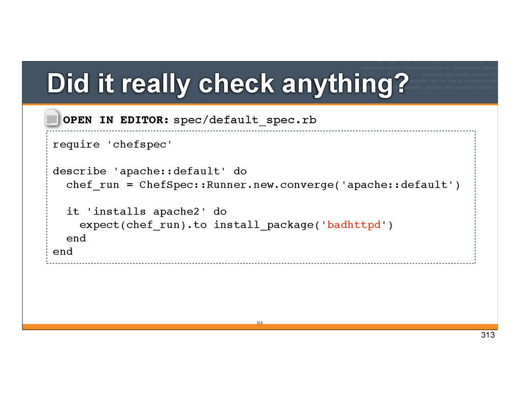 = ChefSpec::Runner.new.converge('apache::default') it 'installs apache2' do expect(chef_run).to install_package('badhttpd') end end Did it really check anything? 313 313